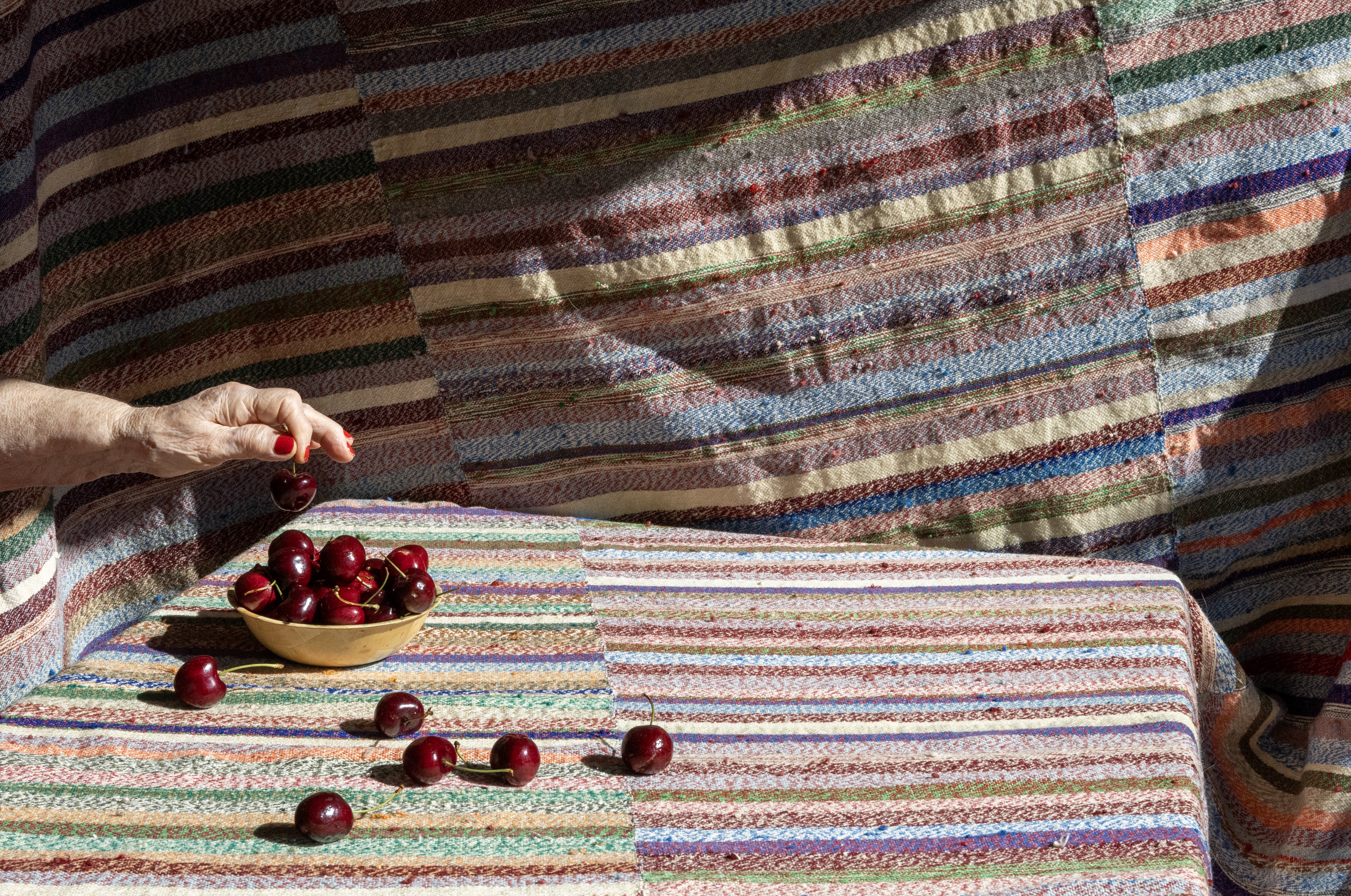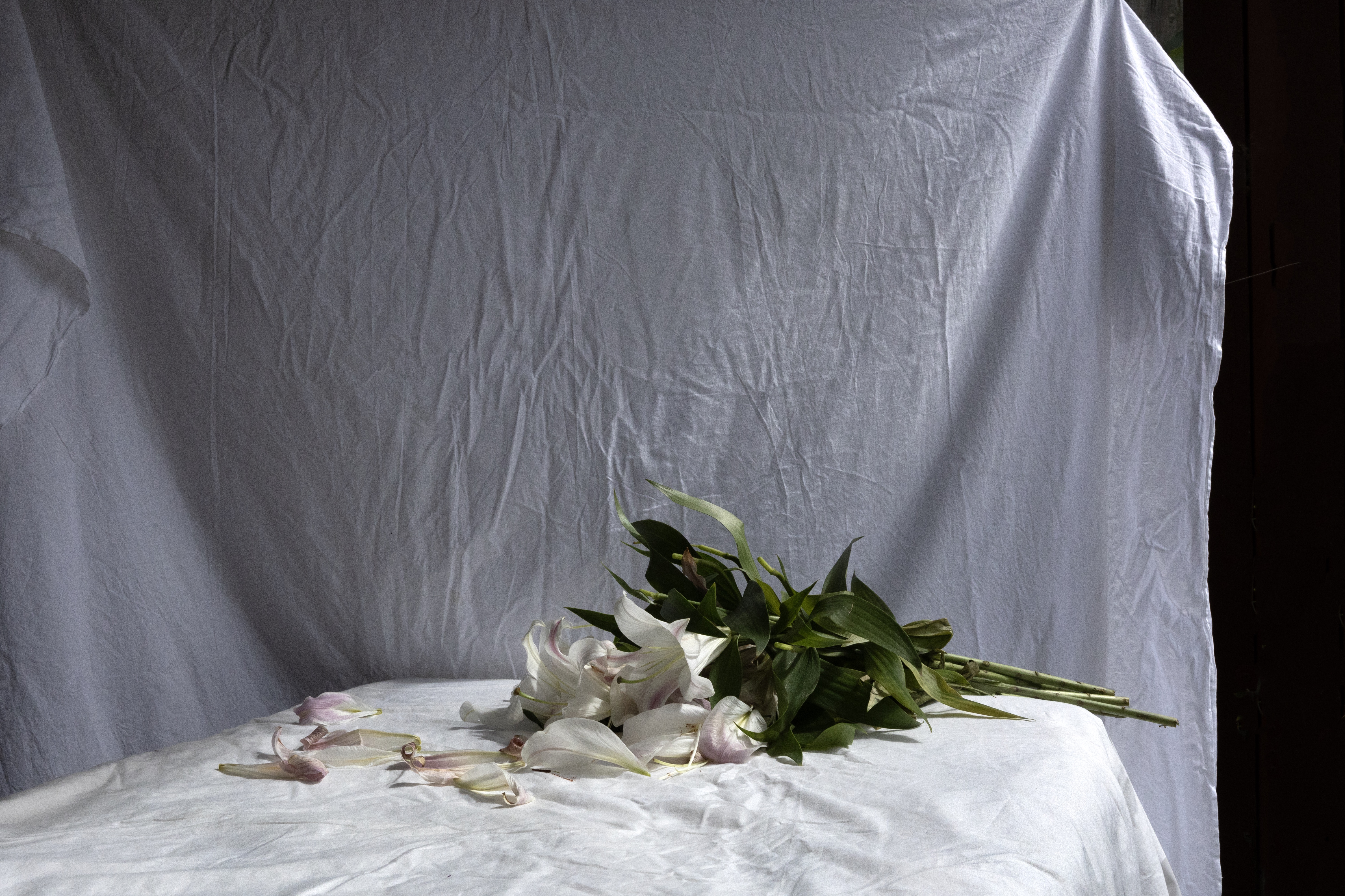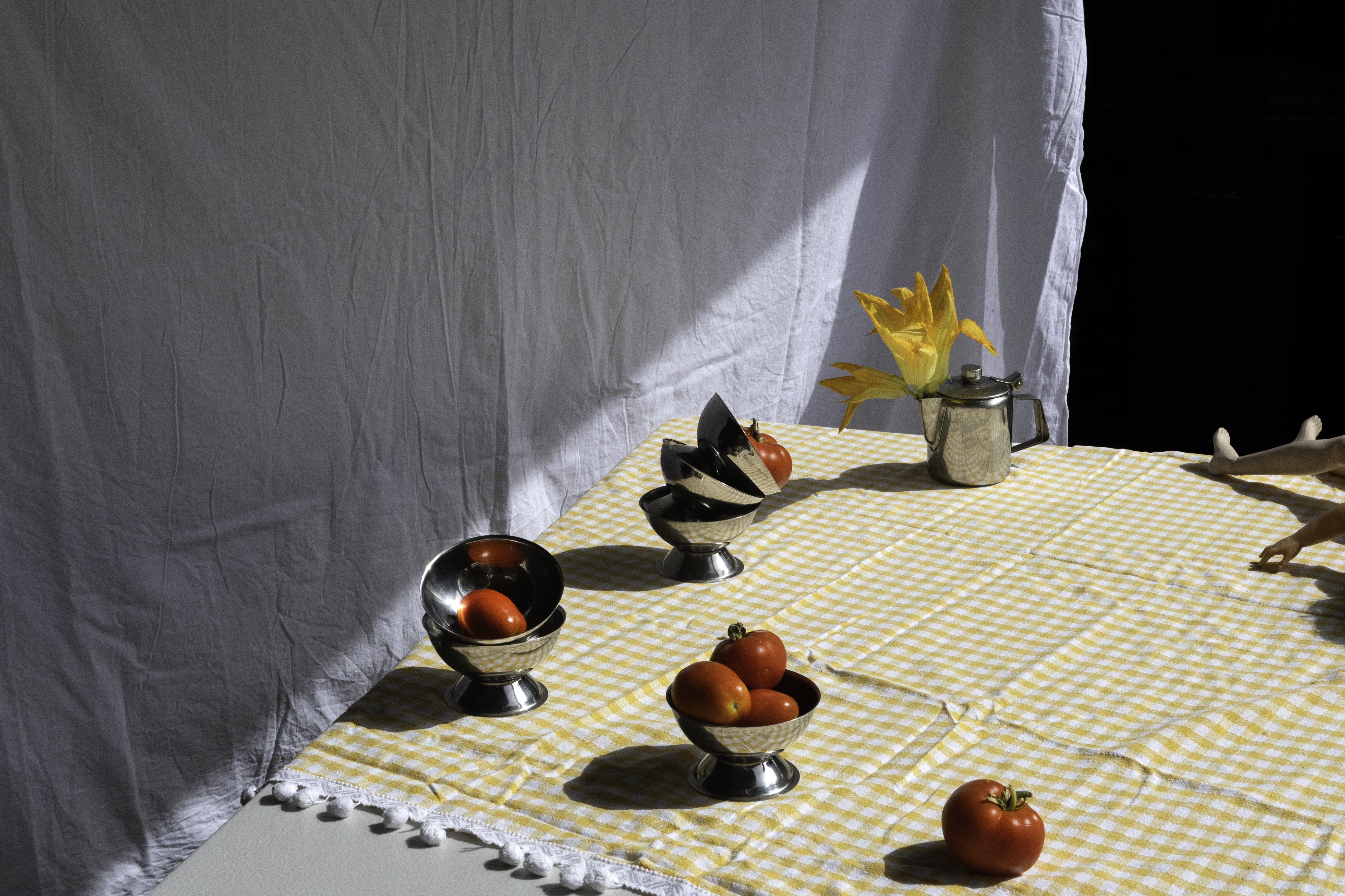 The photographs are made daily during her current visit, staged on a table in the backyard using natural morning light. Organic matter harvested from her mother’s garden that same day—flowers, fruit, vegetables—is incorporated into each composition, introducing temporality, decay, and care into the frame. This ritualized process becomes an act of quiet witnessing: a way to slow time, to archive what is at risk of disappearing, and to honor the domestic space as a site of memory, labor, and unresolved attachment.