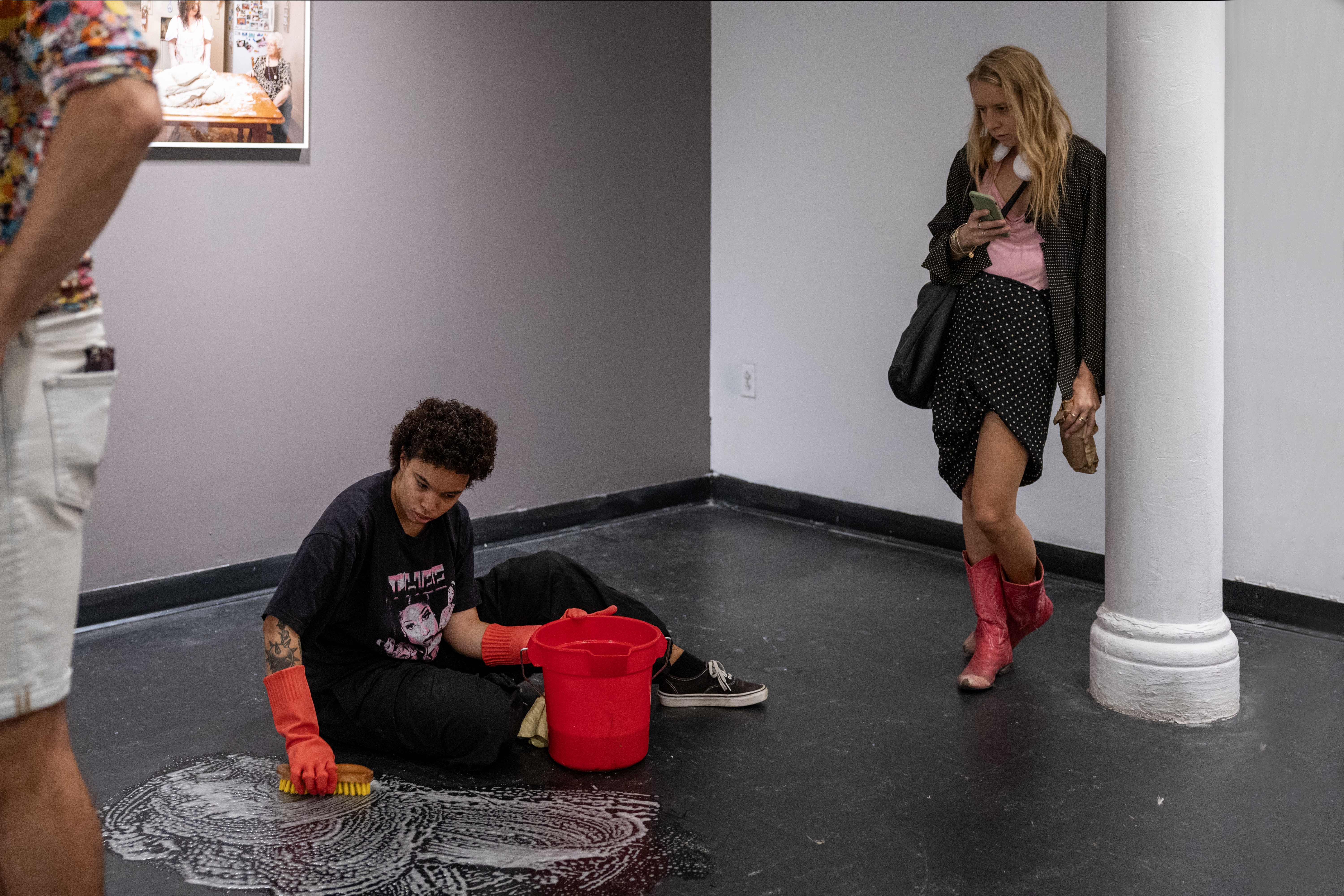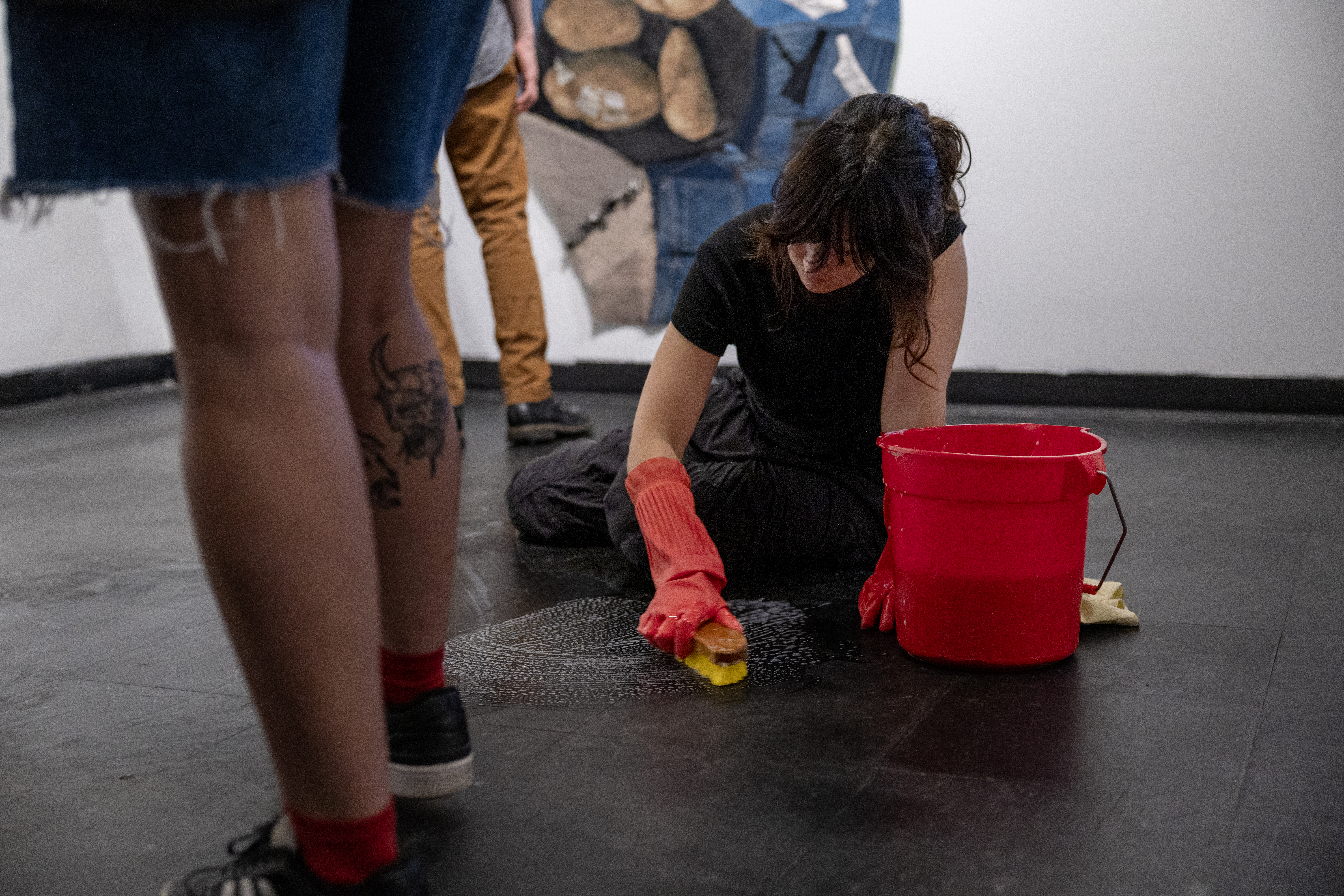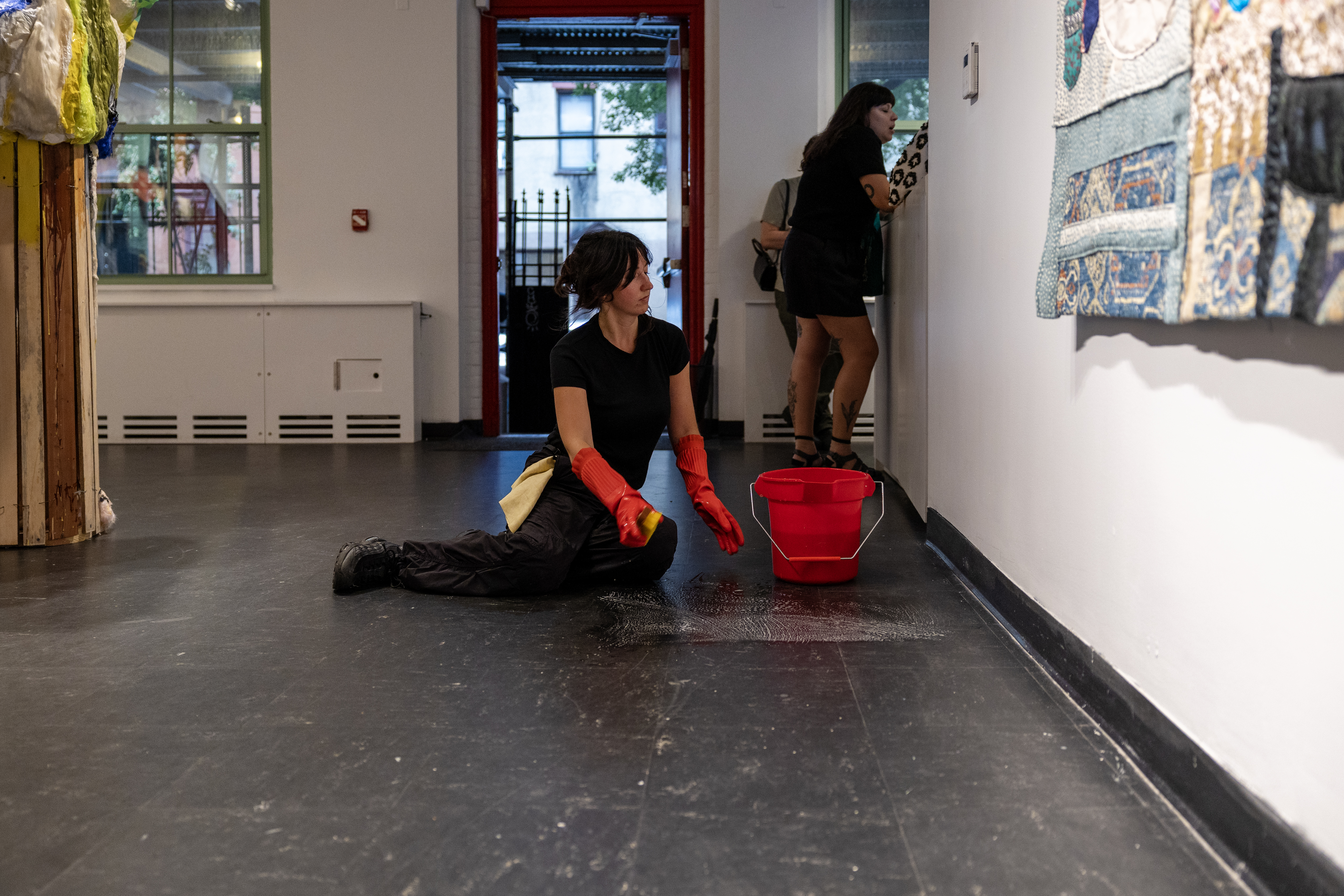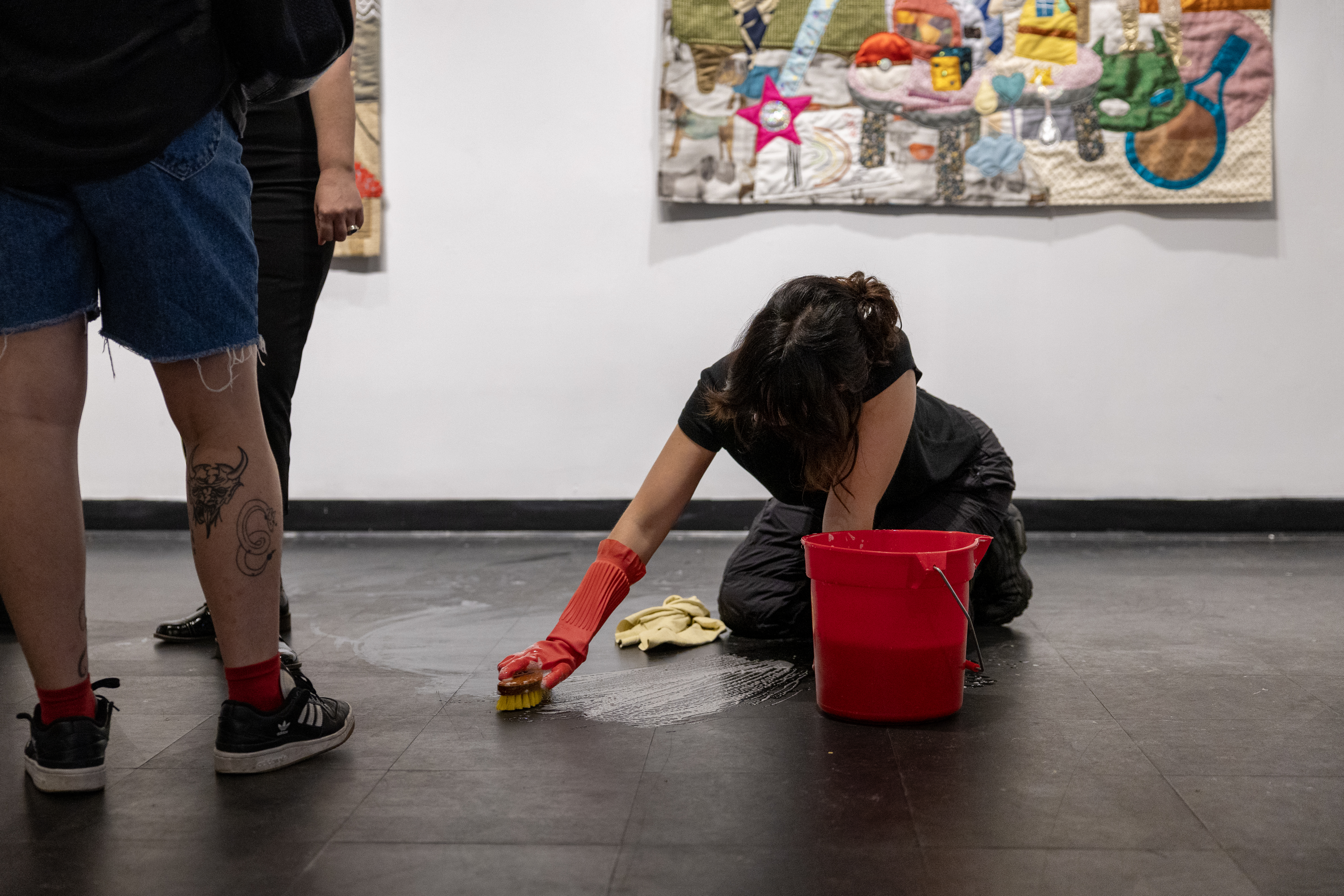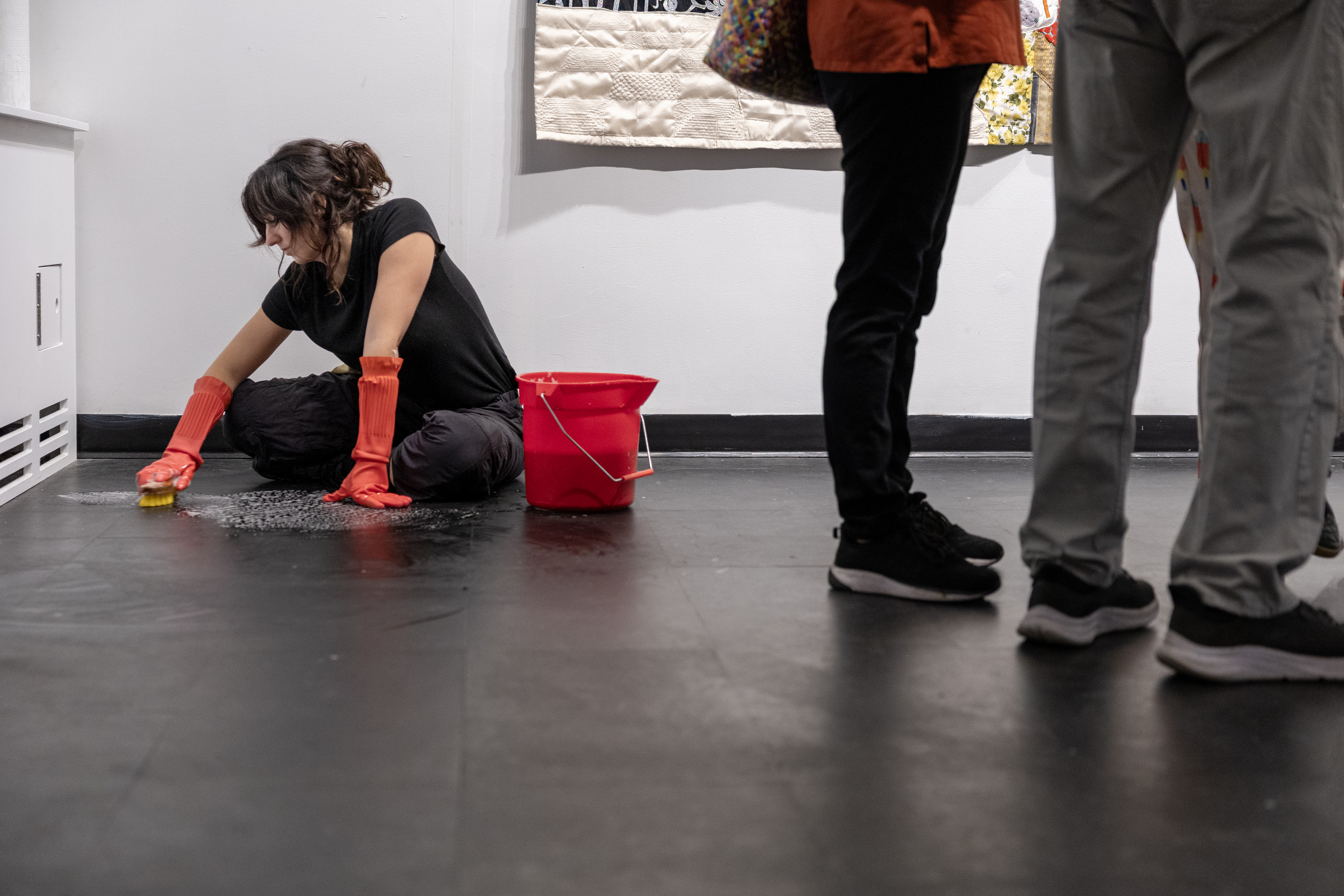 Performed during the opening of Thresholds: Reimagining Domesticity, Labor, and Identity at PS122 Gallery, this work featured two women on their hands and knees, scrubbing the gallery floor with a red bucket, red gloves, and brushes.Through this simple yet relentless act, the performance evoked the invisible, gendered labor passed down across generations—a gesture repeated endlessly in kitchens, hallways, and domestic spaces. Here, the act of cleaning was recontextualized: transformed from routine maintenance into a charged ritual, confronting viewers with the bodily toll of inherited expectations.The title underscores the tension between the intimate and the systemic, reminding us that each moment of labor is not isolated but part of a continuum. The performance asks: what roles do we inherit, and how might repetition become both a burden and a form of resilience?