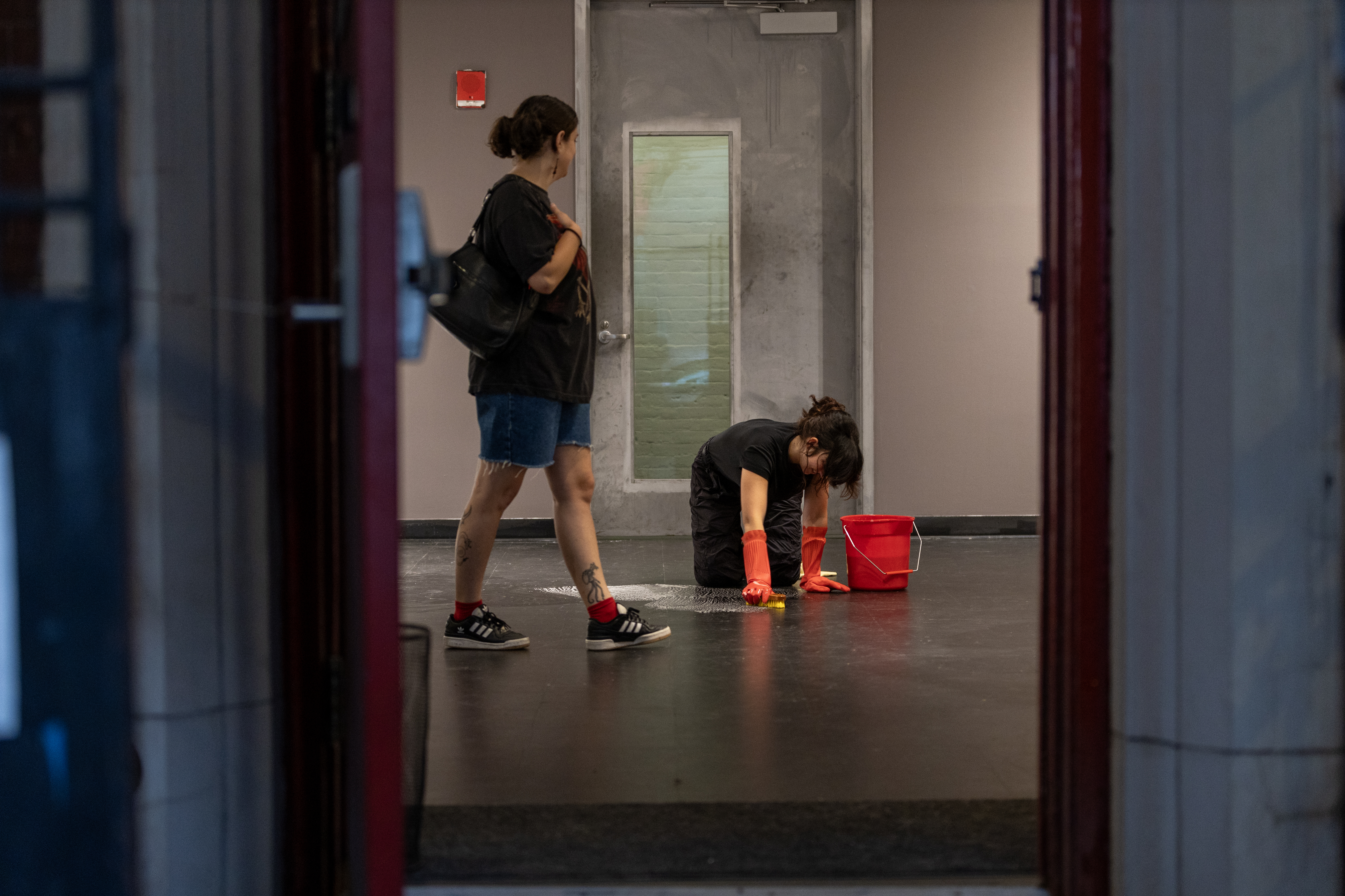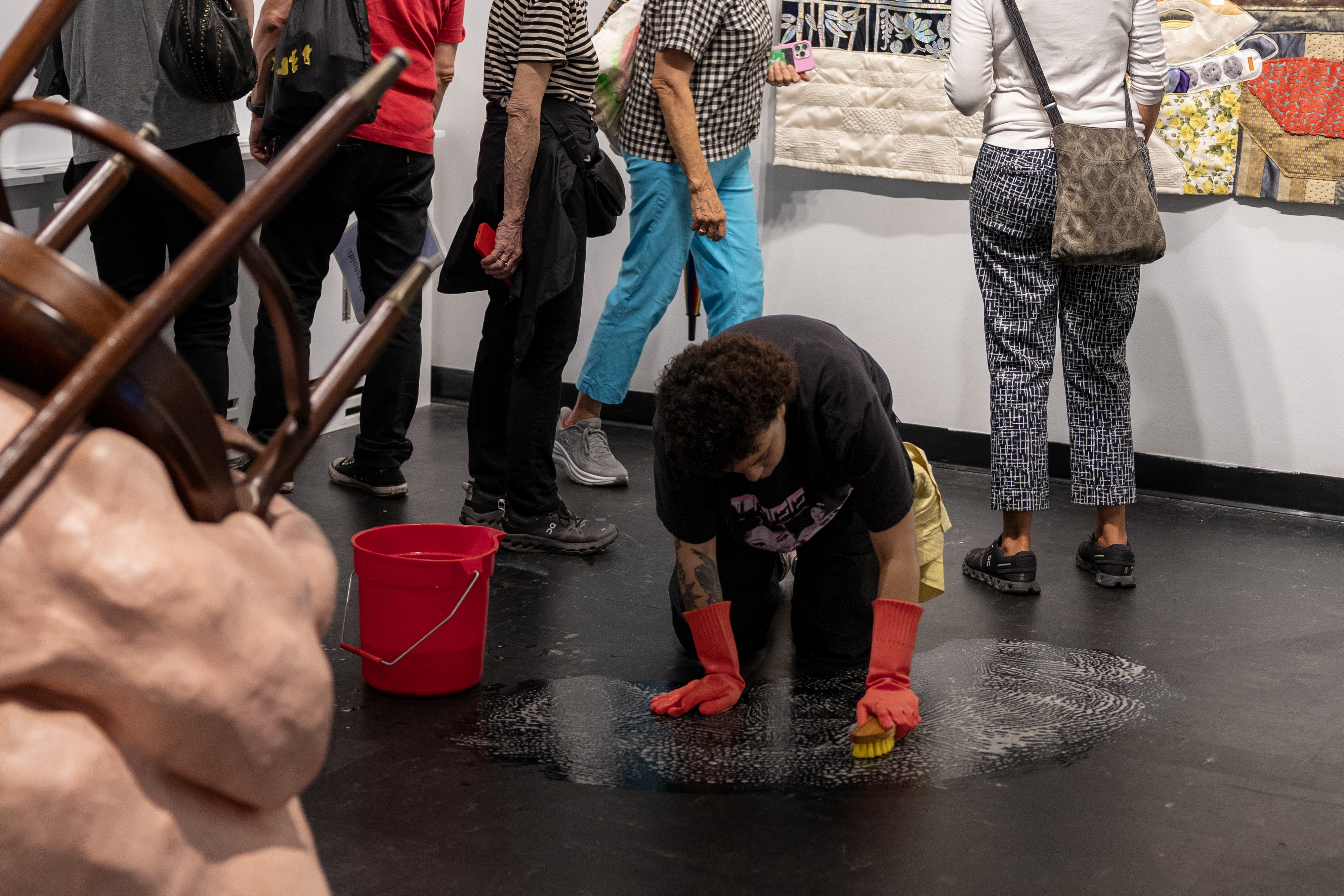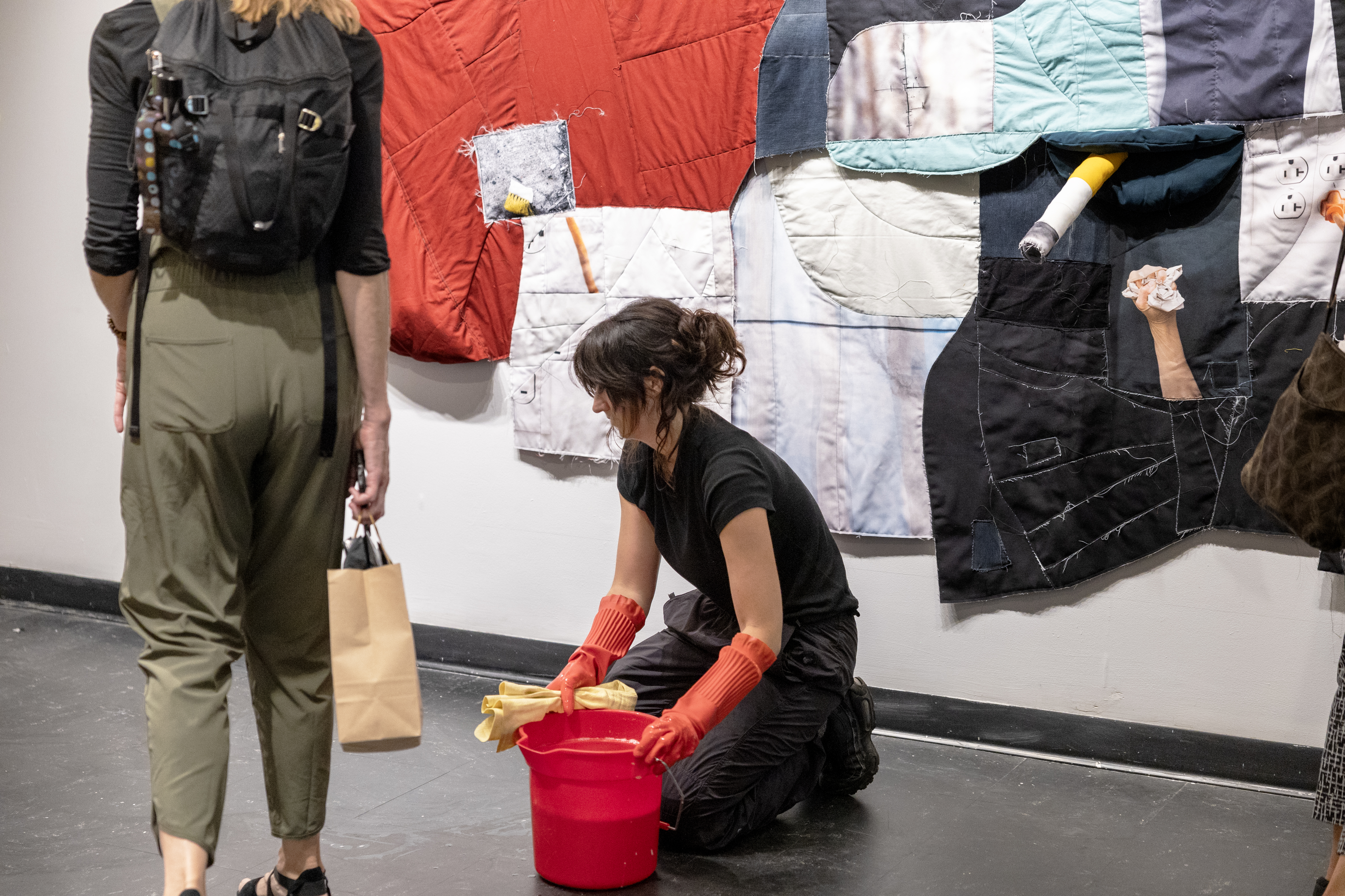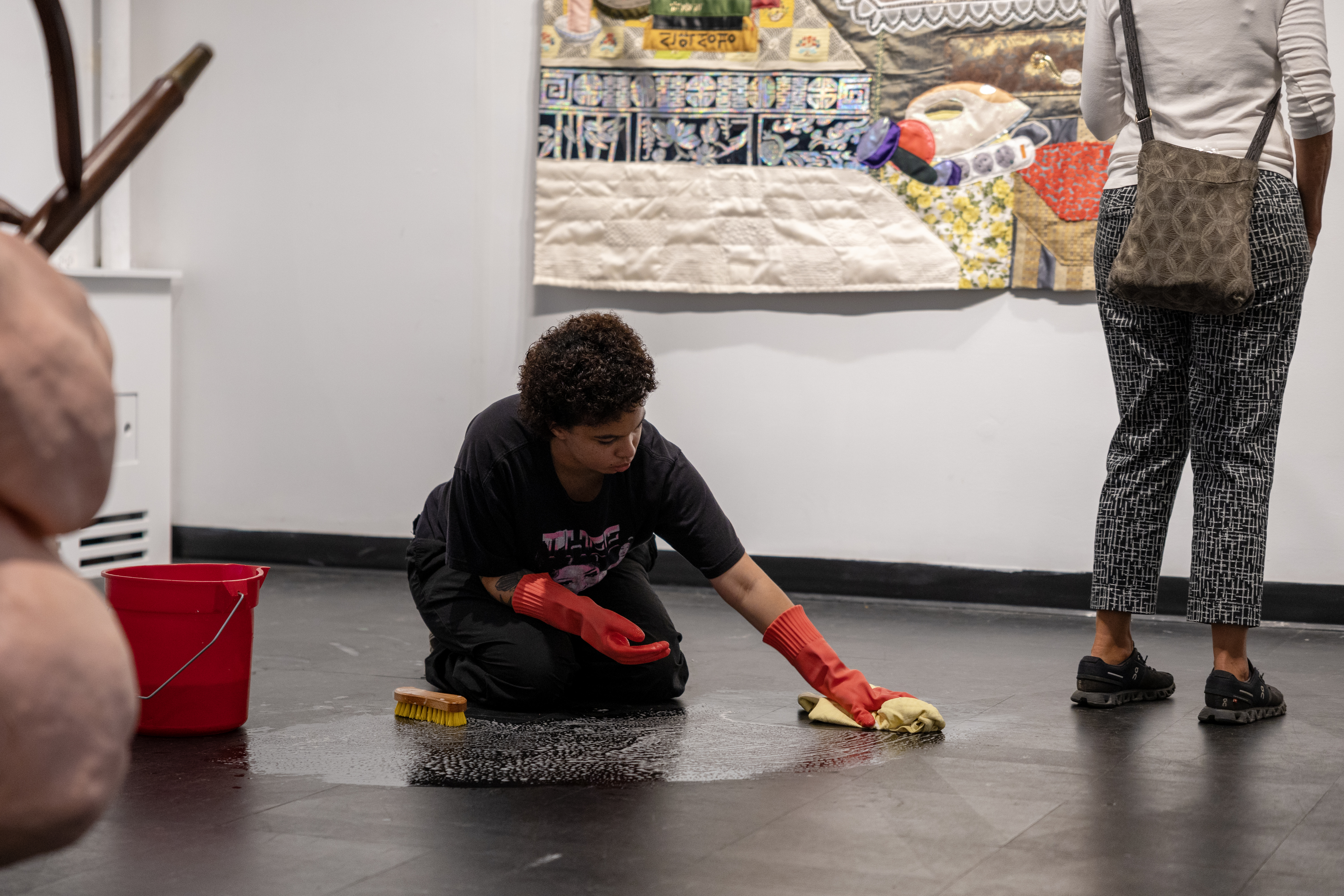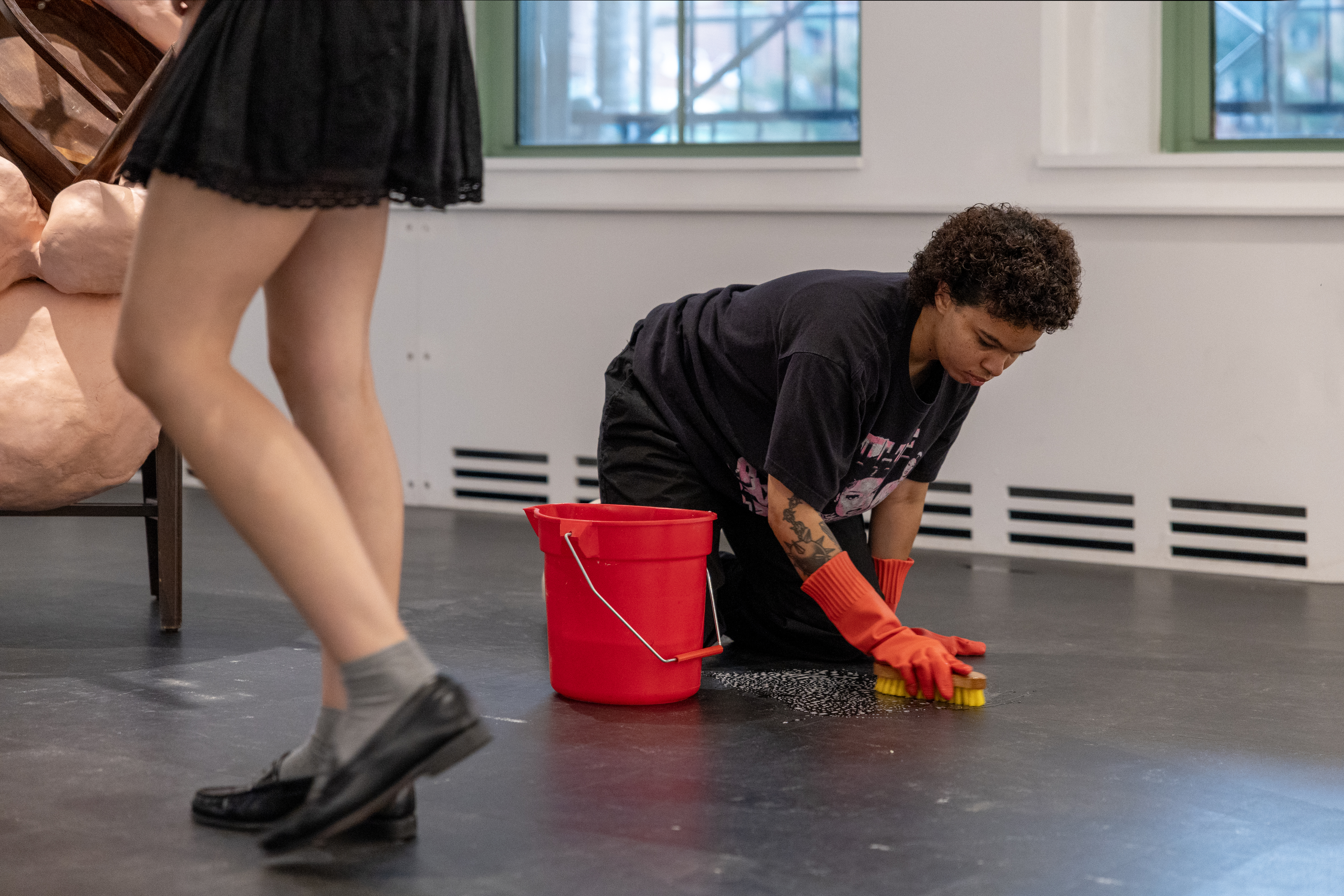 Performed during the opening of Thresholds: Reimagining Domesticity, Labor, and Identity at PS122 Gallery, this work featured two women on their hands and knees, scrubbing the gallery floor with a red bucket, red gloves, and brushes.Through this simple yet relentless act, the performance evoked the invisible, gendered labor passed down across generations—a gesture repeated endlessly in kitchens, hallways, and domestic spaces. Here, the act of cleaning was recontextualized: transformed from routine maintenance into a charged ritual, confronting viewers with the bodily toll of inherited expectations.The title underscores the tension between the intimate and the systemic, reminding us that each moment of labor is not isolated but part of a continuum. The performance asks: what roles do we inherit, and how might repetition become both a burden and a form of resilience?