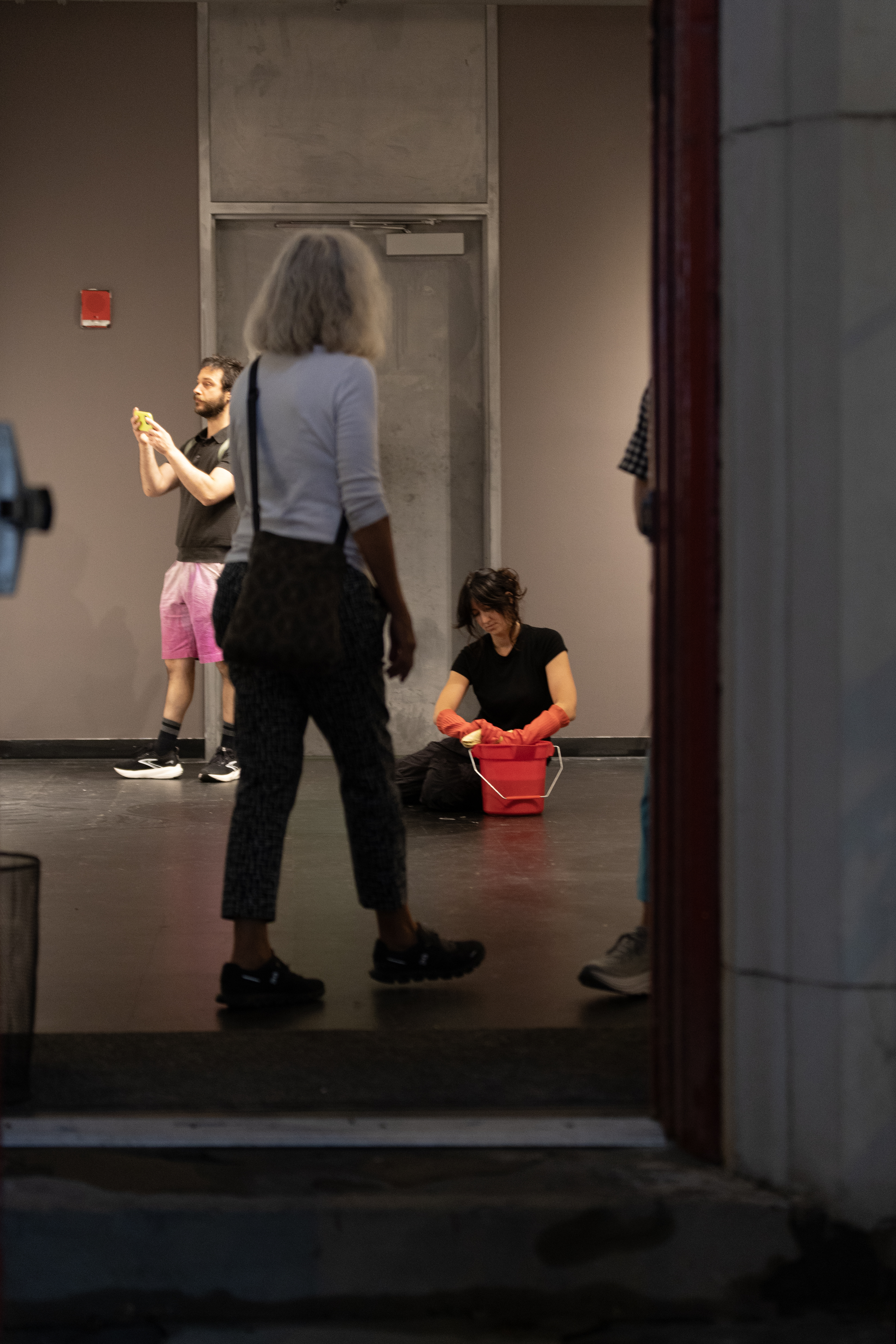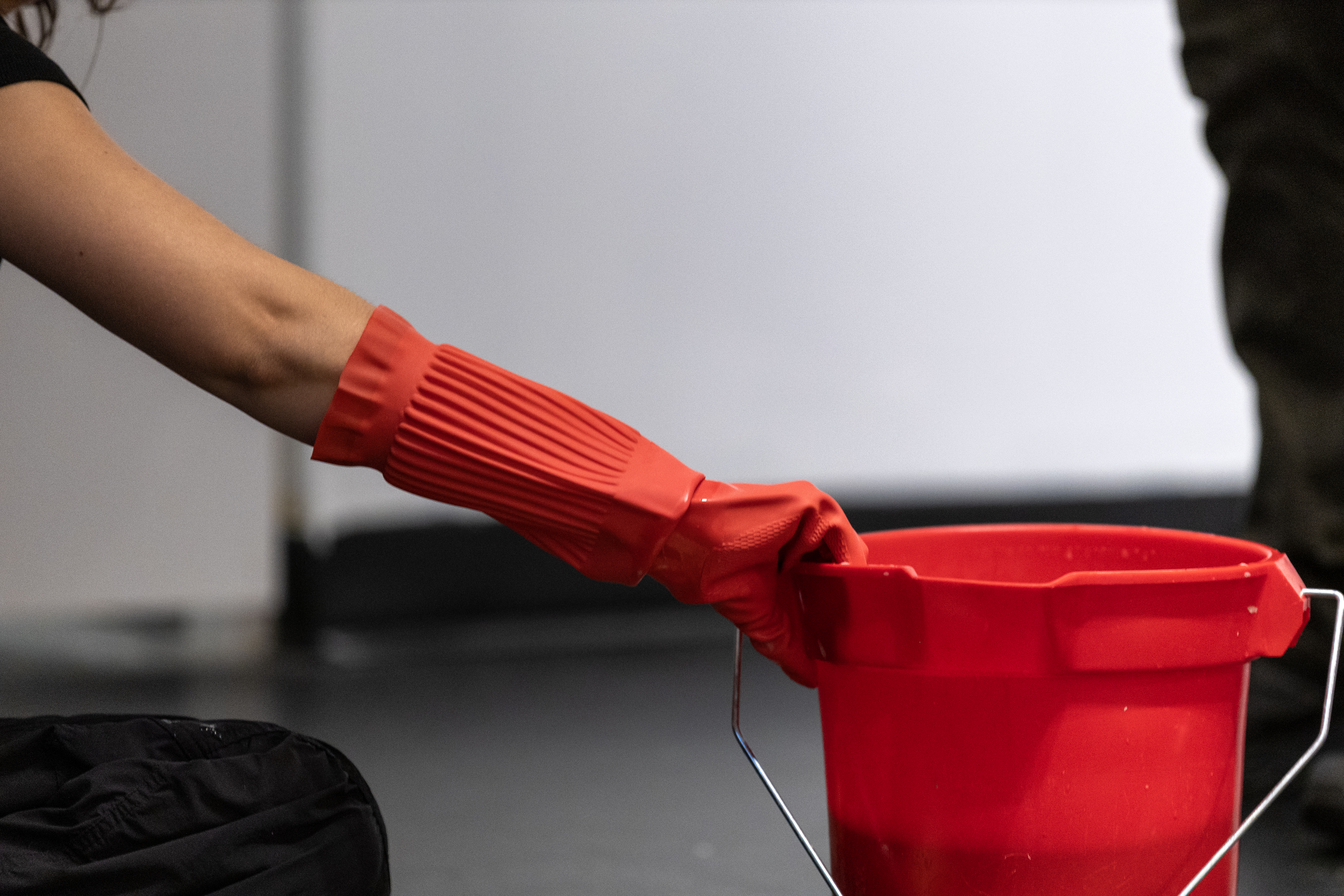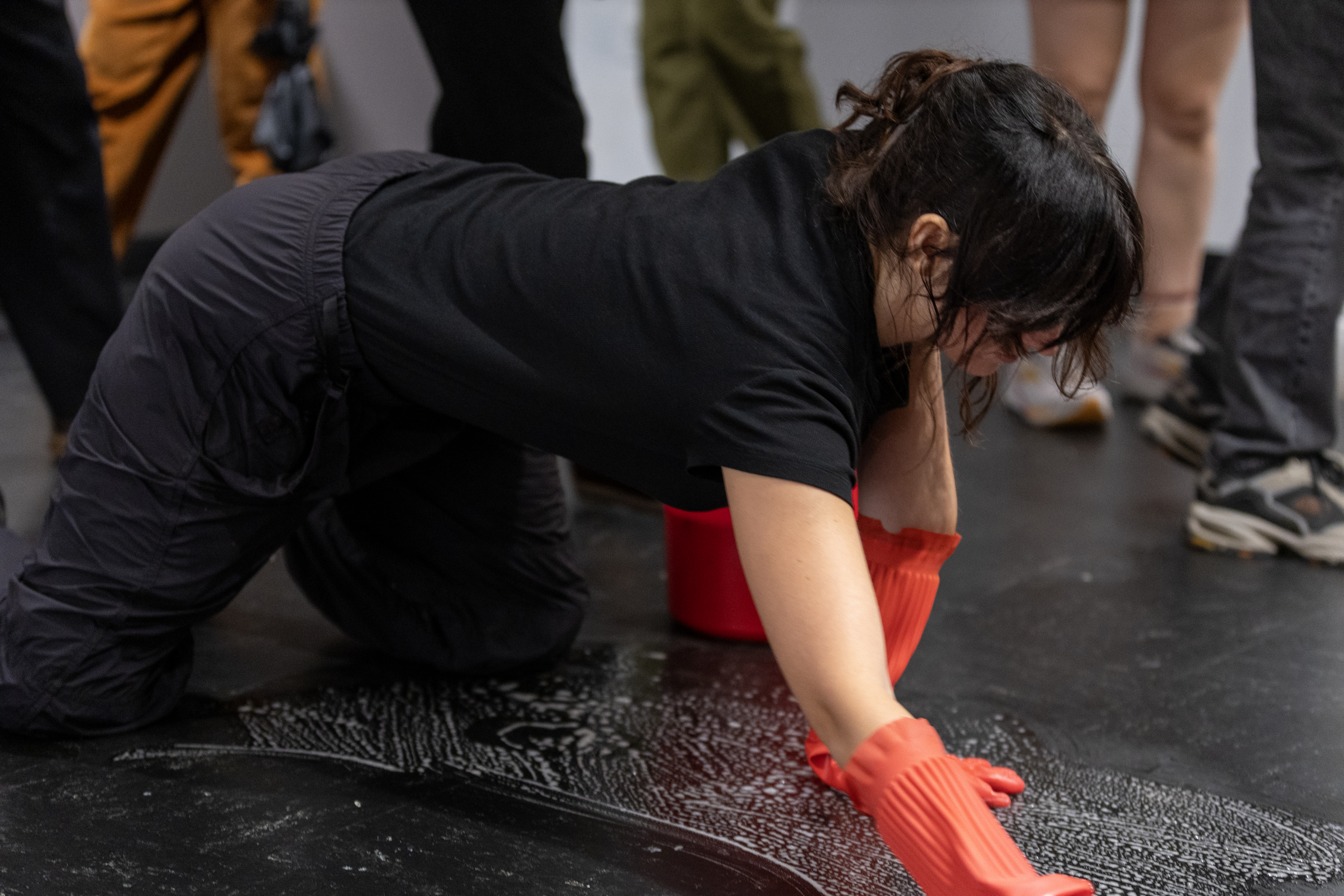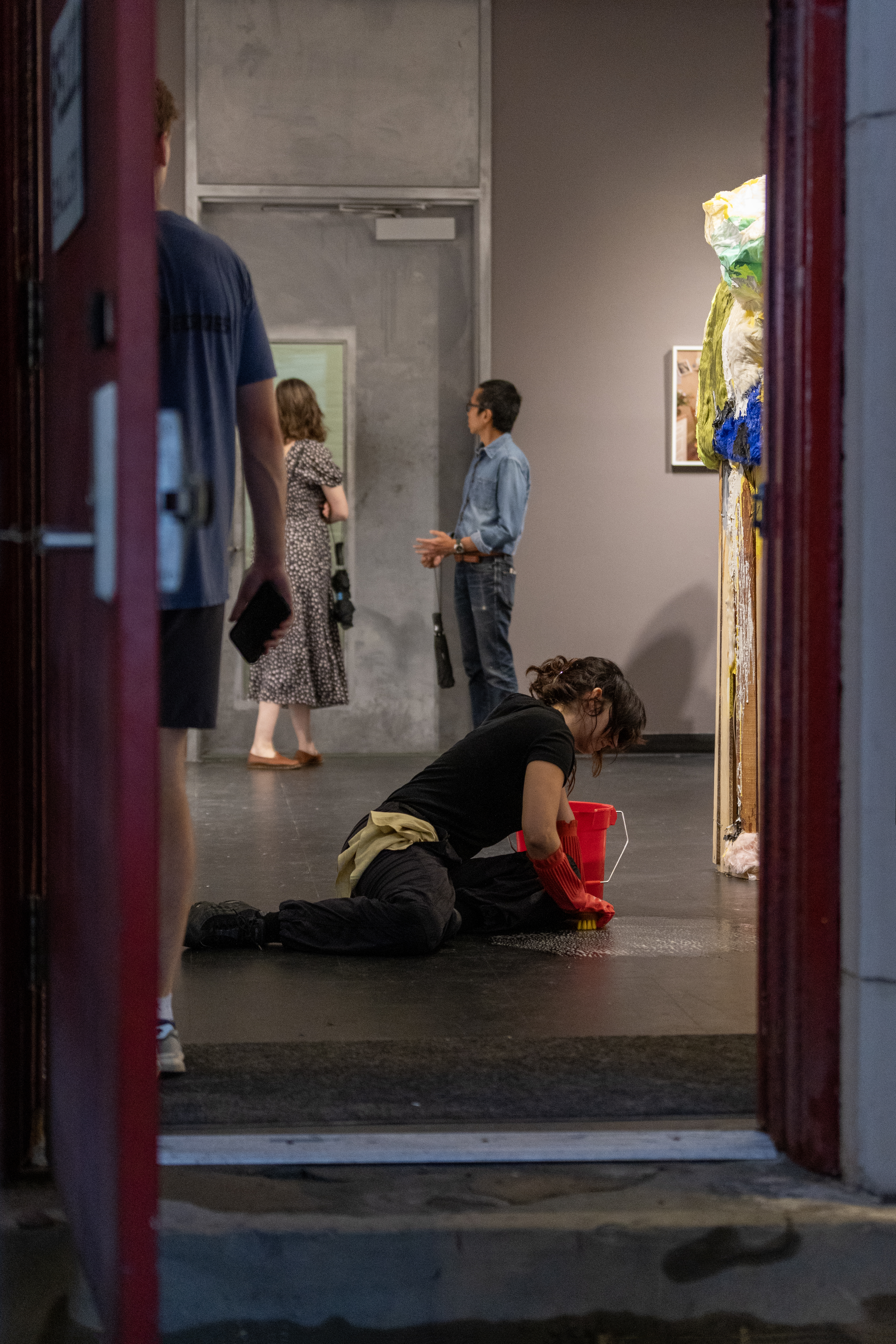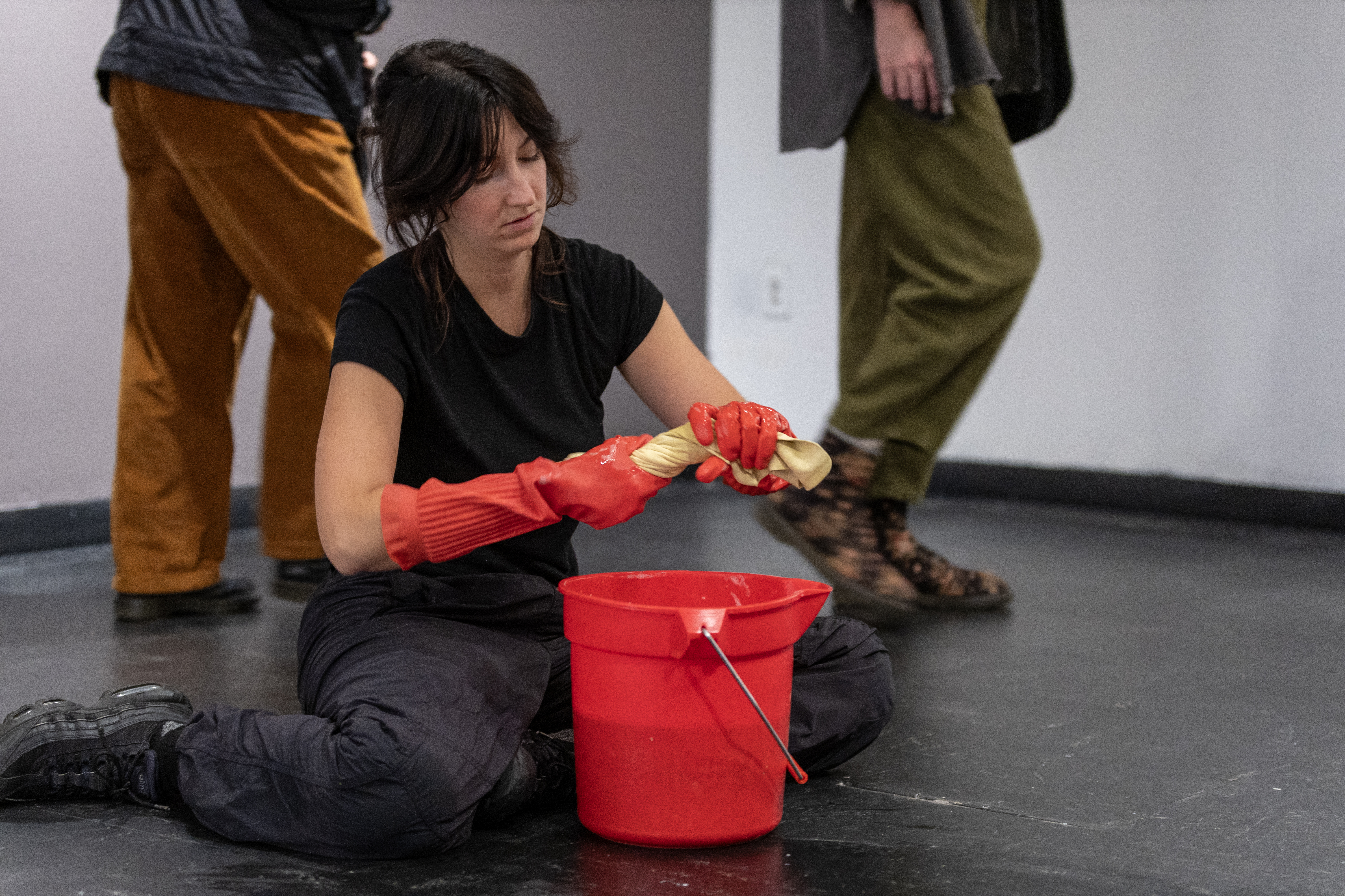 Performed during the opening of Thresholds: Reimagining Domesticity, Labor, and Identity at PS122 Gallery, this work featured two women on their hands and knees, scrubbing the gallery floor with a red bucket, red gloves, and brushes.Through this simple yet relentless act, the performance evoked the invisible, gendered labor passed down across generations—a gesture repeated endlessly in kitchens, hallways, and domestic spaces. Here, the act of cleaning was recontextualized: transformed from routine maintenance into a charged ritual, confronting viewers with the bodily toll of inherited expectations.The title underscores the tension between the intimate and the systemic, reminding us that each moment of labor is not isolated but part of a continuum. The performance asks: what roles do we inherit, and how might repetition become both a burden and a form of resilience?