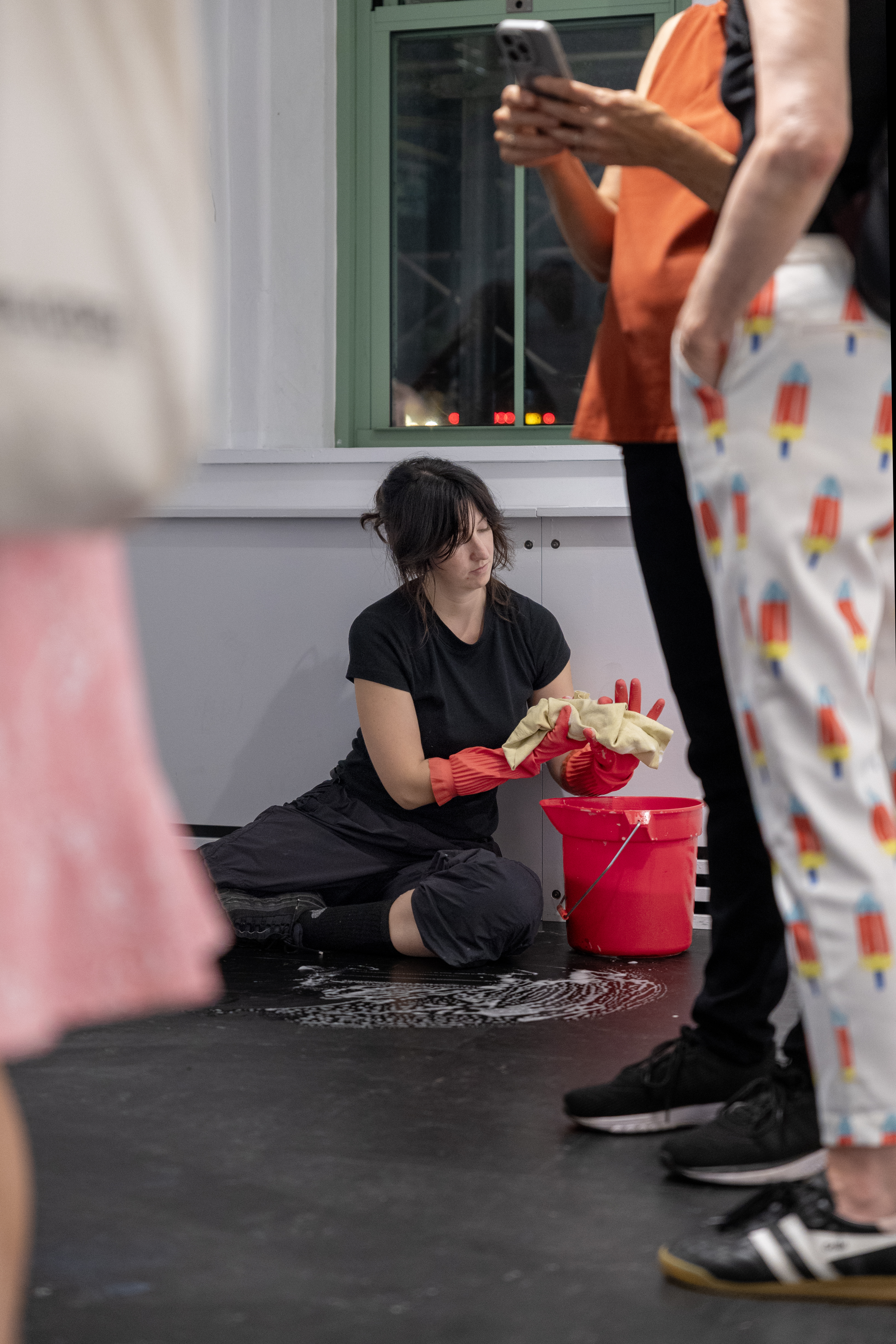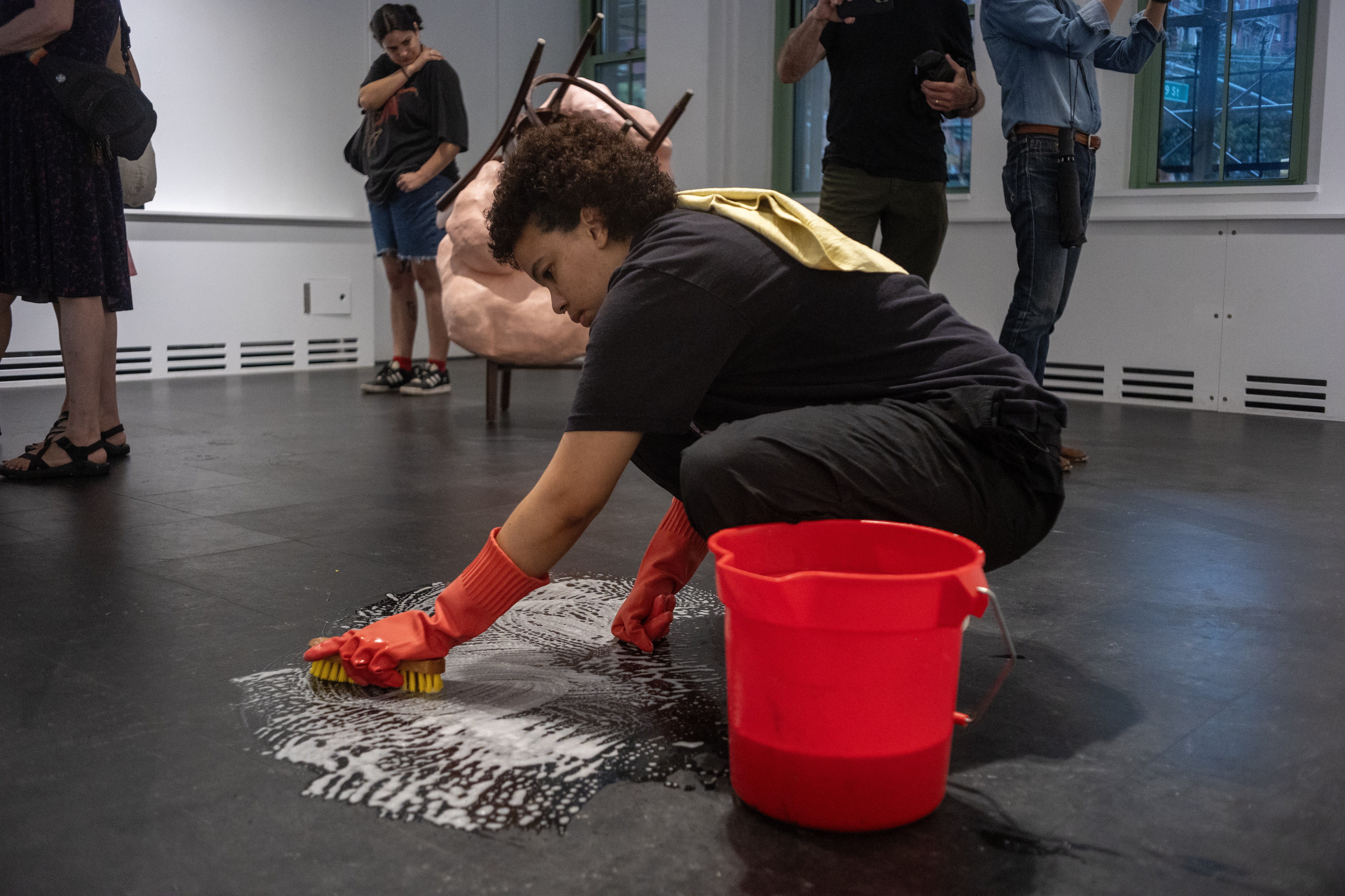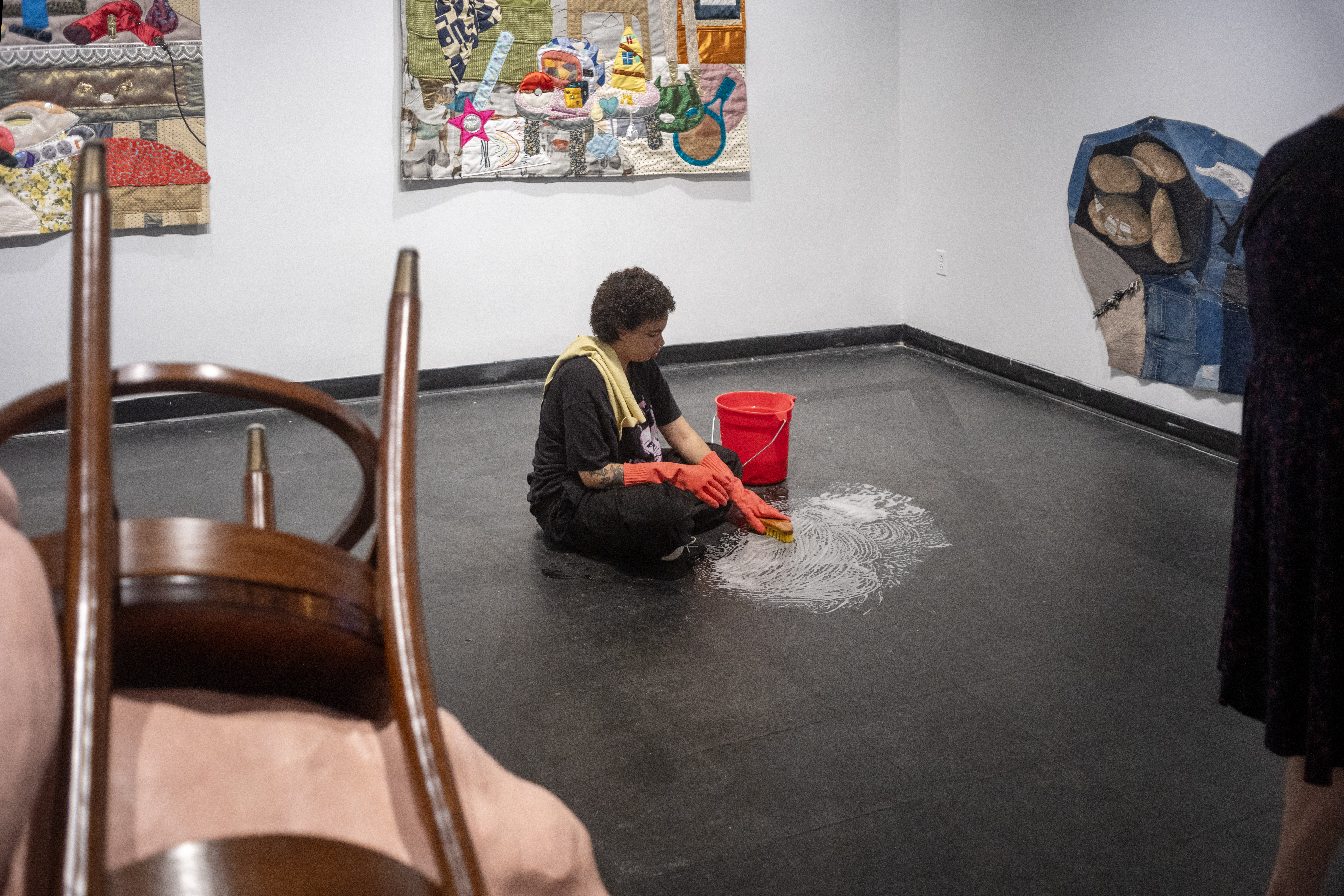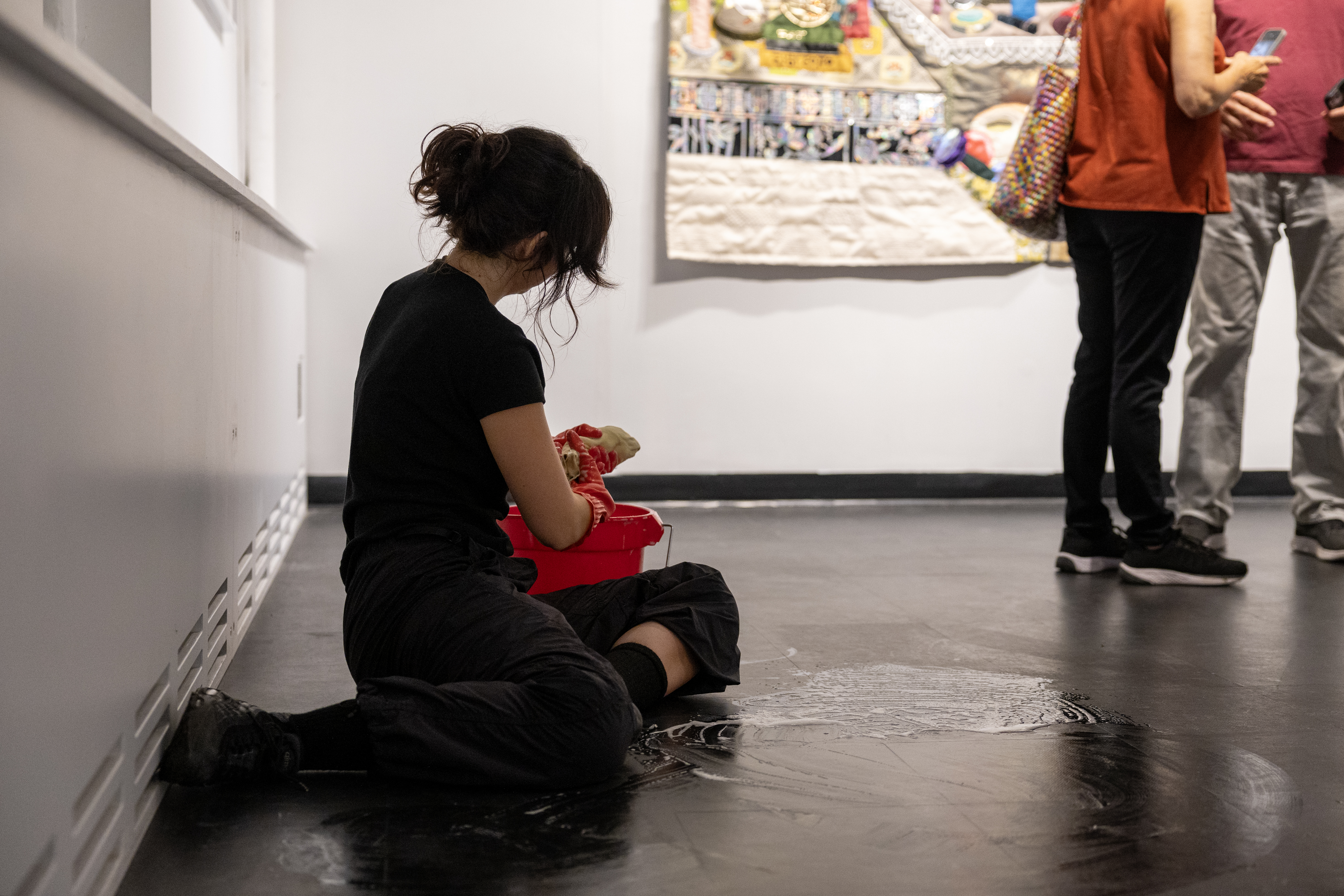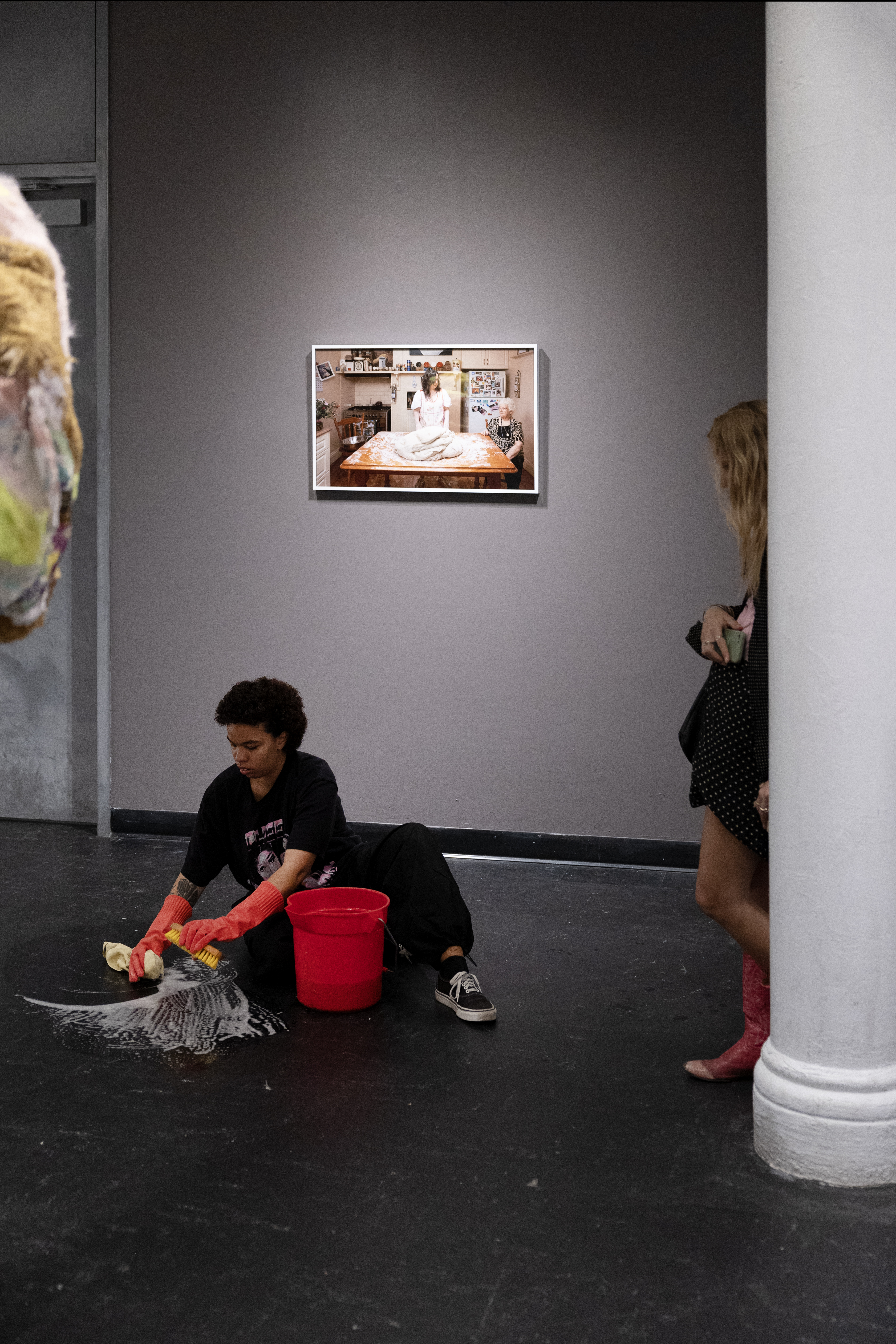 Performed during the opening of Thresholds: Reimagining Domesticity, Labor, and Identity at PS122 Gallery, this work featured two women on their hands and knees, scrubbing the gallery floor with a red bucket, red gloves, and brushes.Through this simple yet relentless act, the performance evoked the invisible, gendered labor passed down across generations—a gesture repeated endlessly in kitchens, hallways, and domestic spaces. Here, the act of cleaning was recontextualized: transformed from routine maintenance into a charged ritual, confronting viewers with the bodily toll of inherited expectations.The title underscores the tension between the intimate and the systemic, reminding us that each moment of labor is not isolated but part of a continuum. The performance asks: what roles do we inherit, and how might repetition become both a burden and a form of resilience?