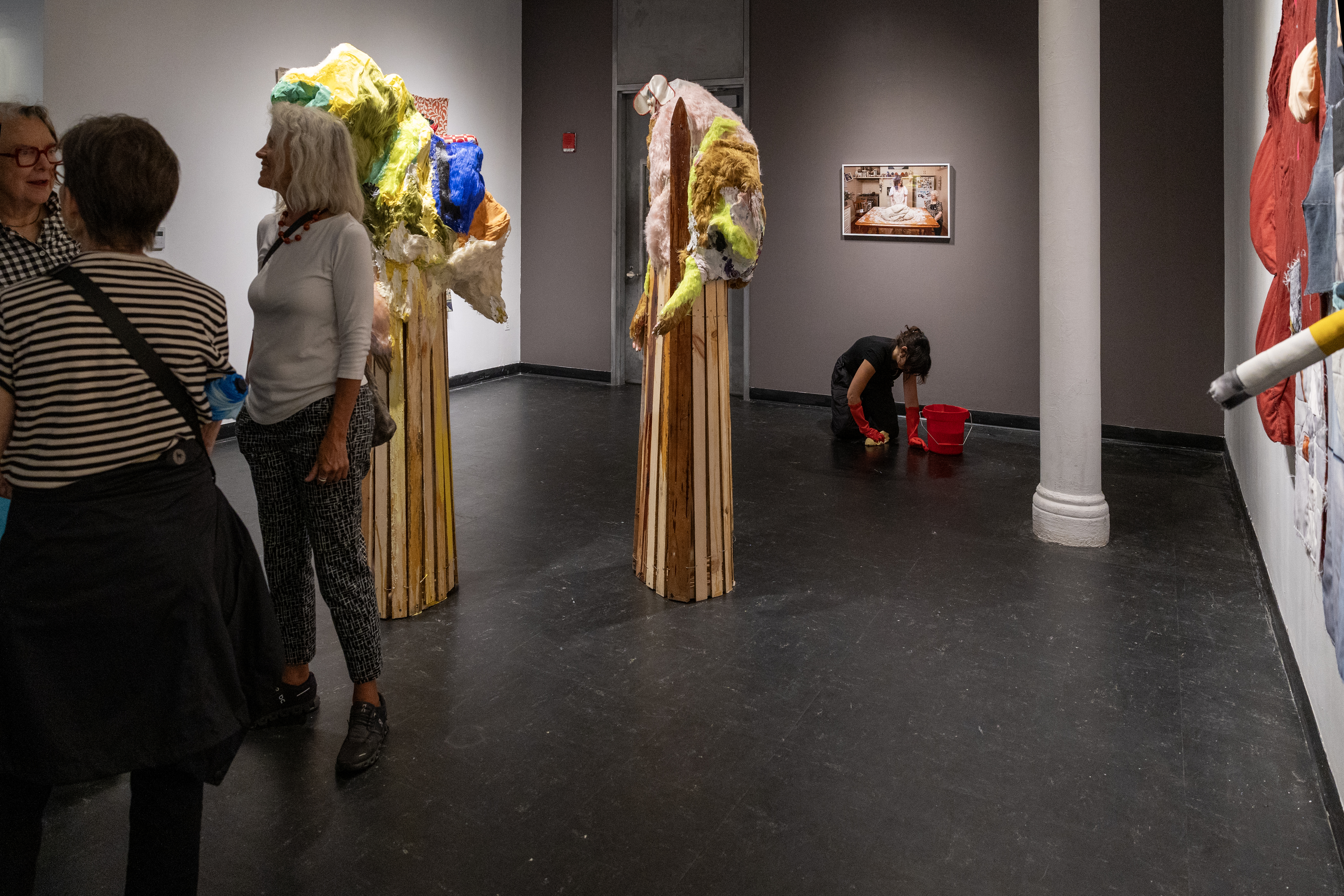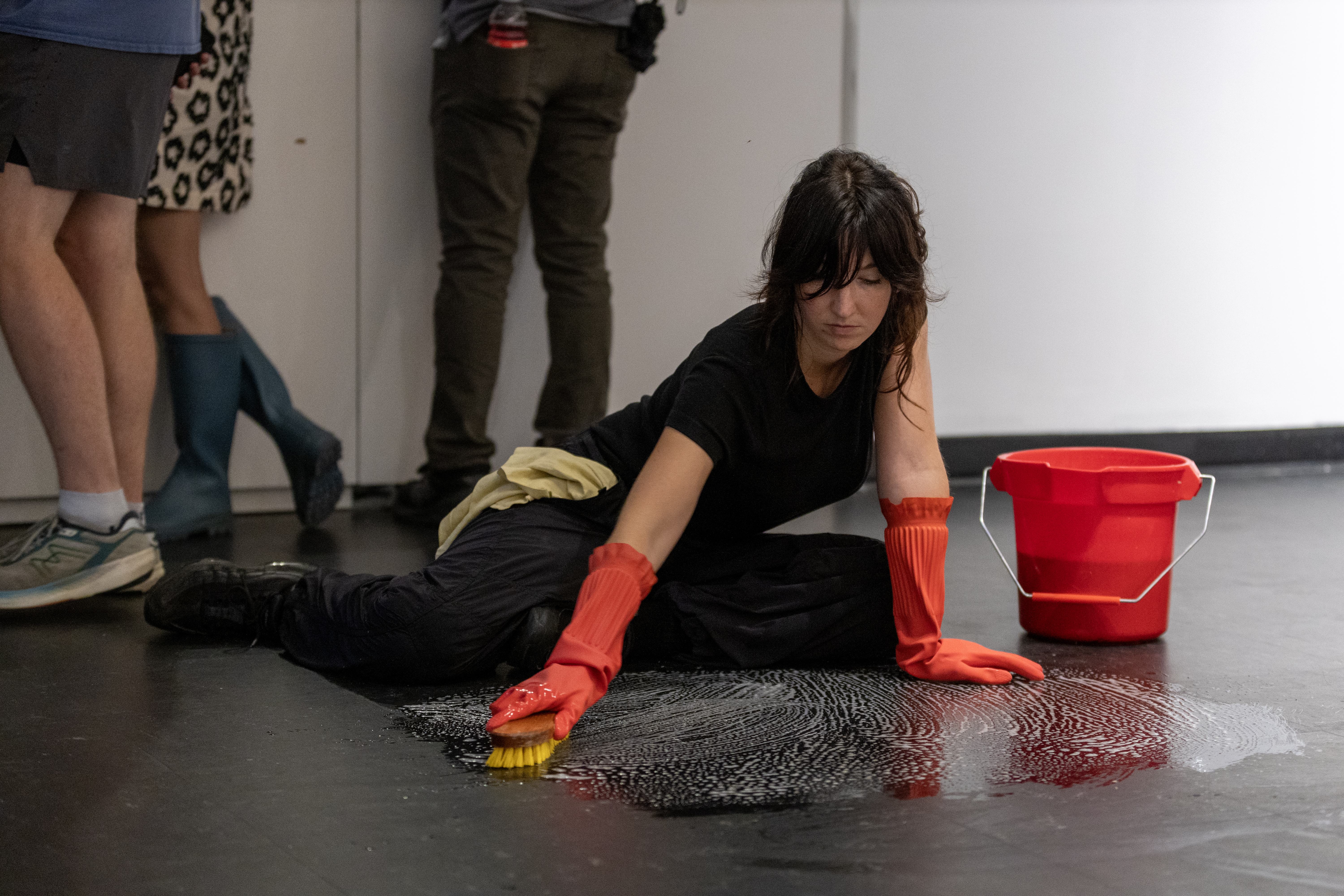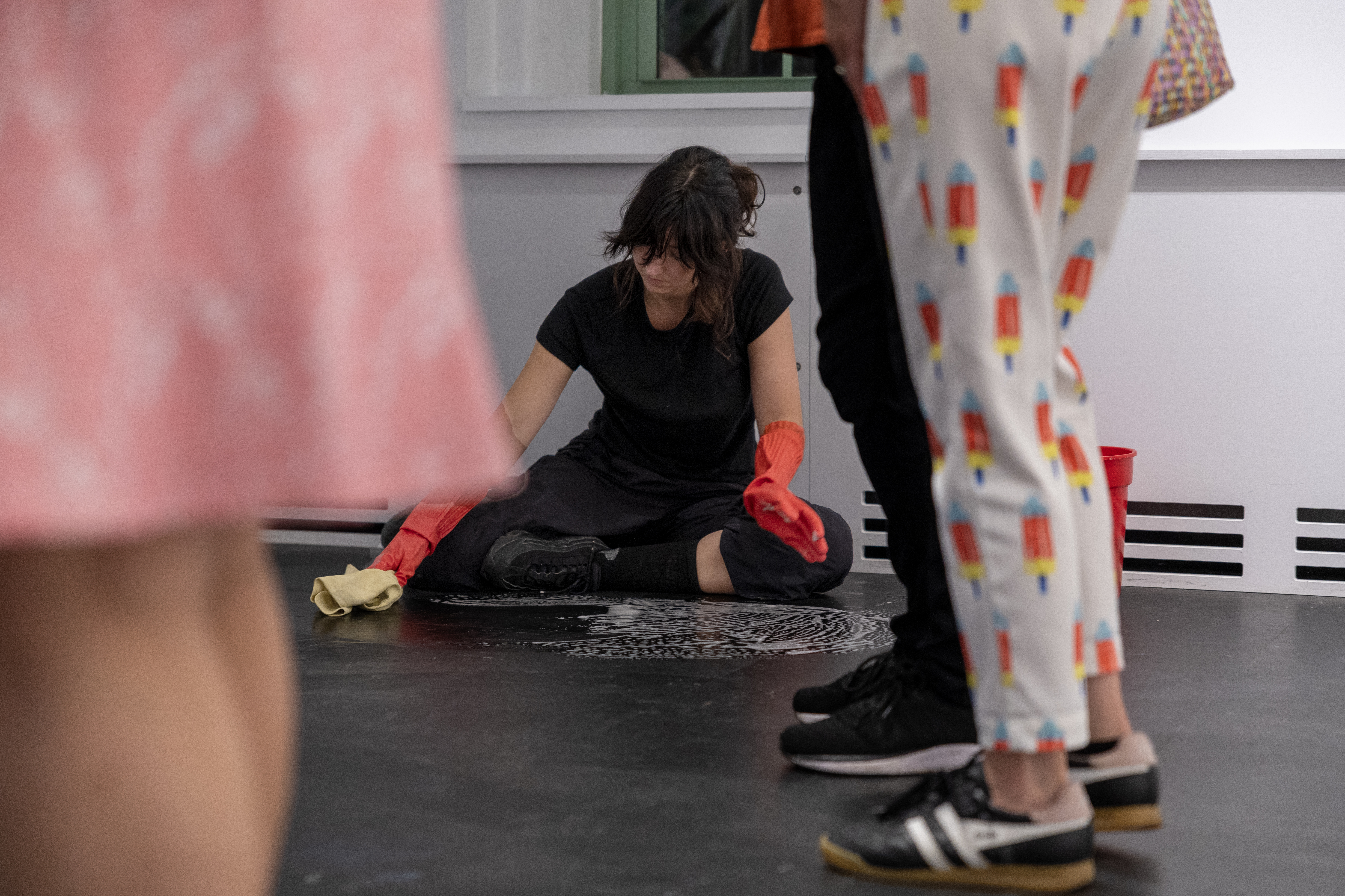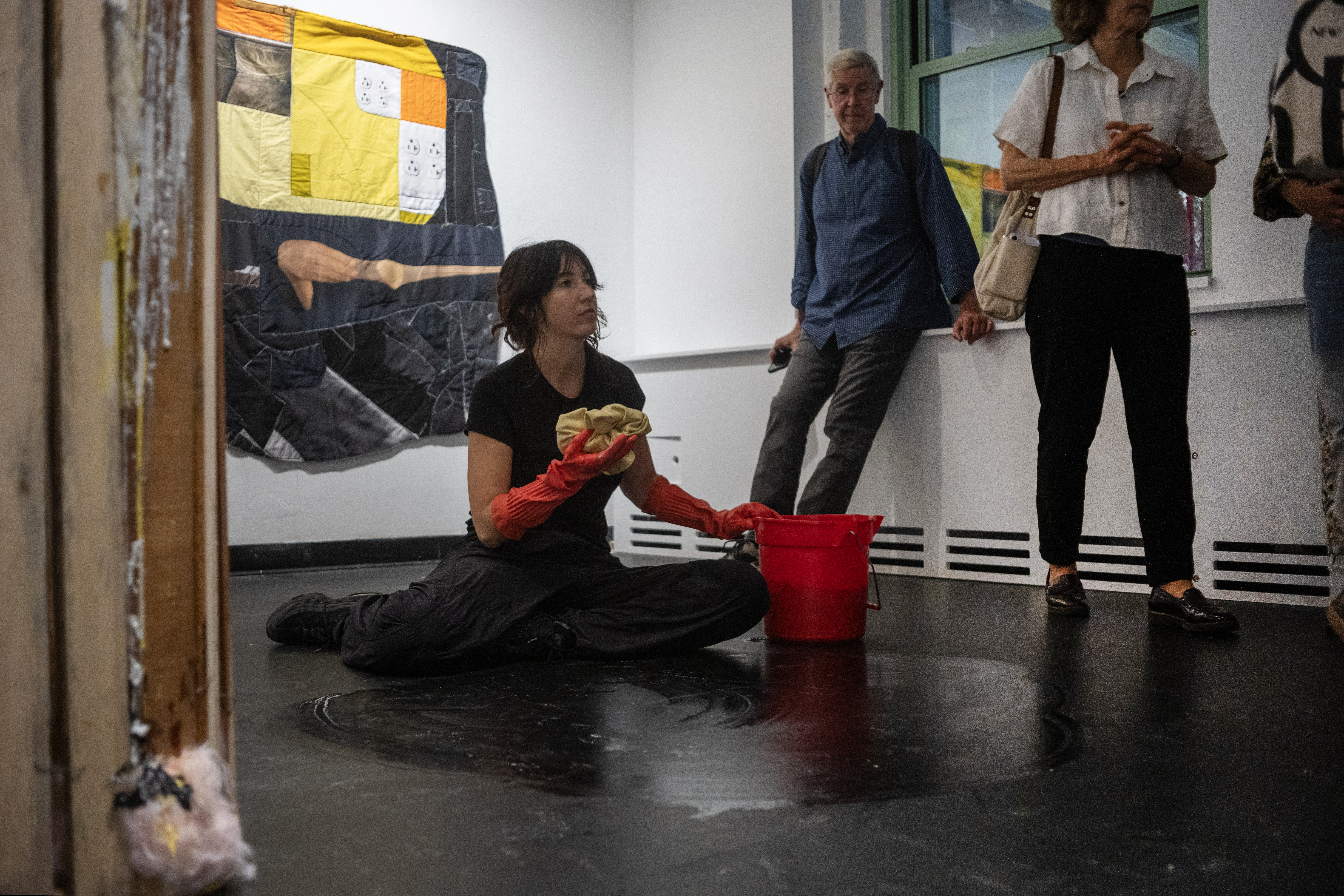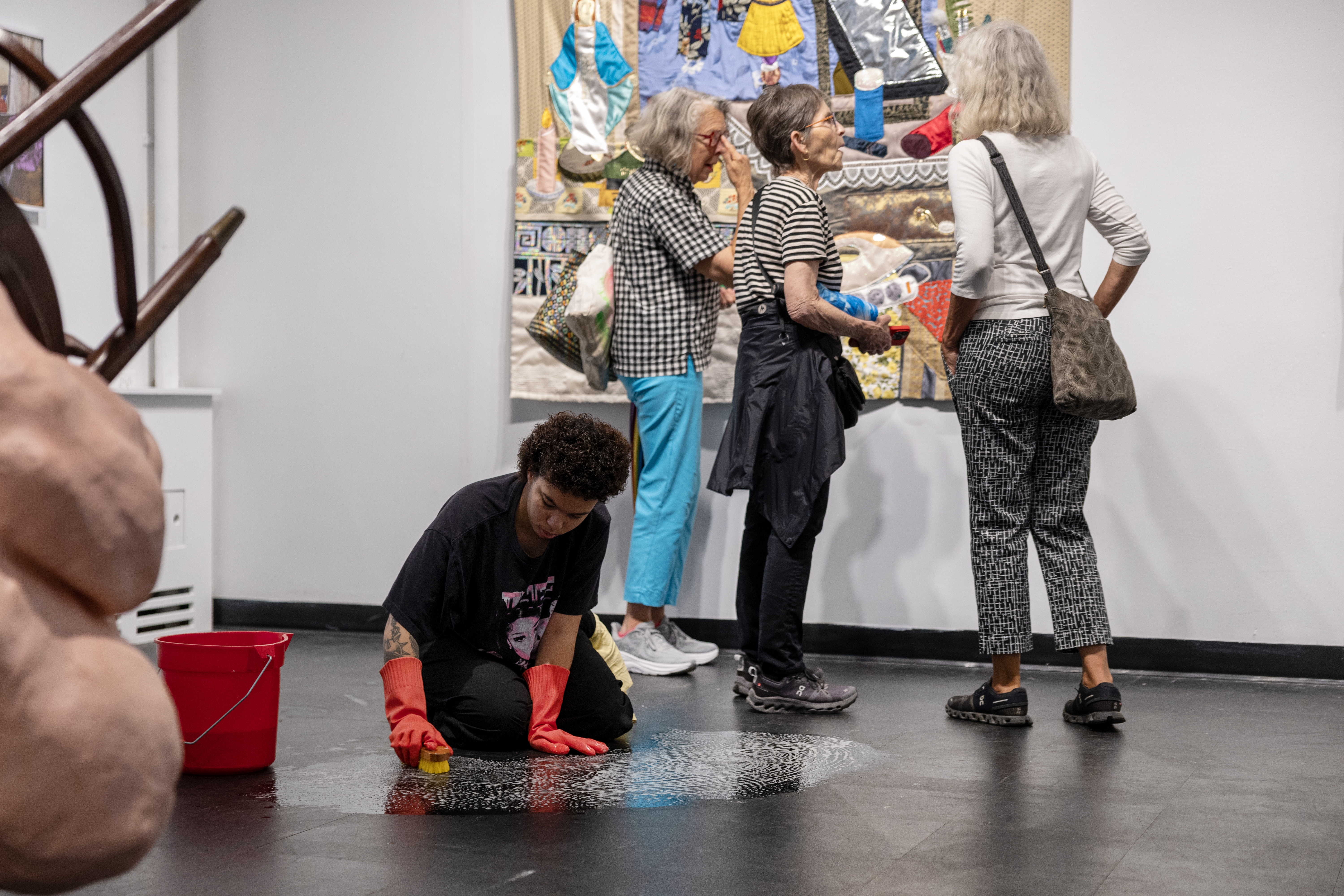 Performed during the opening of Thresholds: Reimagining Domesticity, Labor, and Identity at PS122 Gallery, this work featured two women on their hands and knees, scrubbing the gallery floor with a red bucket, red gloves, and brushes.Through this simple yet relentless act, the performance evoked the invisible, gendered labor passed down across generations—a gesture repeated endlessly in kitchens, hallways, and domestic spaces. Here, the act of cleaning was recontextualized: transformed from routine maintenance into a charged ritual, confronting viewers with the bodily toll of inherited expectations.The title underscores the tension between the intimate and the systemic, reminding us that each moment of labor is not isolated but part of a continuum. The performance asks: what roles do we inherit, and how might repetition become both a burden and a form of resilience?