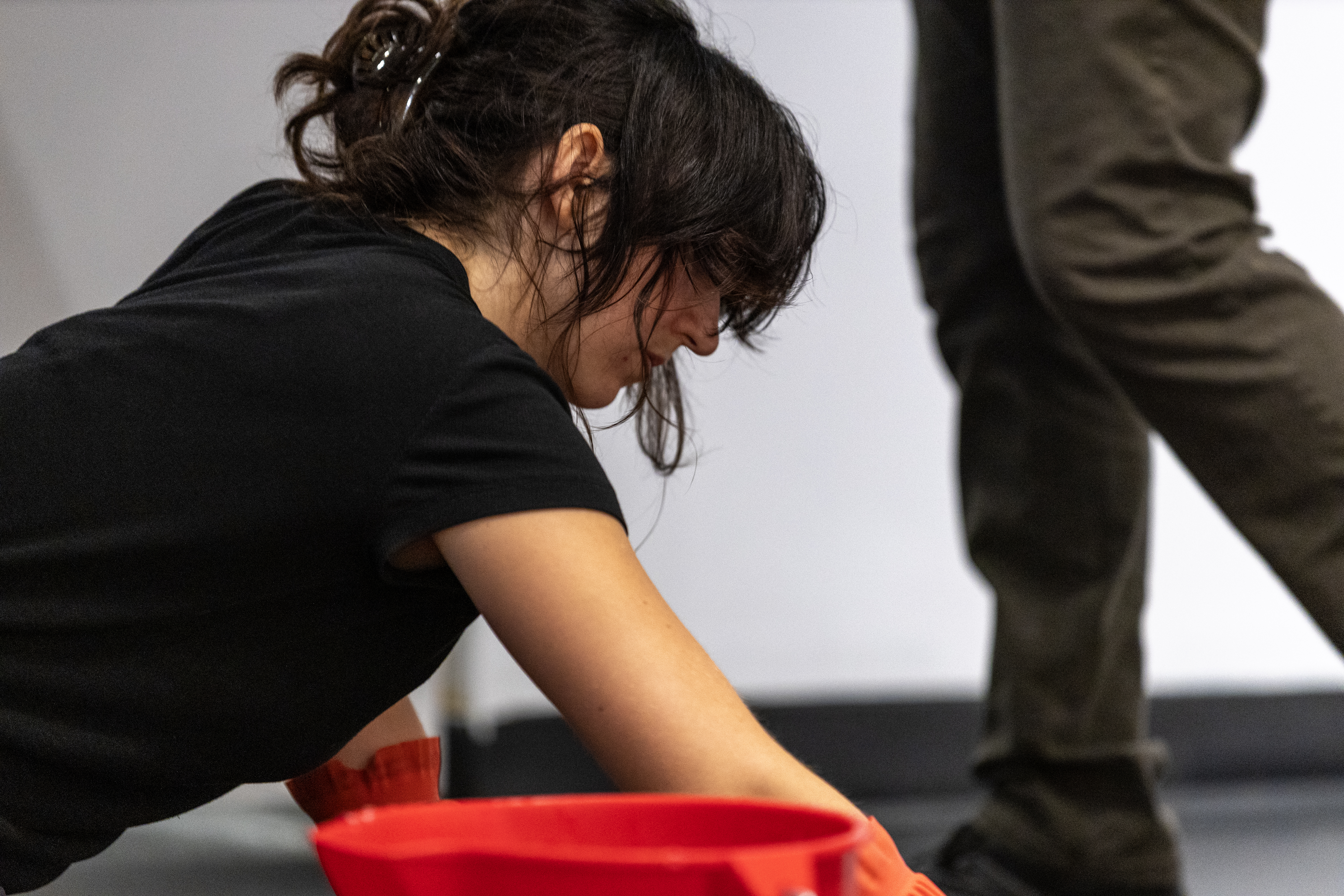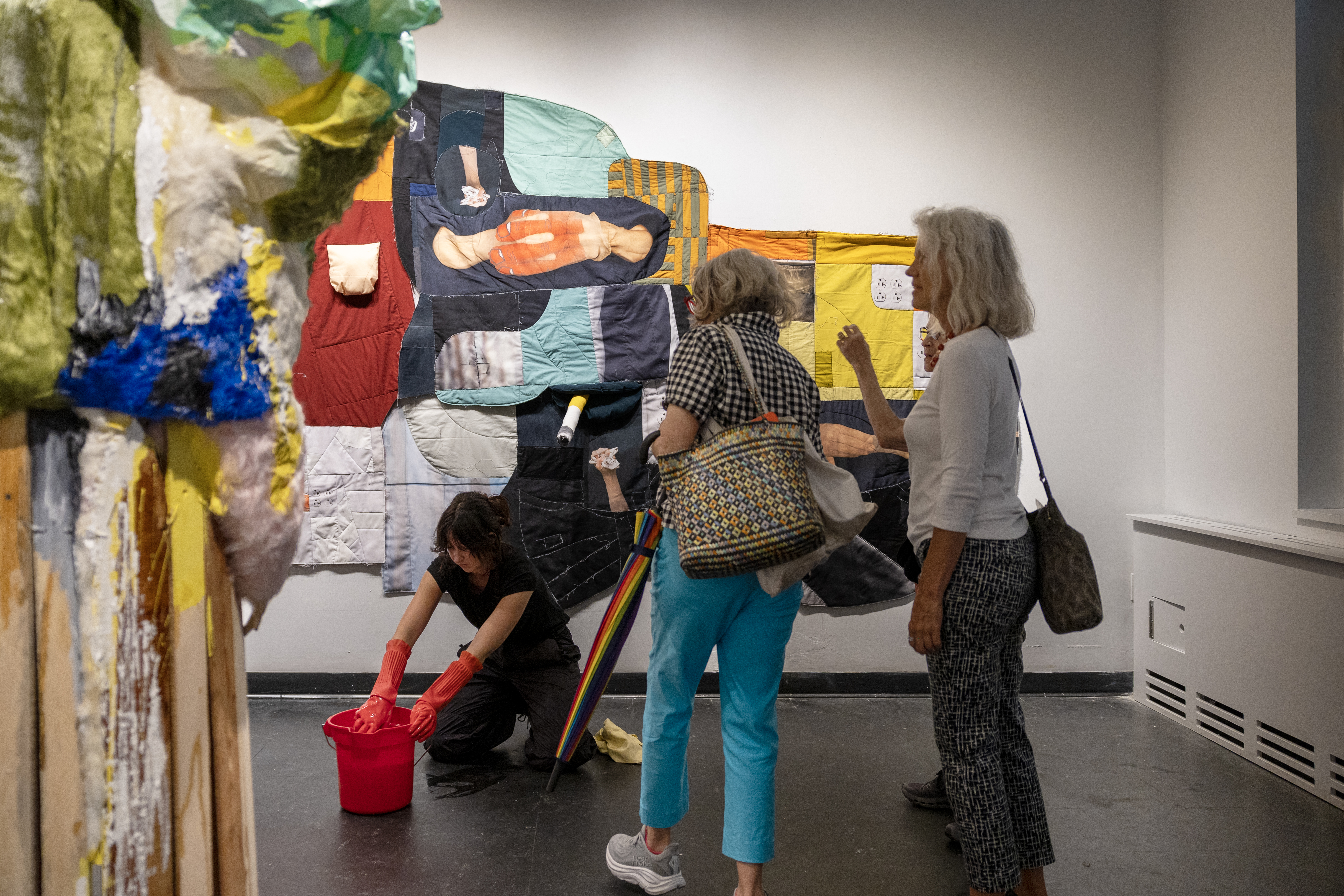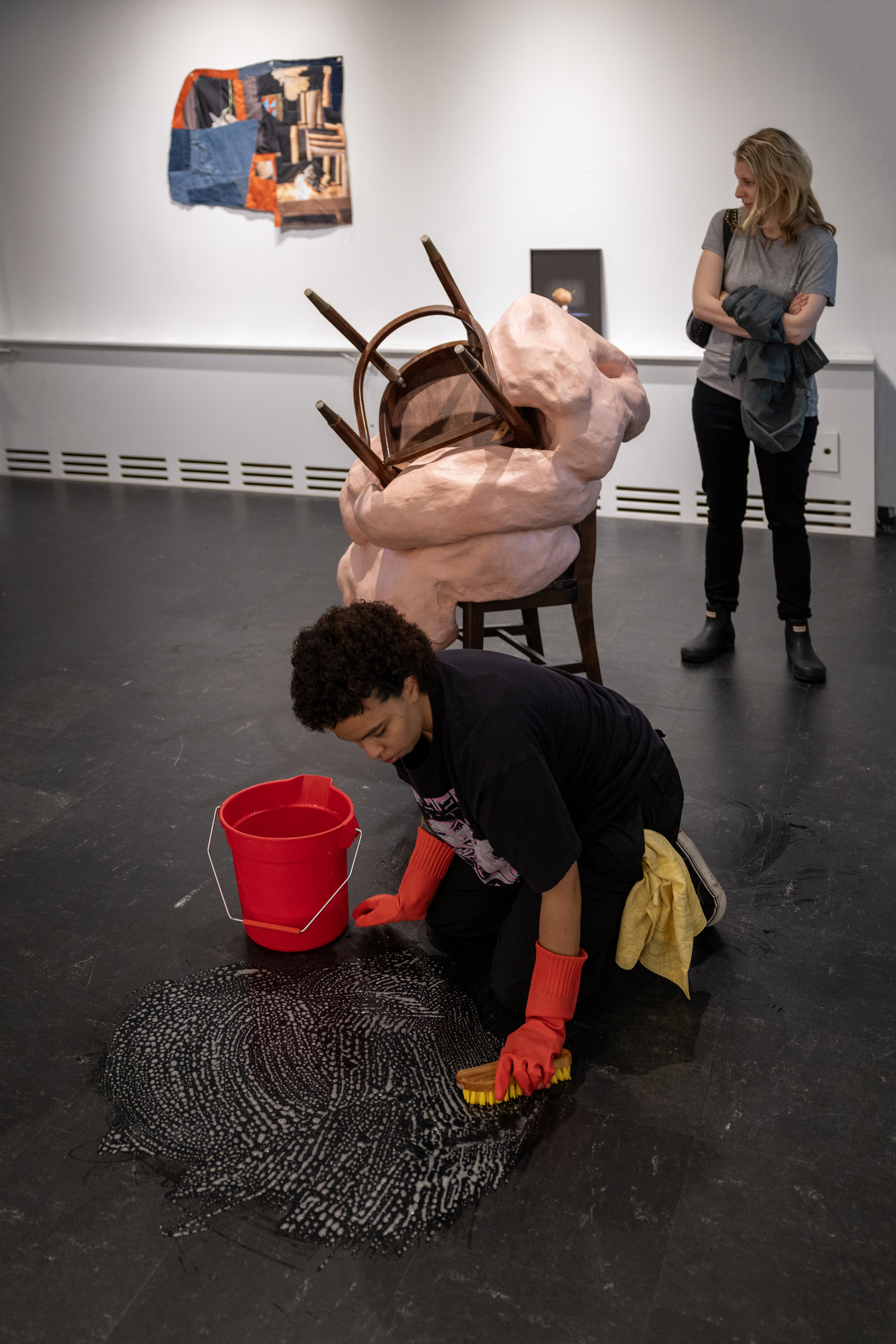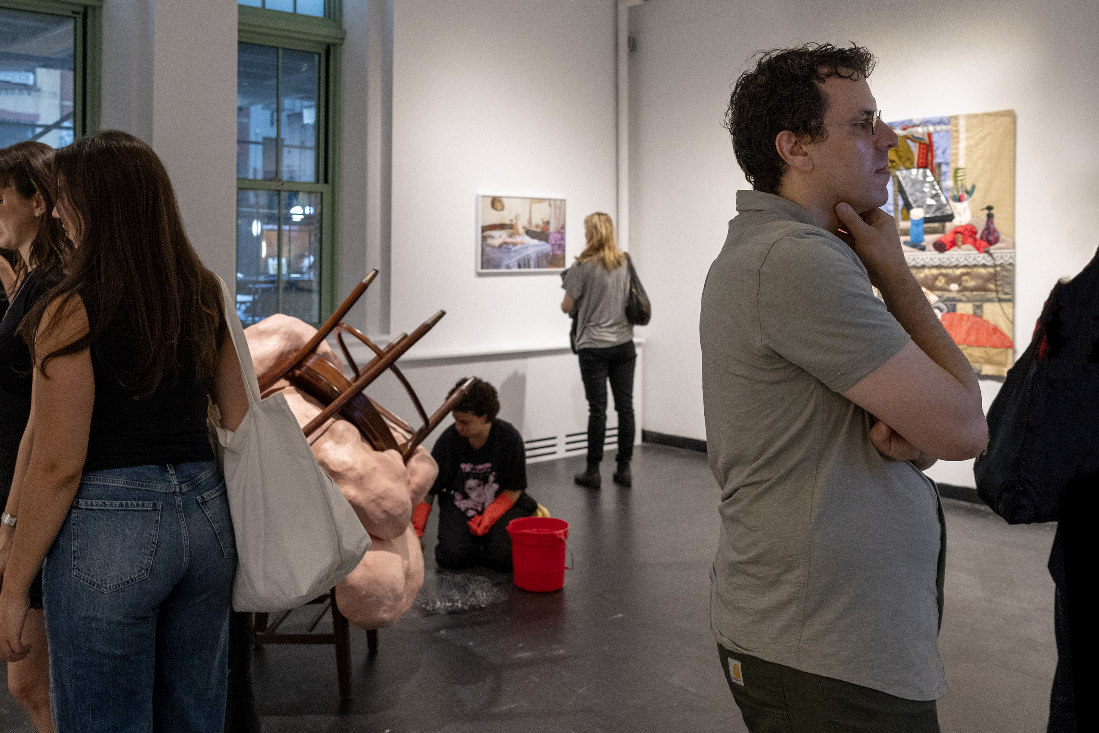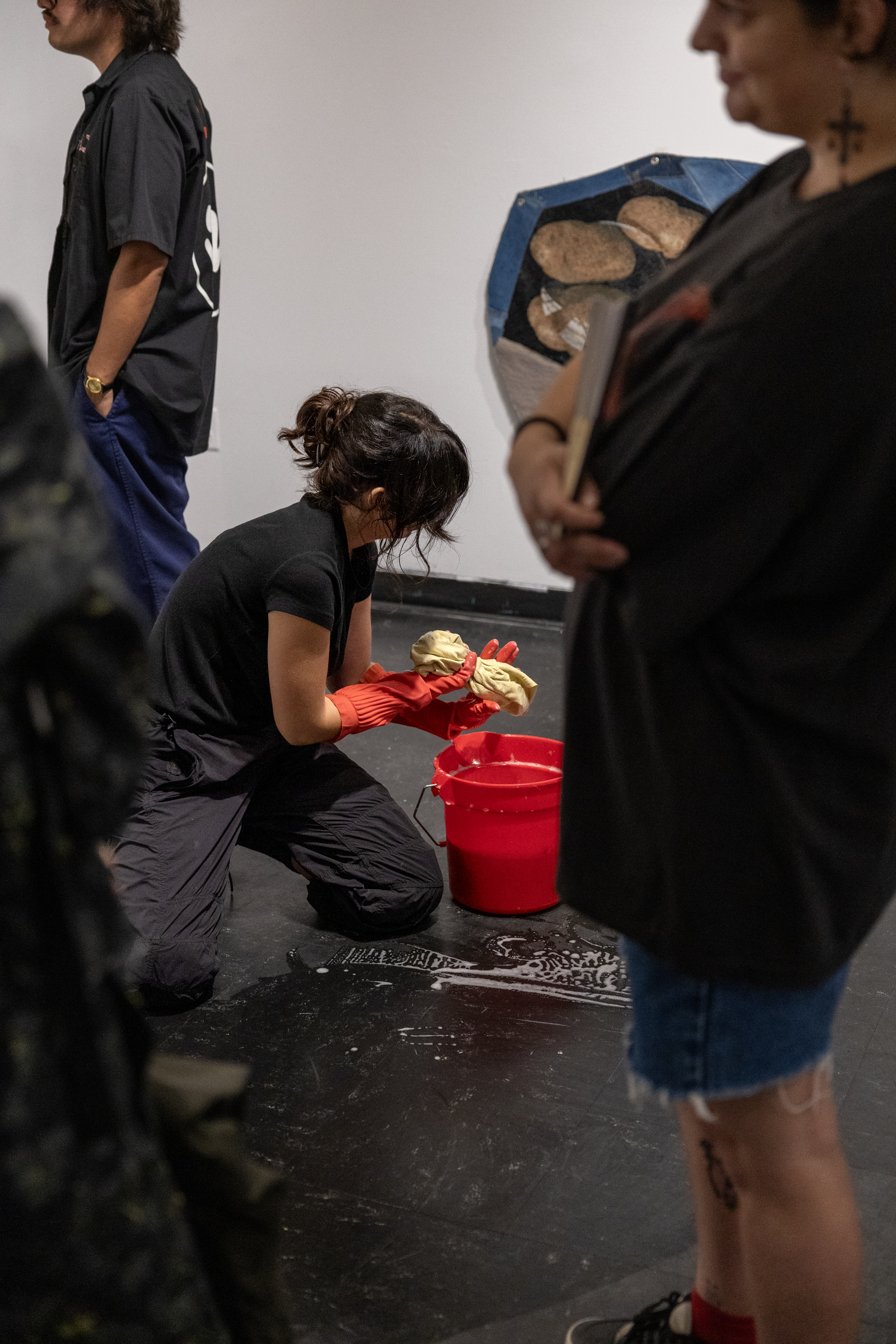 Performed during the opening of Thresholds: Reimagining Domesticity, Labor, and Identity at PS122 Gallery, this work featured two women on their hands and knees, scrubbing the gallery floor with a red bucket, red gloves, and brushes.Through this simple yet relentless act, the performance evoked the invisible, gendered labor passed down across generations—a gesture repeated endlessly in kitchens, hallways, and domestic spaces. Here, the act of cleaning was recontextualized: transformed from routine maintenance into a charged ritual, confronting viewers with the bodily toll of inherited expectations.The title underscores the tension between the intimate and the systemic, reminding us that each moment of labor is not isolated but part of a continuum. The performance asks: what roles do we inherit, and how might repetition become both a burden and a form of resilience?