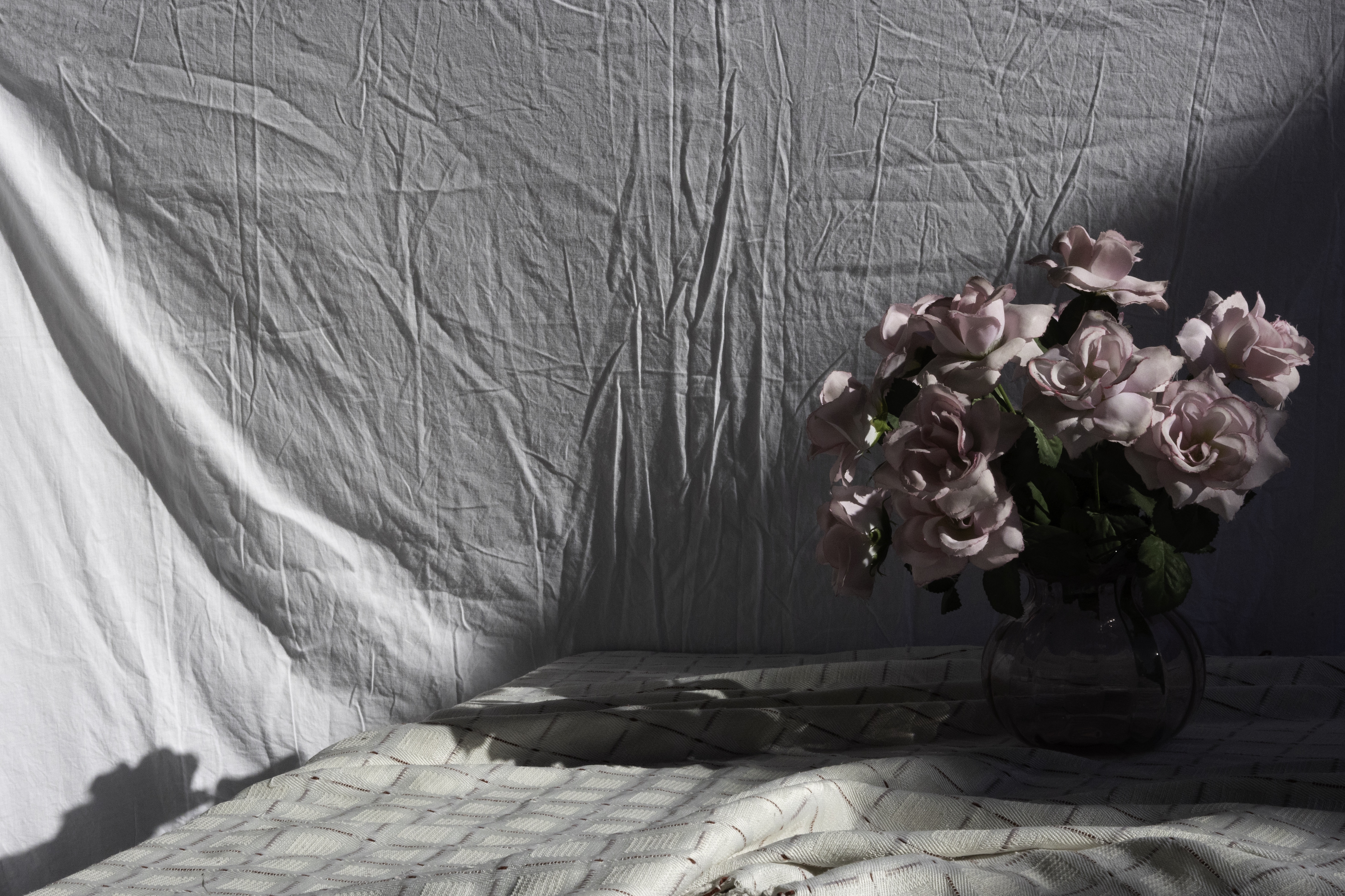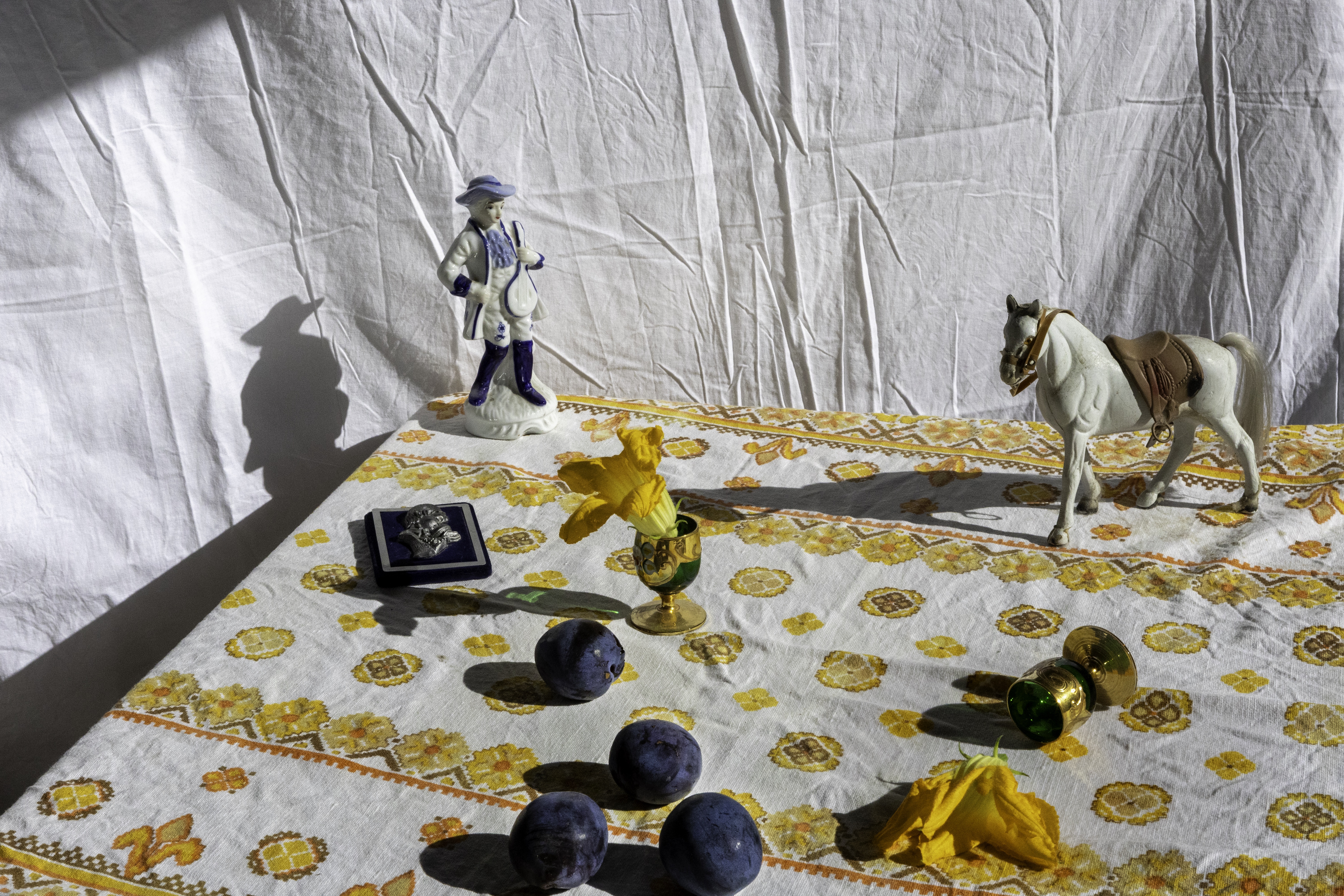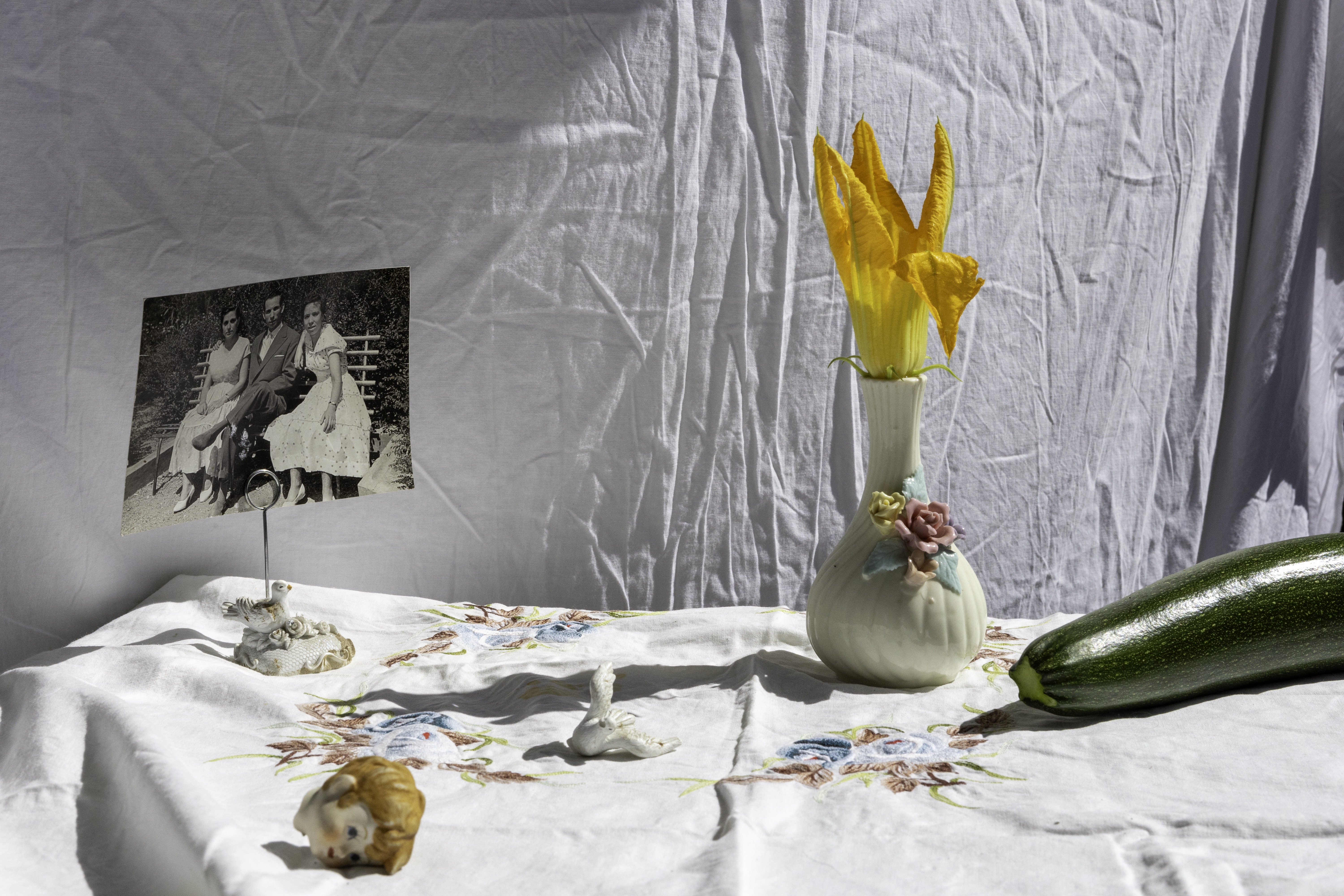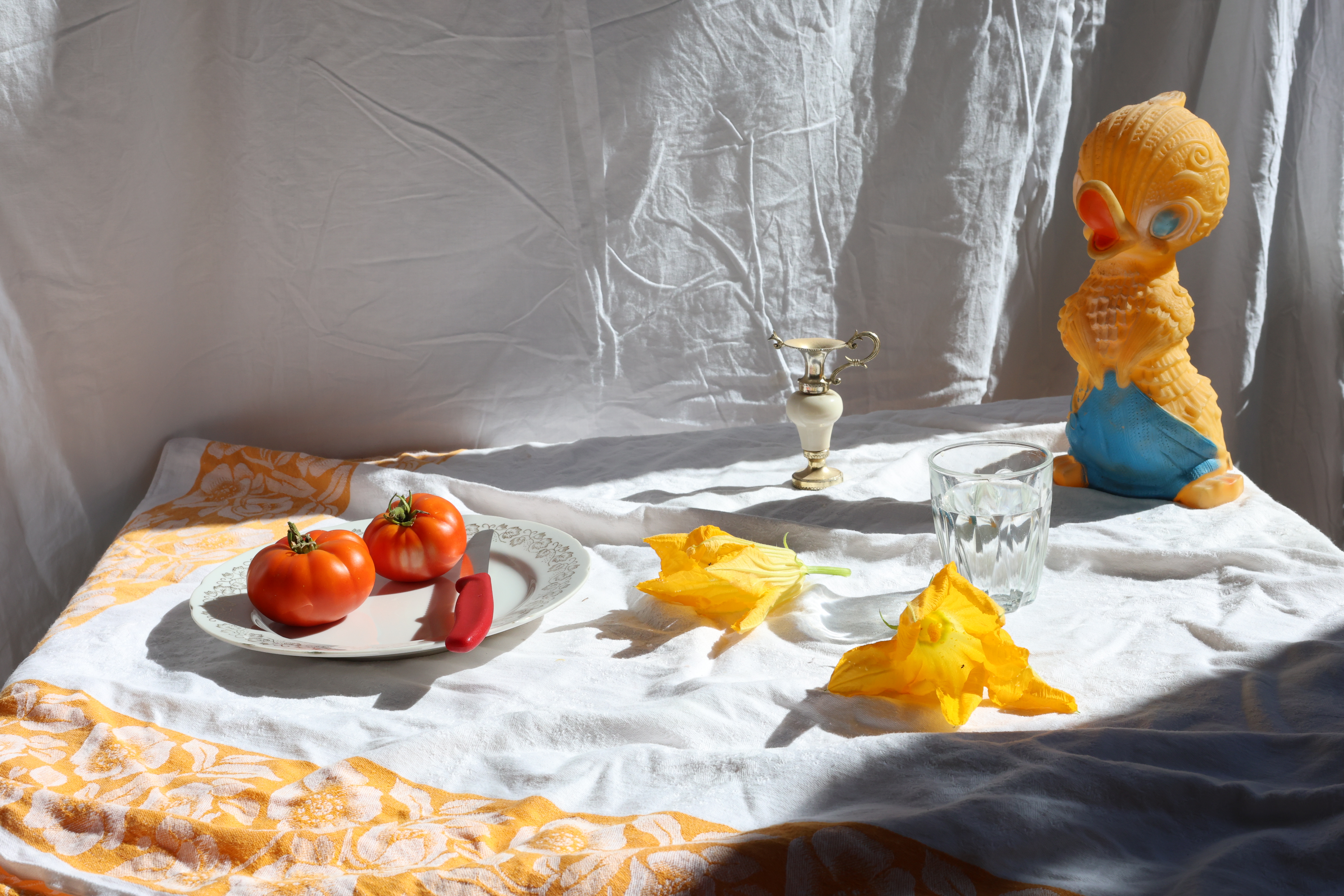 The photographs are made daily during her current visit, staged on a table in the backyard using natural morning light. Organic matter harvested from her mother’s garden that same day—flowers, fruit, vegetables—is incorporated into each composition, introducing temporality, decay, and care into the frame. This ritualized process becomes an act of quiet witnessing: a way to slow time, to archive what is at risk of disappearing, and to honor the domestic space as a site of memory, labor, and unresolved attachment.