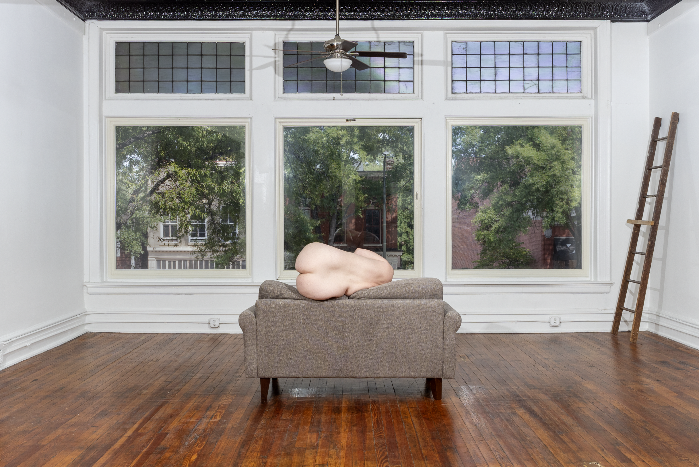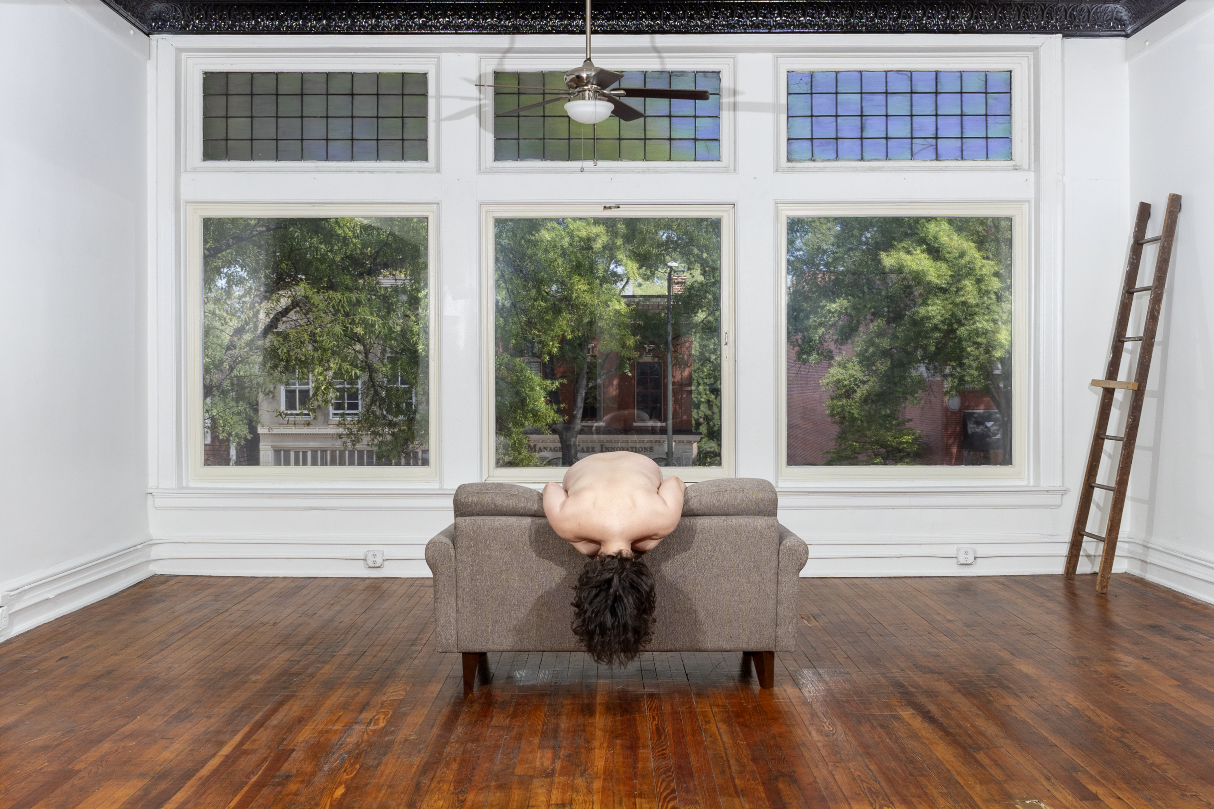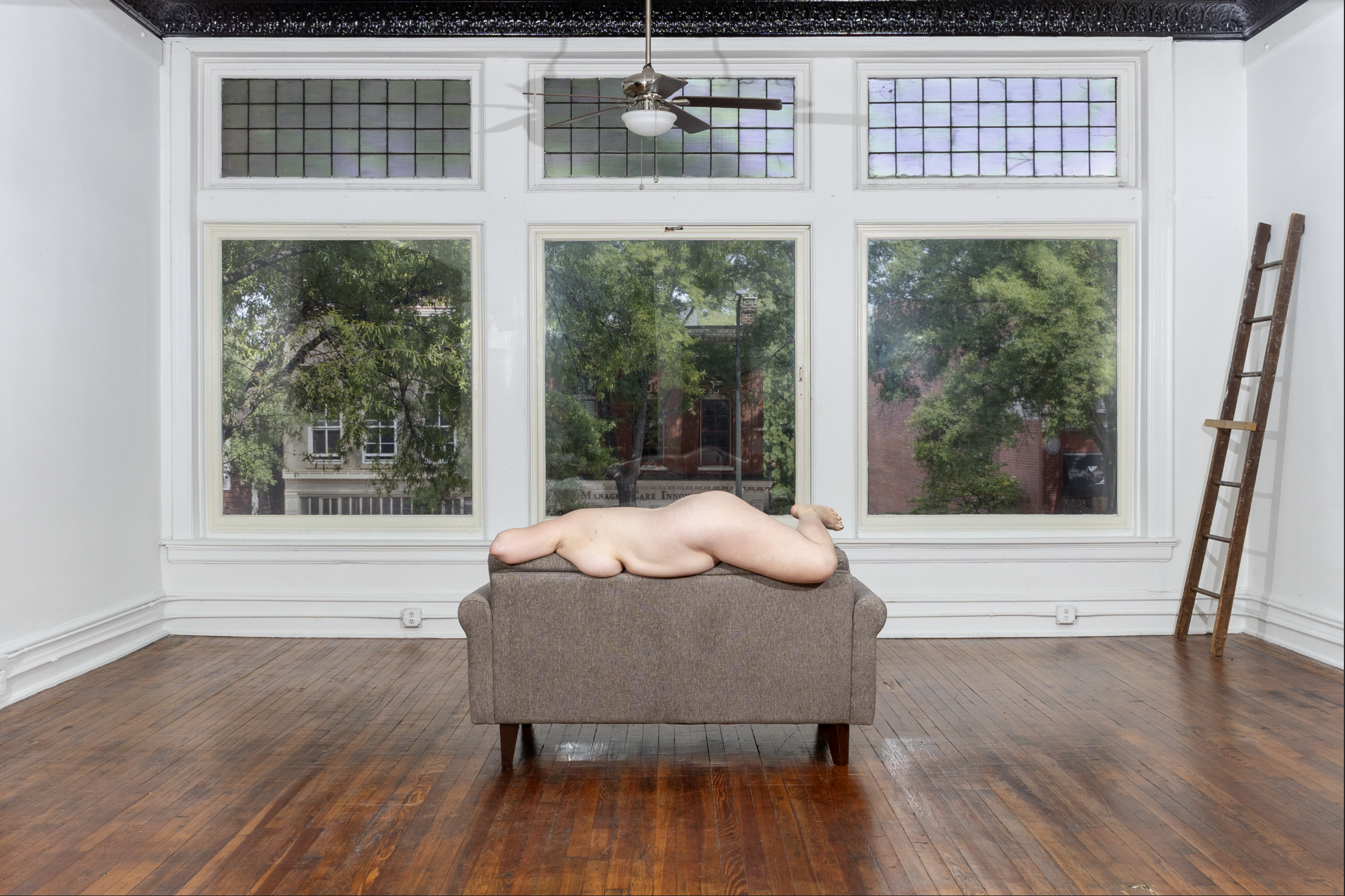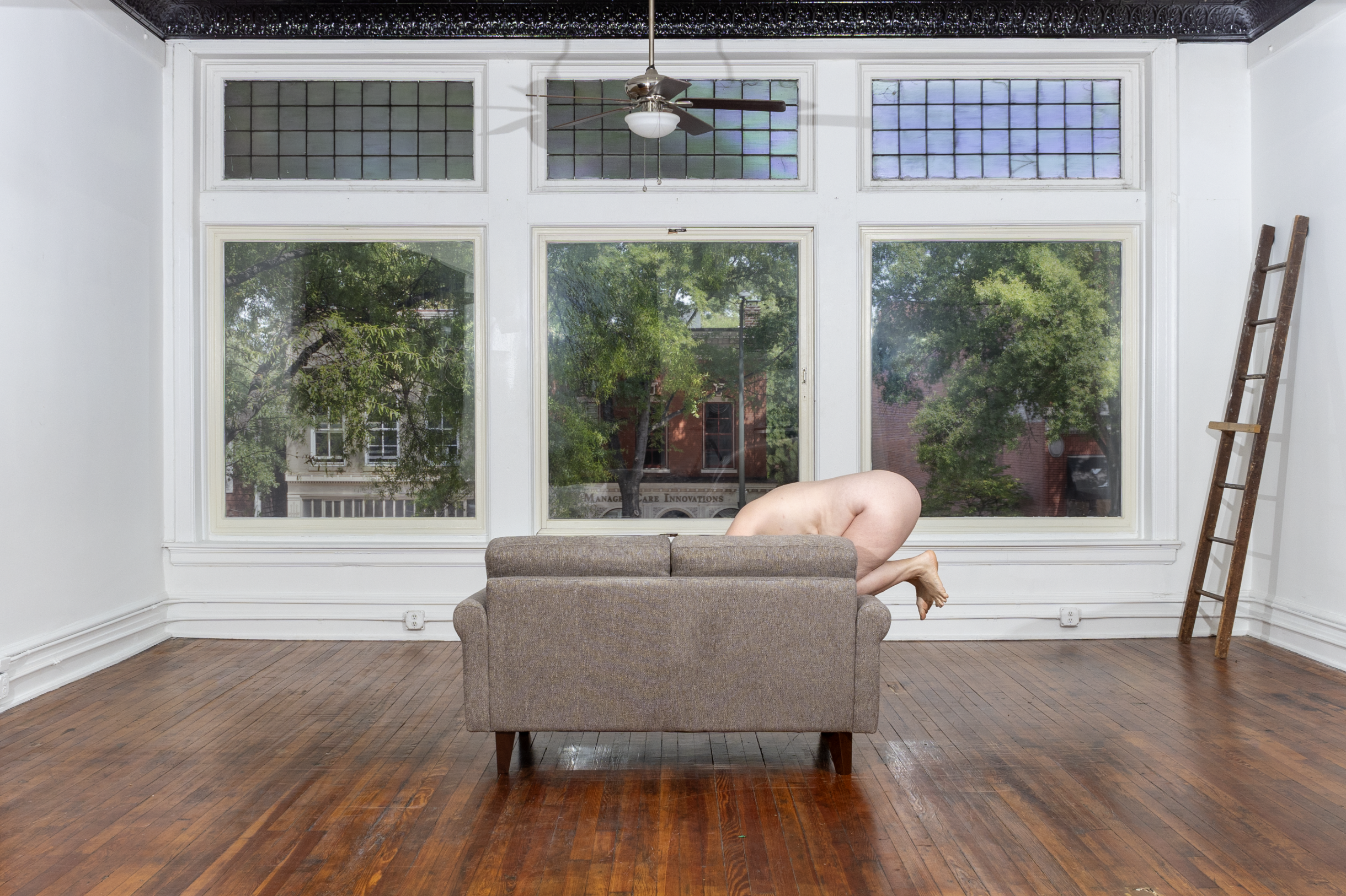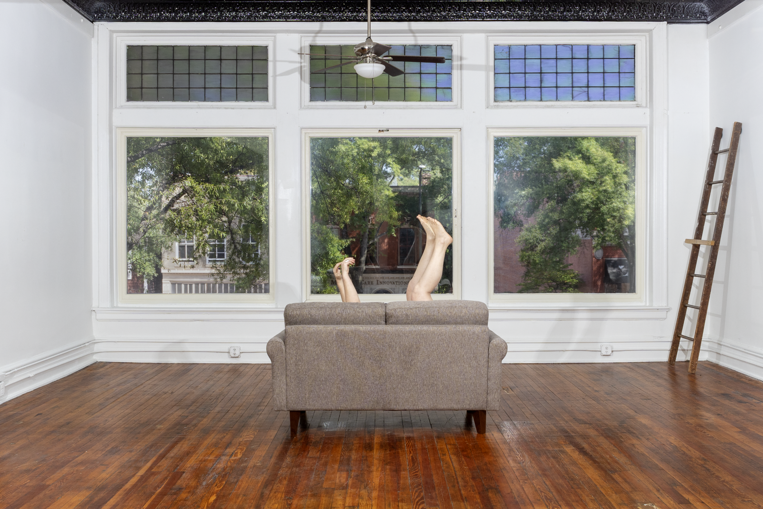 During her residency at 1708 Gallery in Richmond, Virginia, Santina focused on the empty living room that became her studio—a space stripped of the typical markers of domestic life, save for a grey couch. This absence of objects heightened her awareness of the body’s role in defining and occupying space. In this photographic series, the couch becomes a stage upon which she engages with the stillness and isolation of the environment, reflecting on the home as both a site of comfort and confinement.