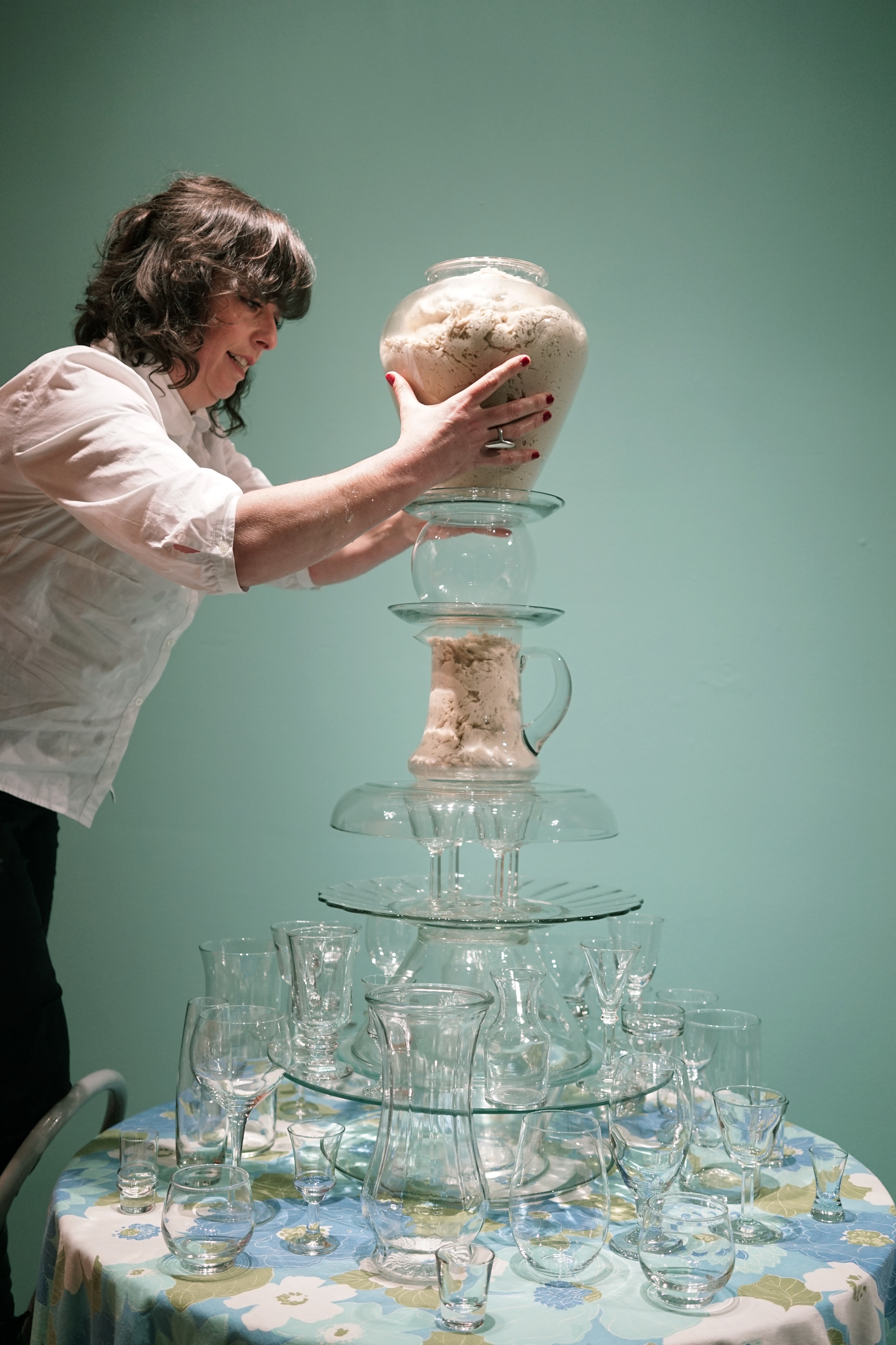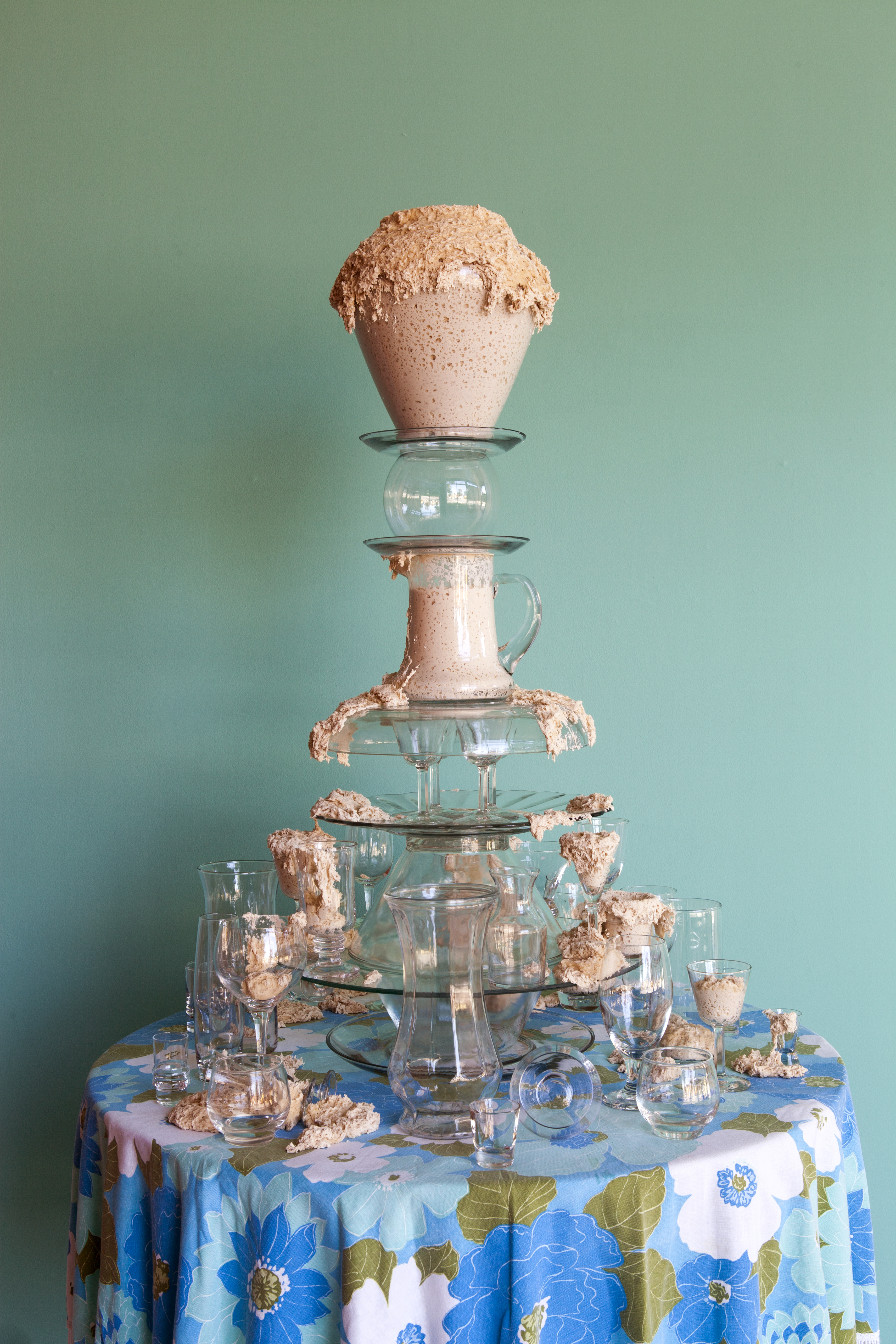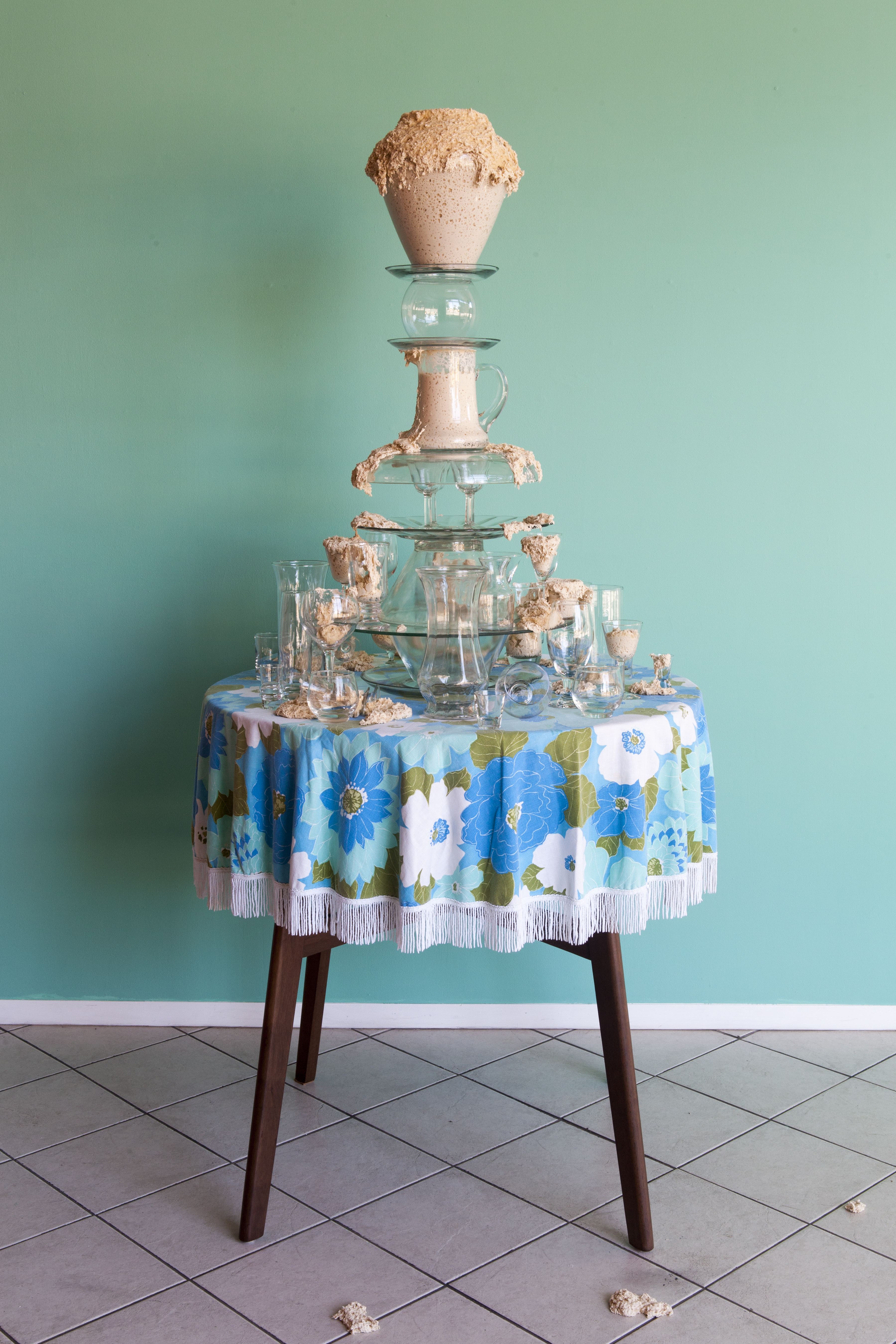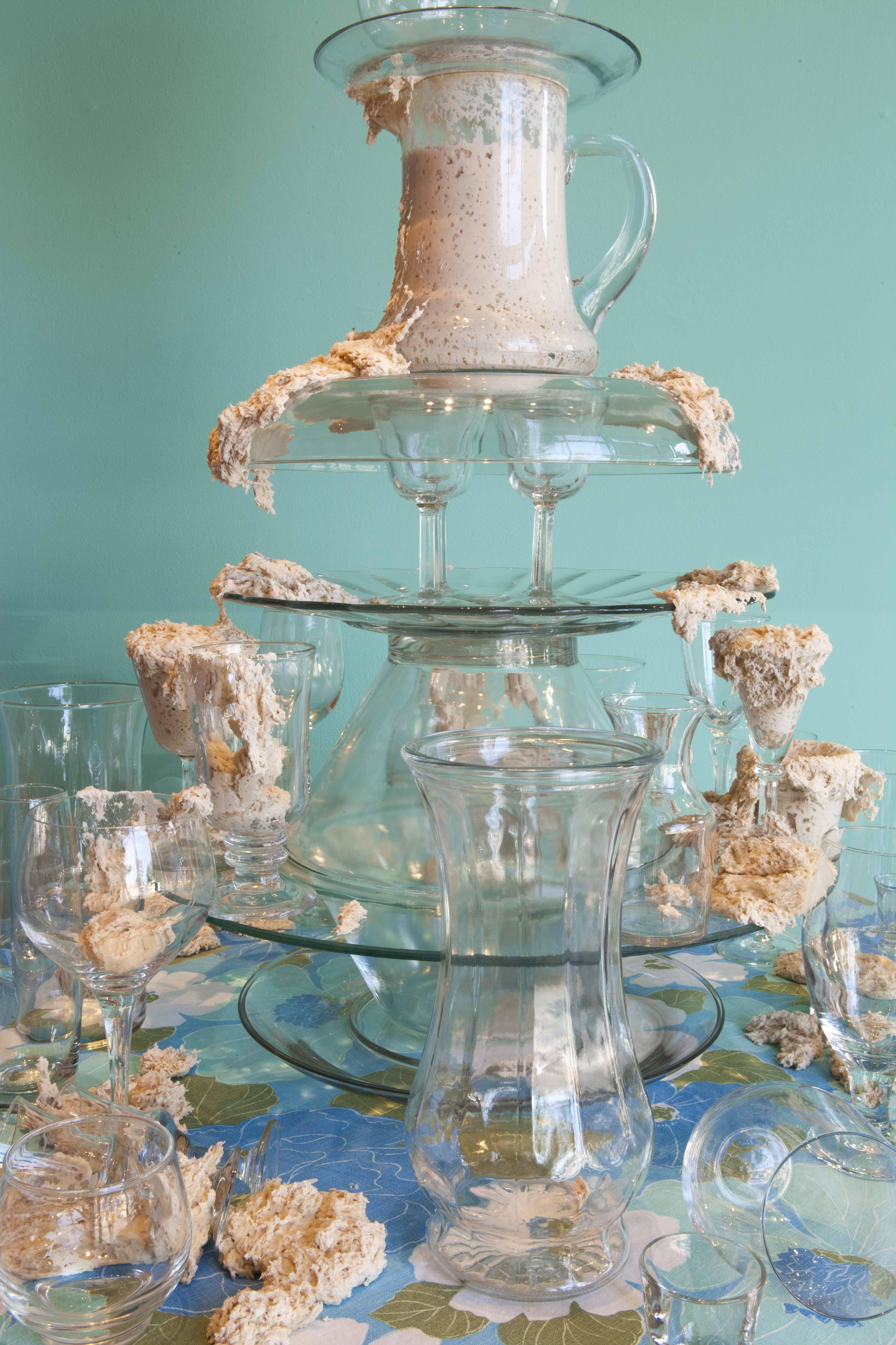 I’ve created these towers, or fountains, using these once discarded household objects. By placing dough at the center of my work, both my imagination and that of my audience, is captured. Captivated by its materiality and the way it moves in space, we don’t actually notice that we develop an expectation for the way it should behave within the scenarios I create. We watch, ever so closely at each tiny movement in the hope that that particular movement will be the one that satisfies us; that bit, right there, that’s about to fall! It will satisfy us, give us pleasure, give us what we expect when watching dough move slowly, especially in this scenario where it is slithering around the strength and fragility of glass. We want the dough to perform in a particular way; in this case, we want the dough to destroy the scene. Instead, the dough fails to deliver. It keeps us in a suspended state of wanting in its failure to deliver. The expectation does not go away with every scenario I create for the dough. If anything, with each ‘failed’ performance, the dough actually increases both my desire, and that of my audience, to keep seeking that sweet spot of satisfaction that is an end result, that actually never comes.”