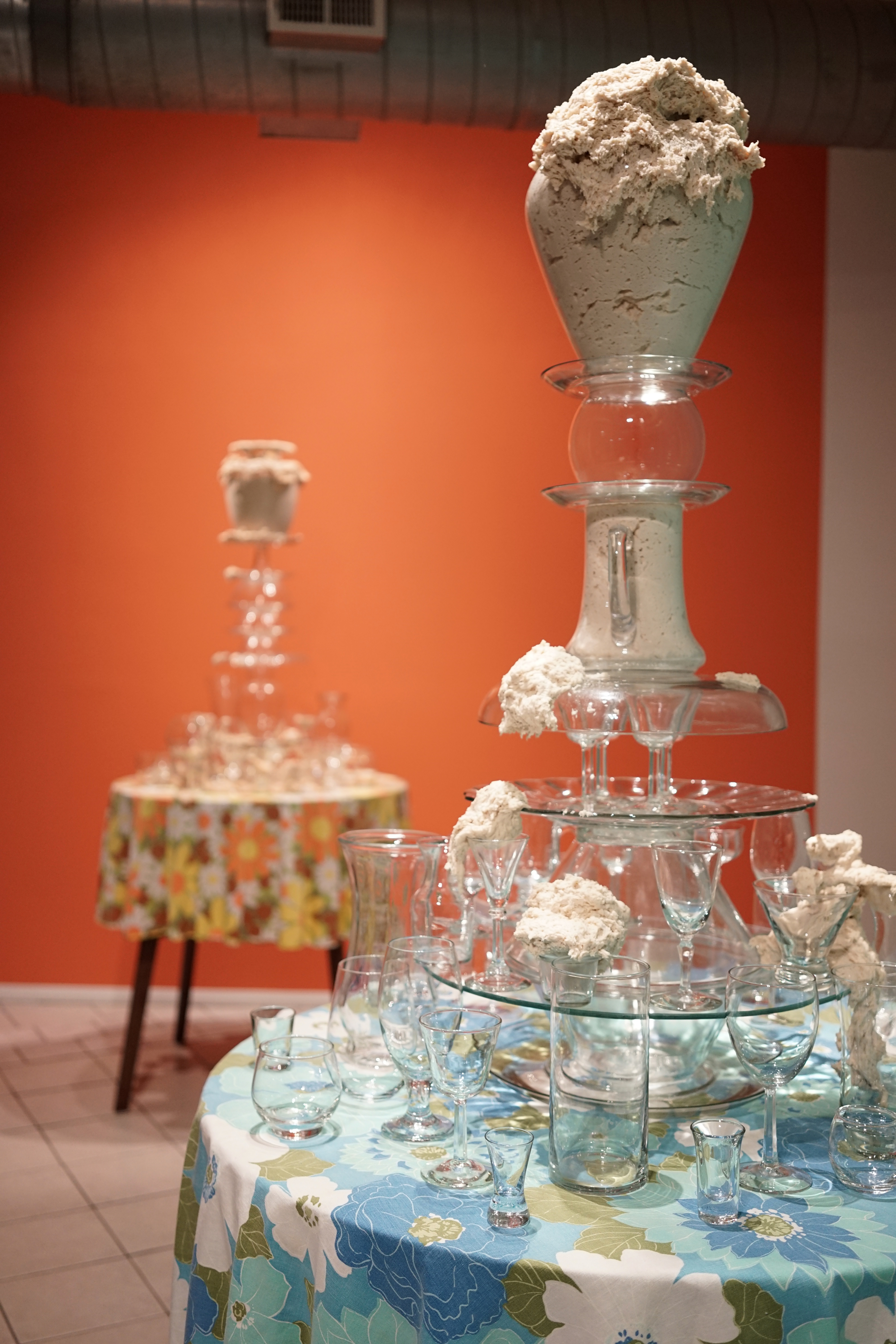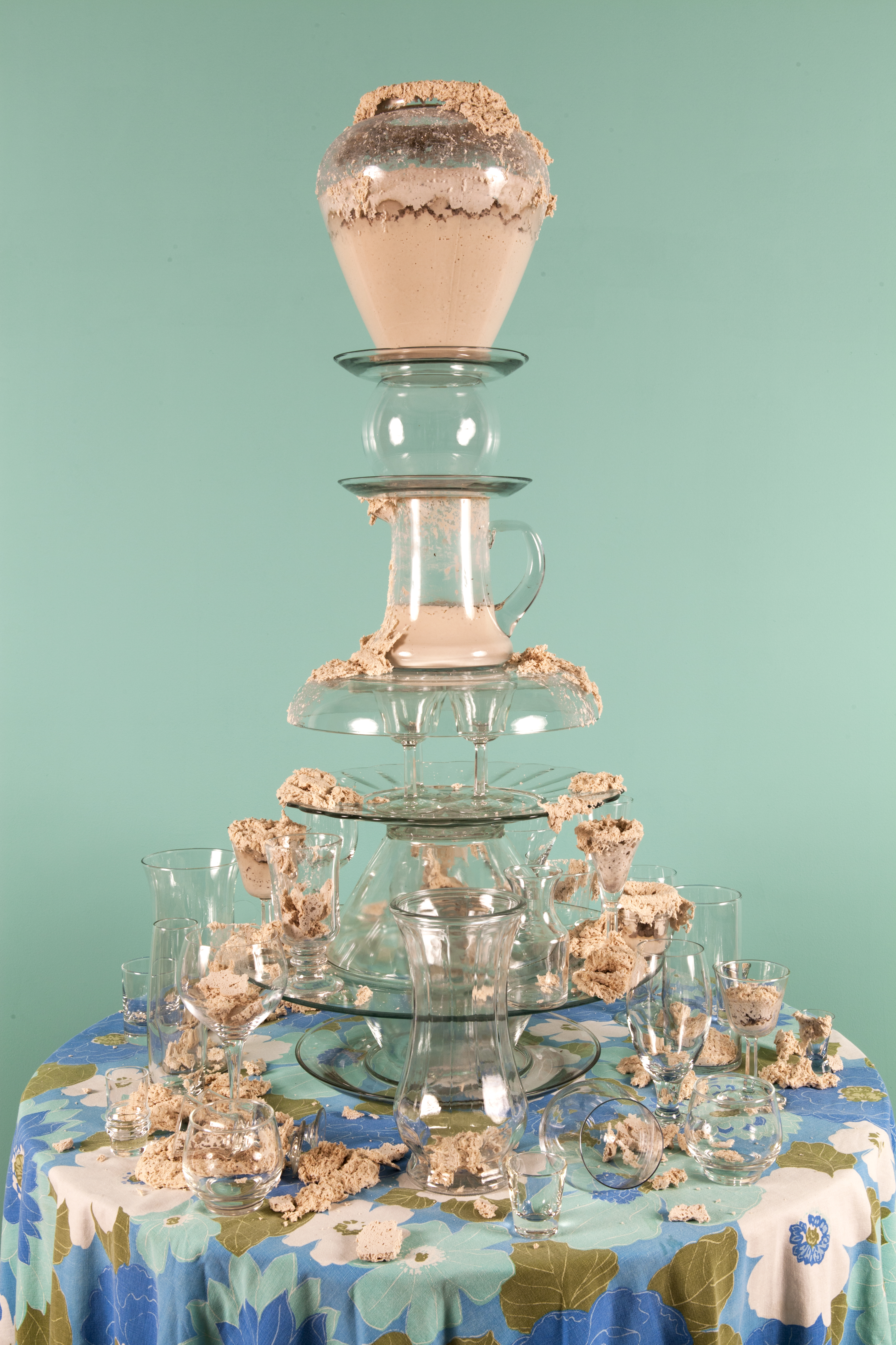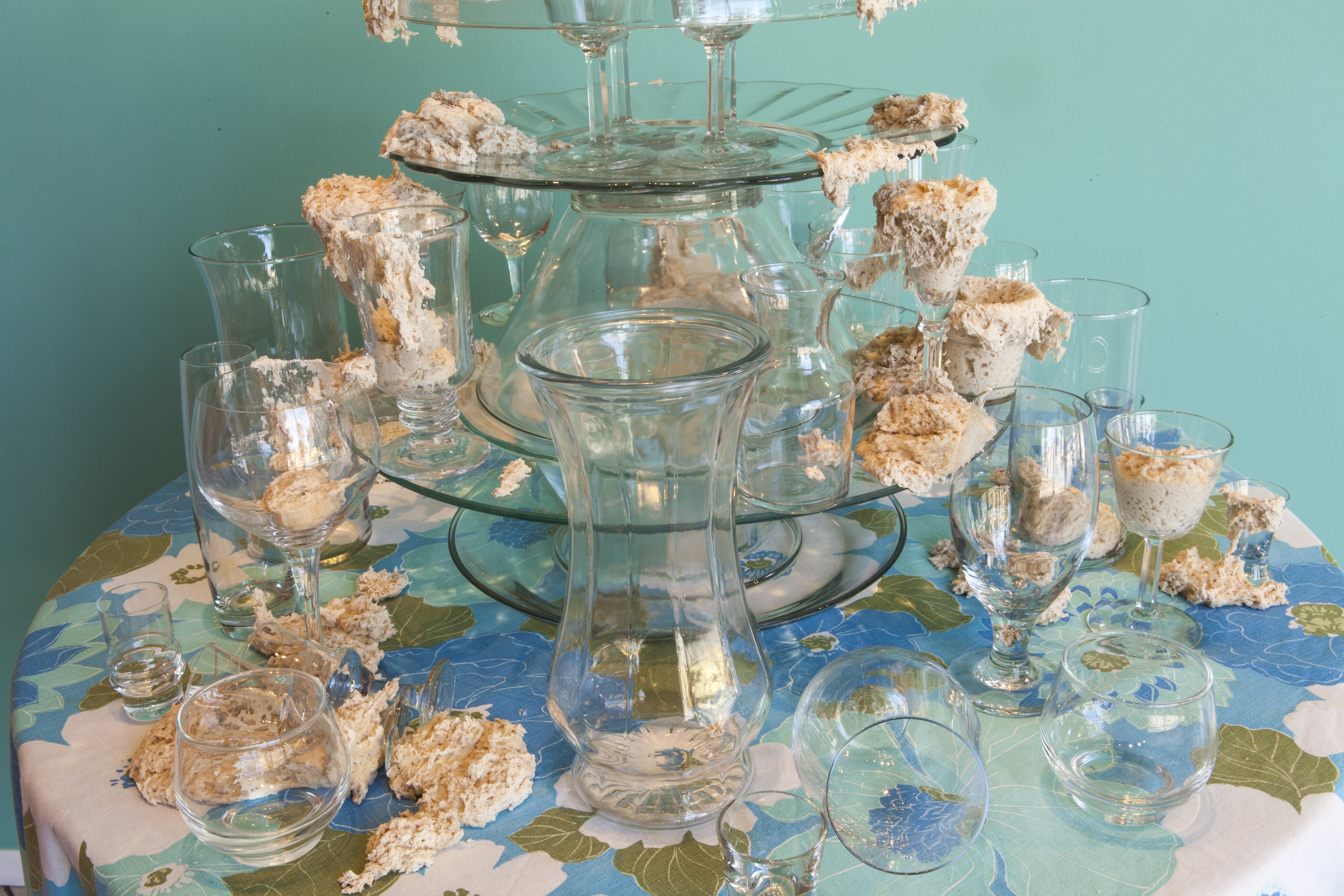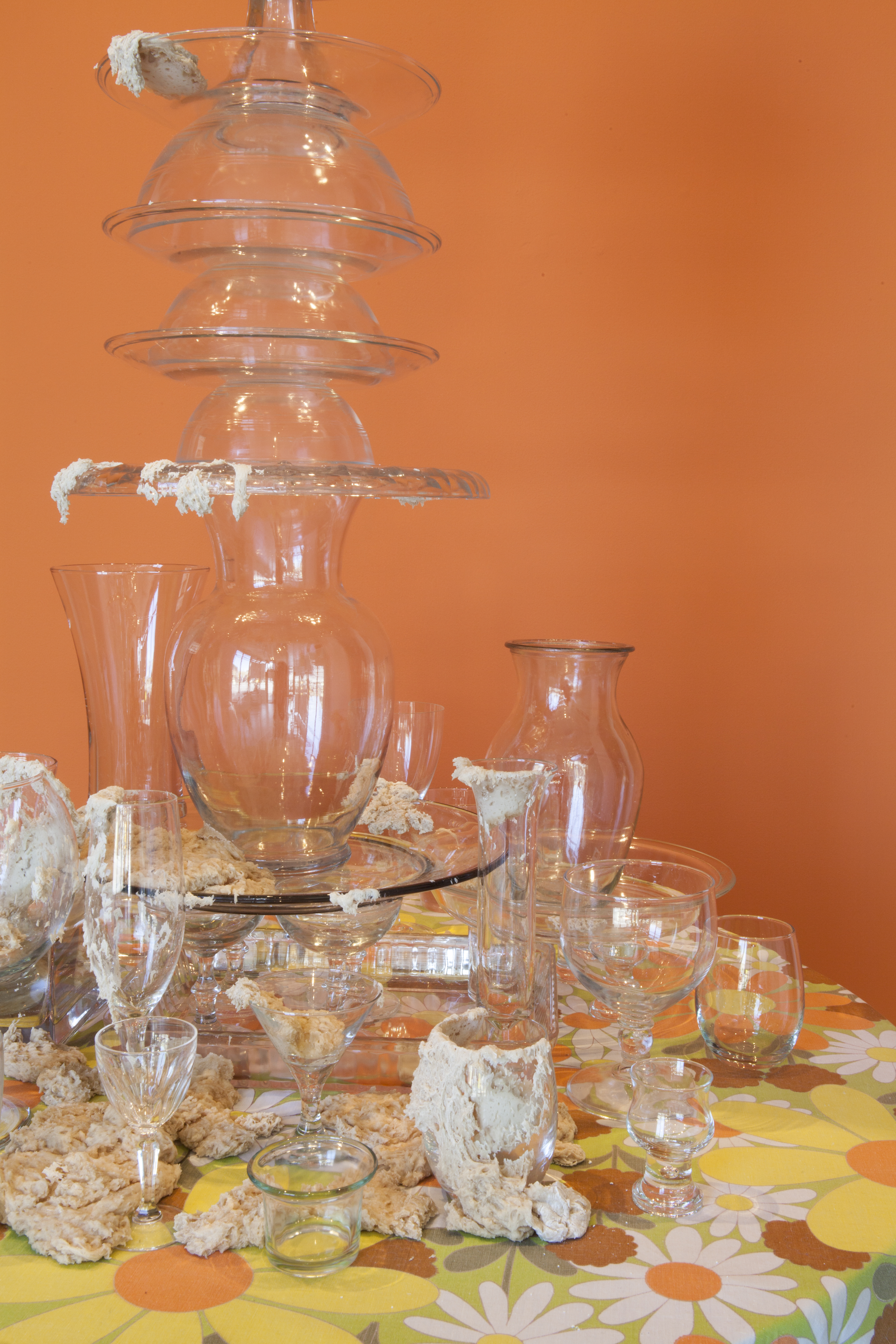 I’ve created these towers, or fountains, using these once discarded household objects. By placing dough at the center of my work, both my imagination and that of my audience, is captured. Captivated by its materiality and the way it moves in space, we don’t actually notice that we develop an expectation for the way it should behave within the scenarios I create. We watch, ever so closely at each tiny movement in the hope that that particular movement will be the one that satisfies us; that bit, right there, that’s about to fall! It will satisfy us, give us pleasure, give us what we expect when watching dough move slowly, especially in this scenario where it is slithering around the strength and fragility of glass. We want the dough to perform in a particular way; in this case, we want the dough to destroy the scene. Instead, the dough fails to deliver. It keeps us in a suspended state of wanting in its failure to deliver. The expectation does not go away with every scenario I create for the dough. If anything, with each ‘failed’ performance, the dough actually increases both my desire, and that of my audience, to keep seeking that sweet spot of satisfaction that is an end result, that actually never comes.”