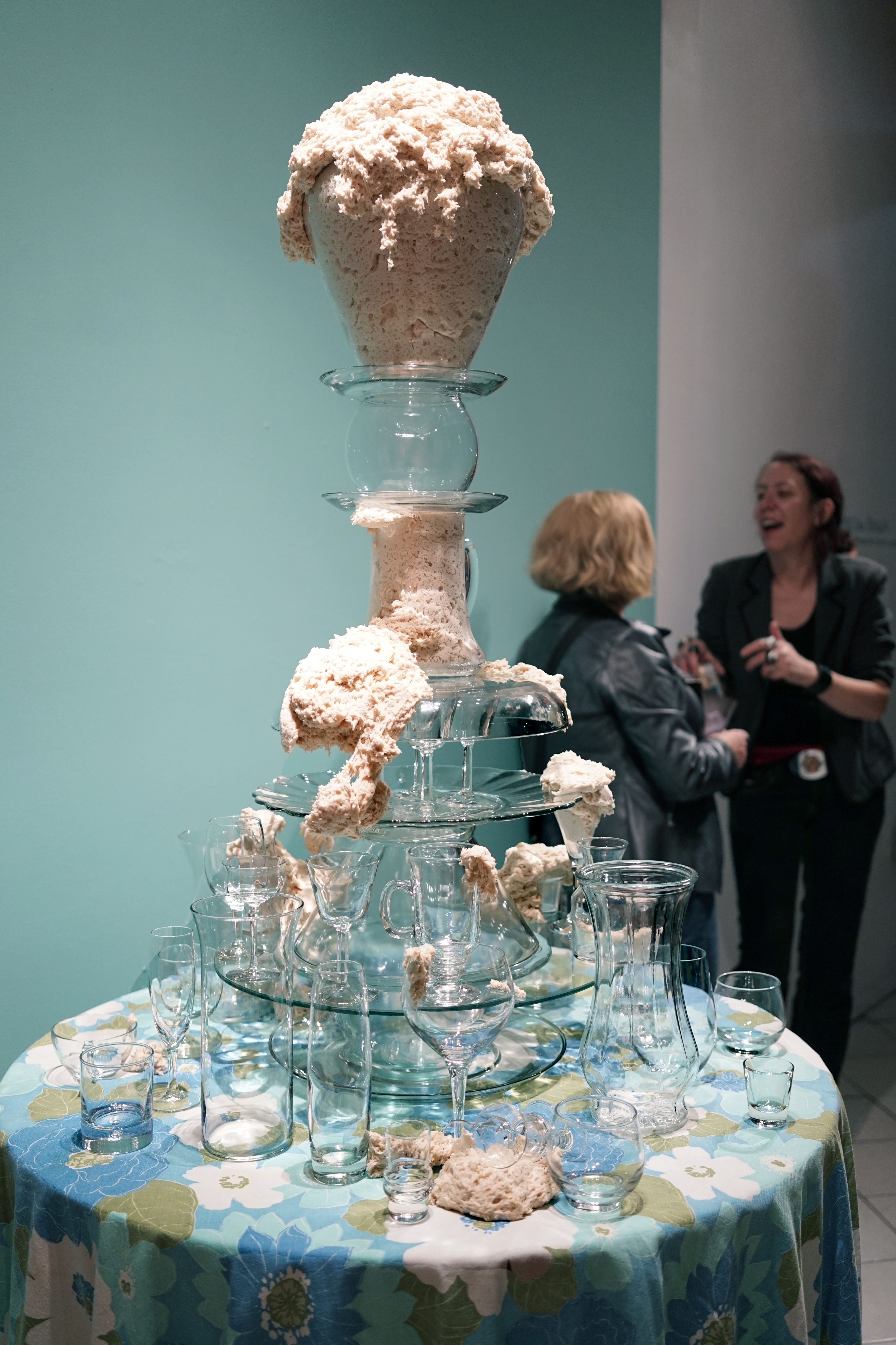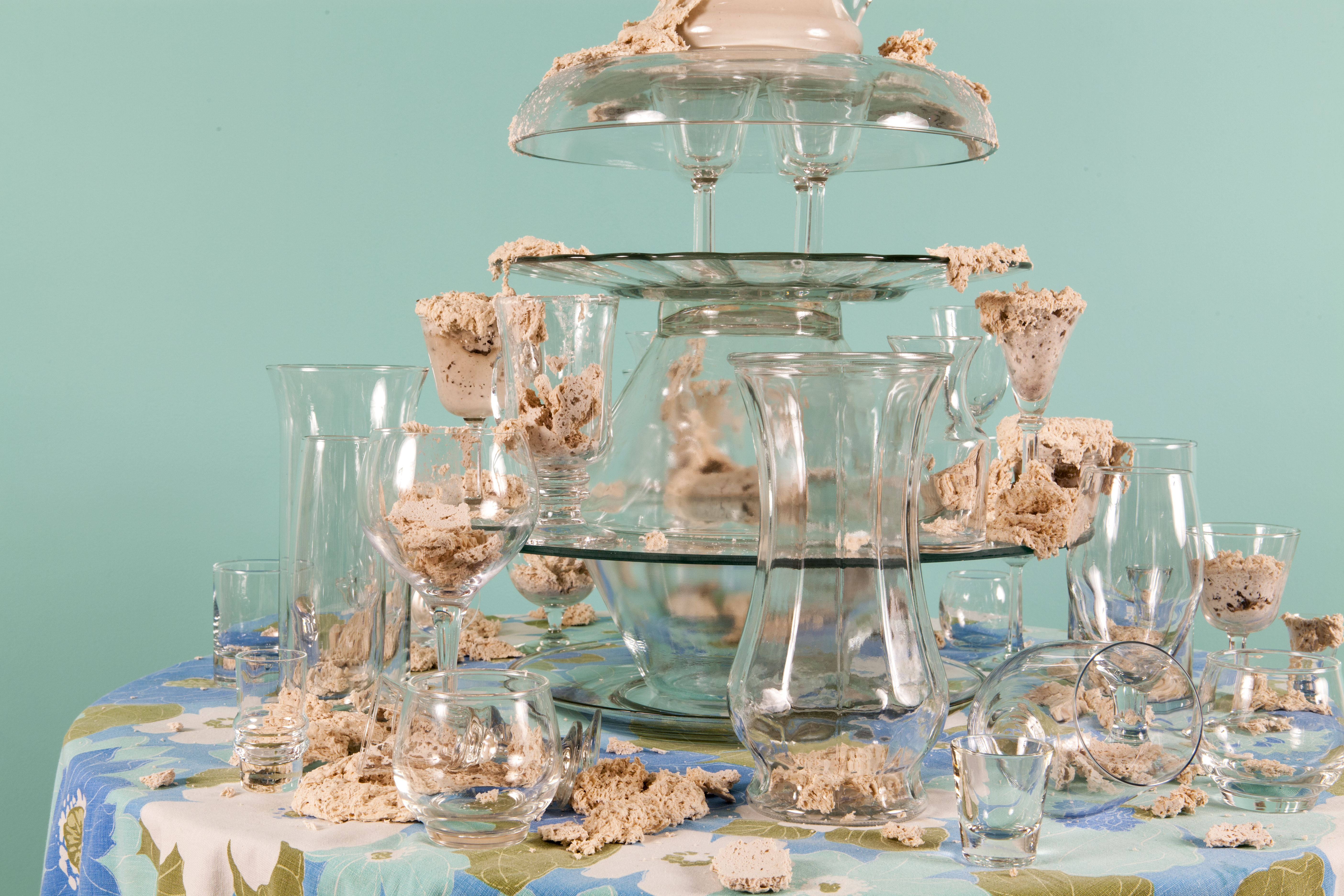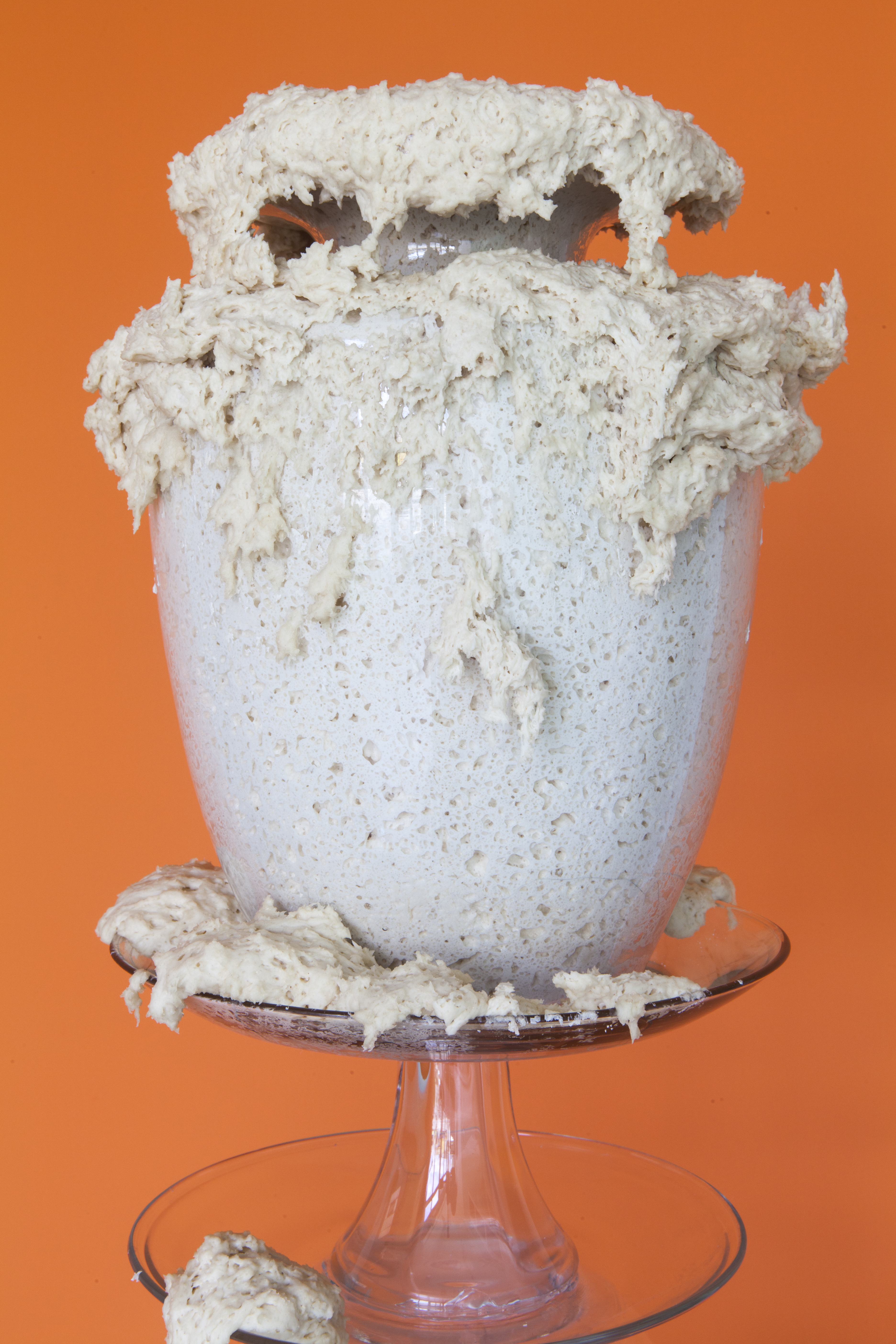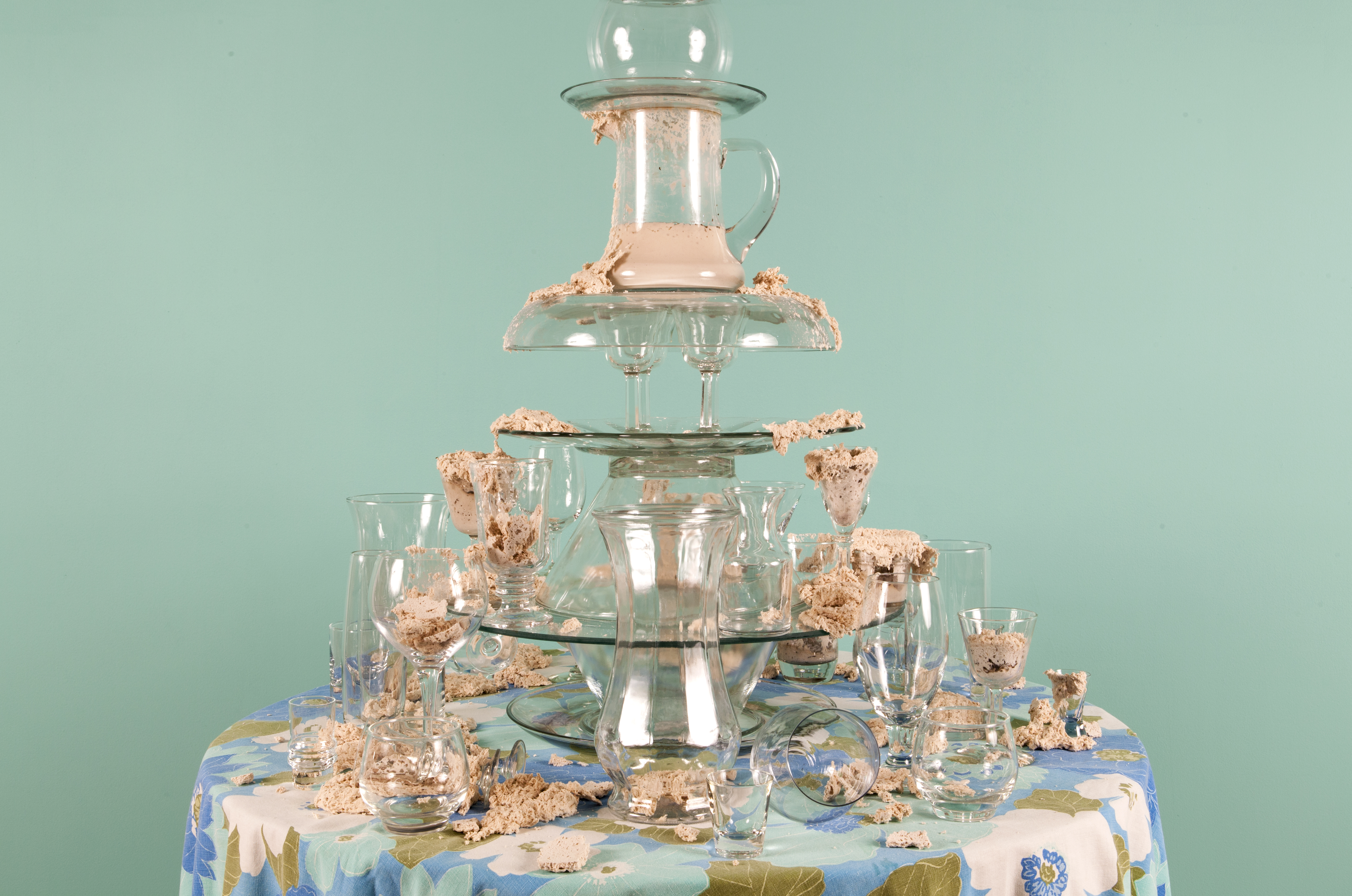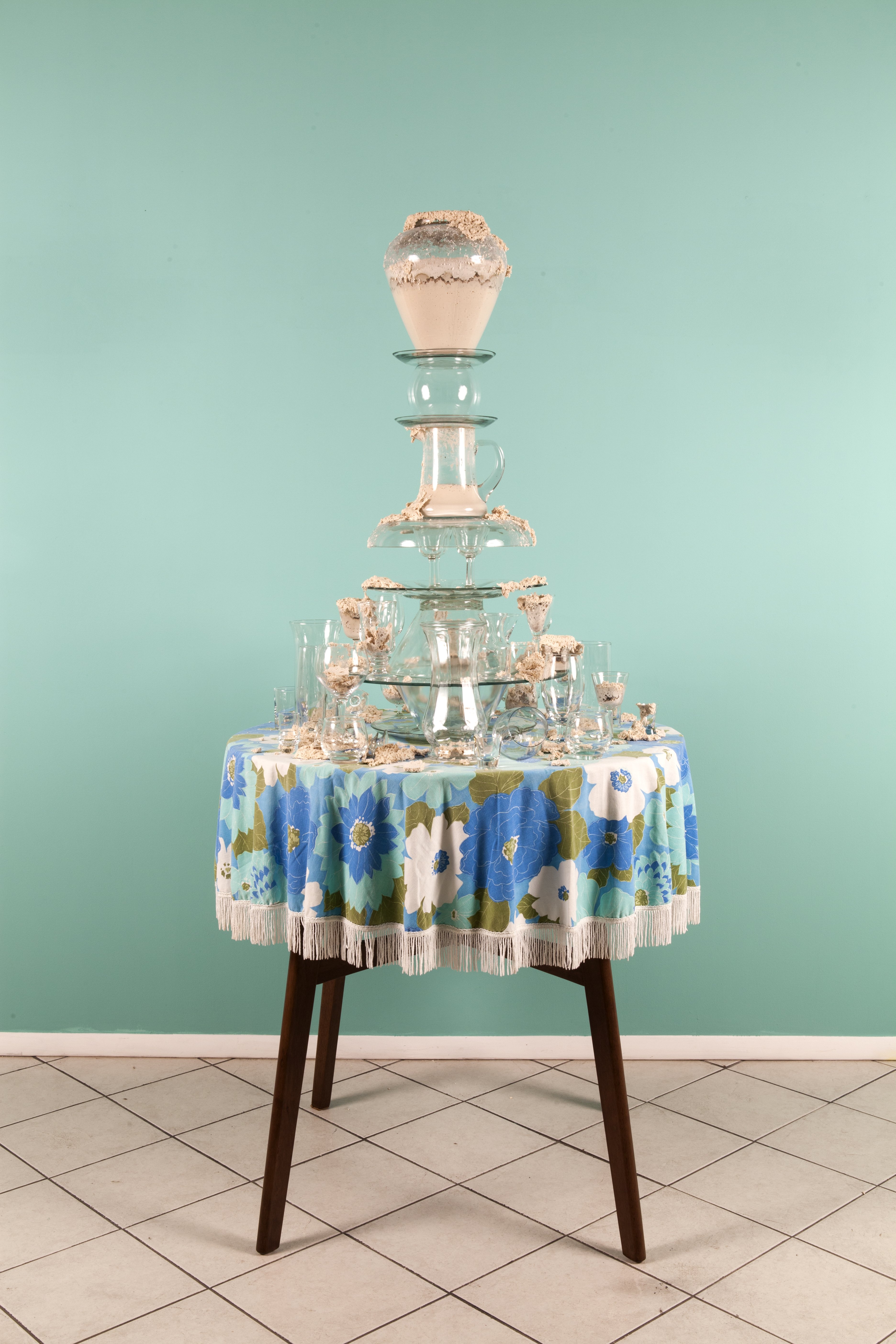 I’ve created these towers, or fountains, using these once discarded household objects. By placing dough at the center of my work, both my imagination and that of my audience, is captured. Captivated by its materiality and the way it moves in space, we don’t actually notice that we develop an expectation for the way it should behave within the scenarios I create. We watch, ever so closely at each tiny movement in the hope that that particular movement will be the one that satisfies us; that bit, right there, that’s about to fall! It will satisfy us, give us pleasure, give us what we expect when watching dough move slowly, especially in this scenario where it is slithering around the strength and fragility of glass. We want the dough to perform in a particular way; in this case, we want the dough to destroy the scene. Instead, the dough fails to deliver. It keeps us in a suspended state of wanting in its failure to deliver. The expectation does not go away with every scenario I create for the dough. If anything, with each ‘failed’ performance, the dough actually increases both my desire, and that of my audience, to keep seeking that sweet spot of satisfaction that is an end result, that actually never comes.”