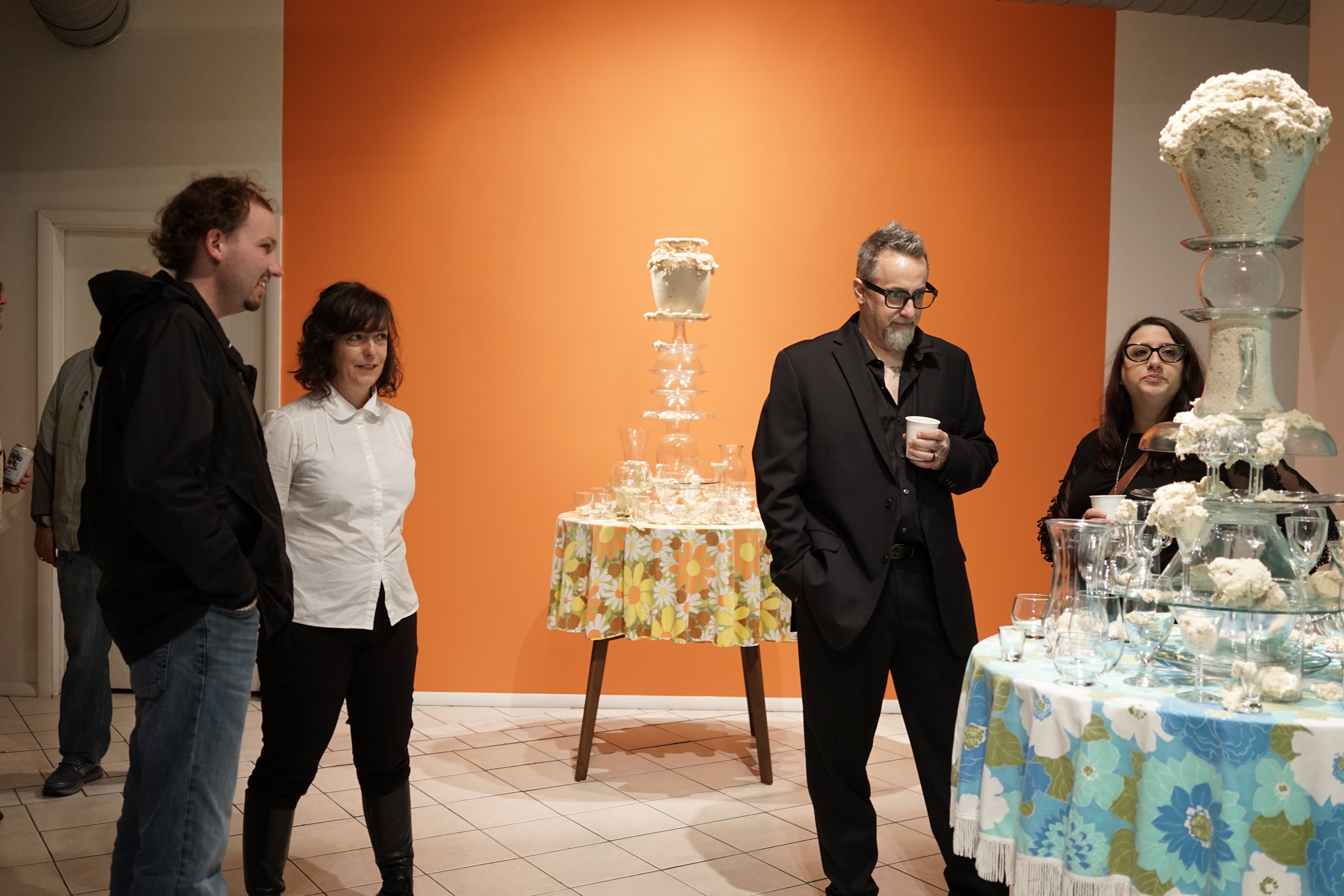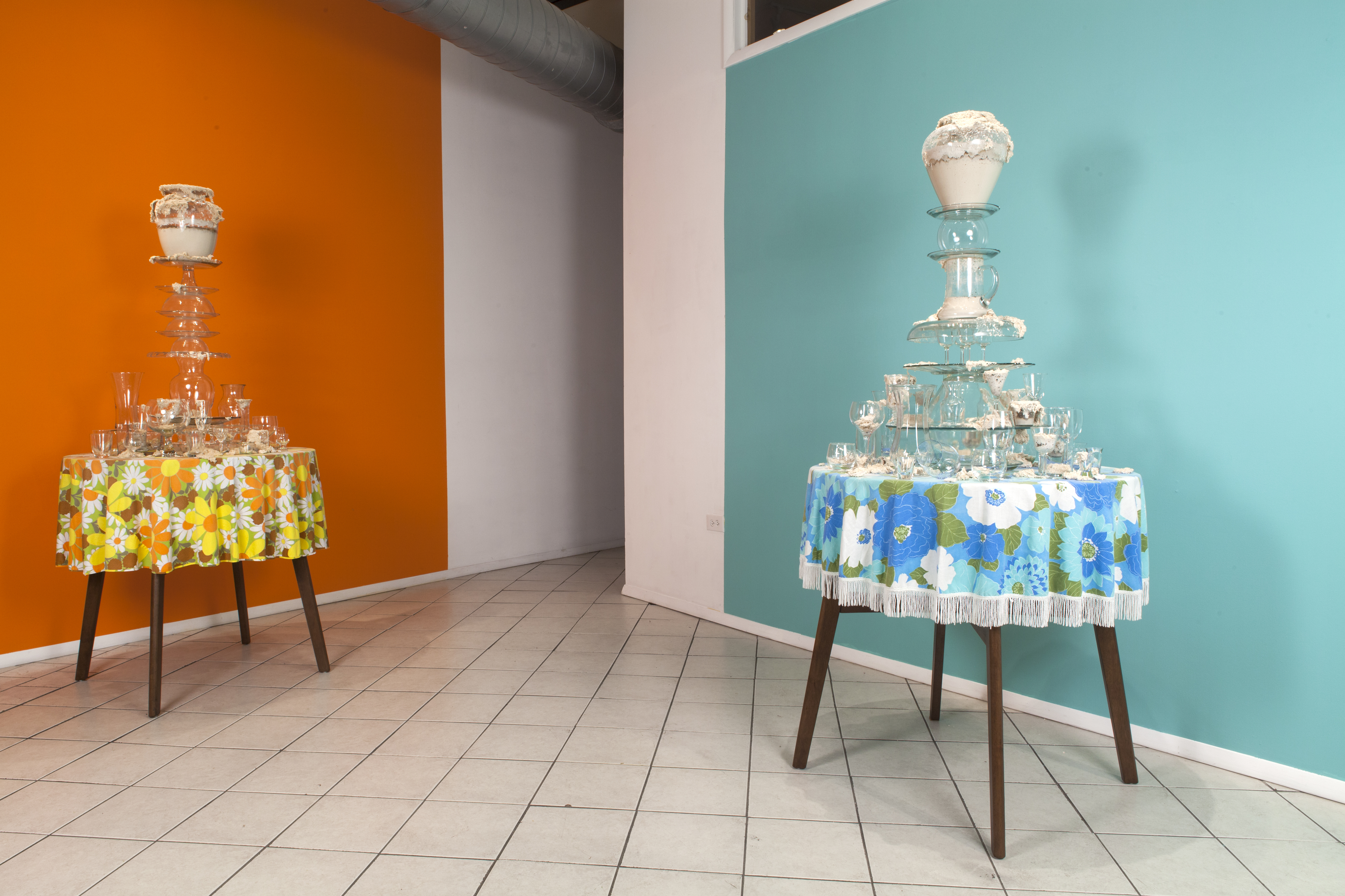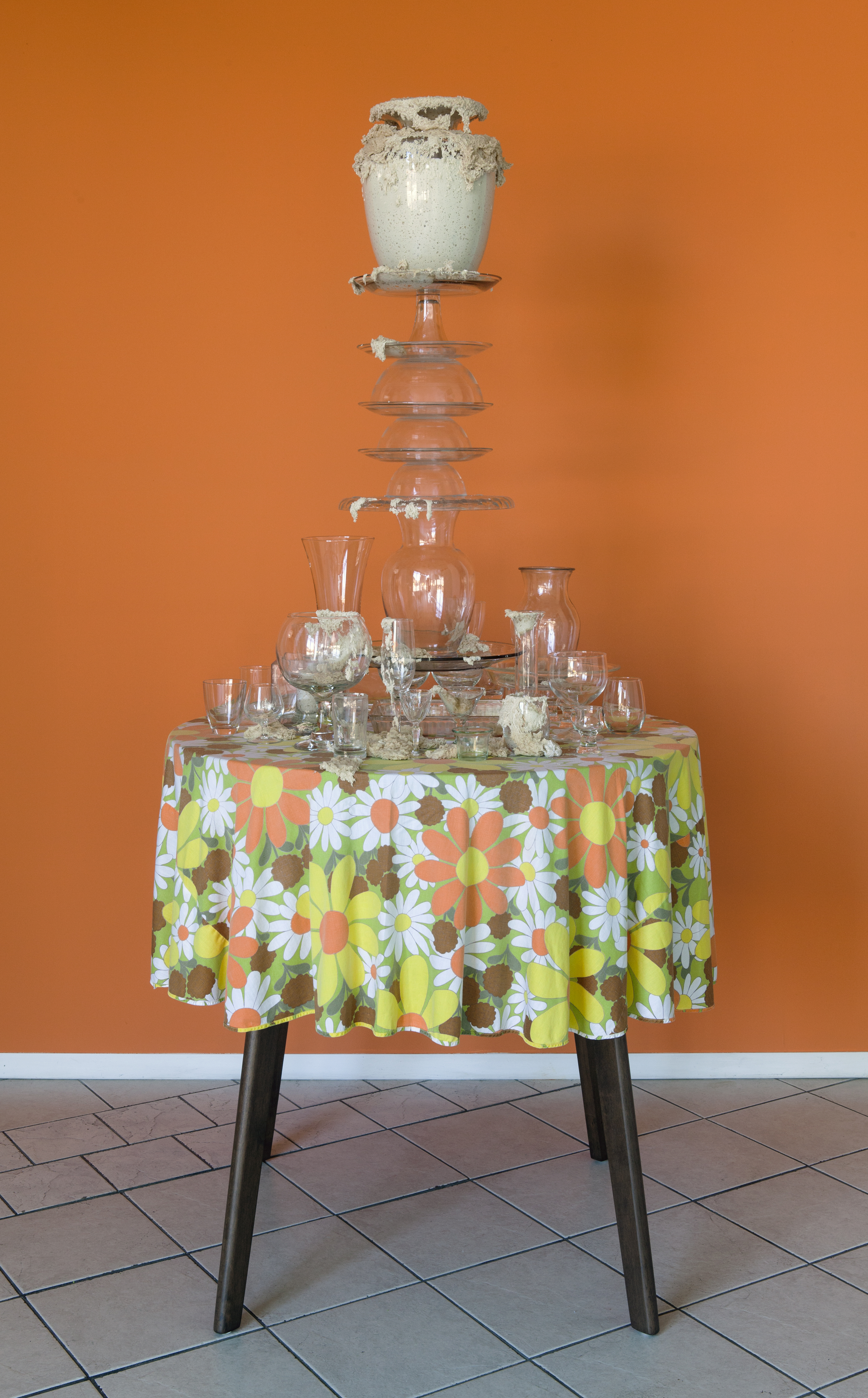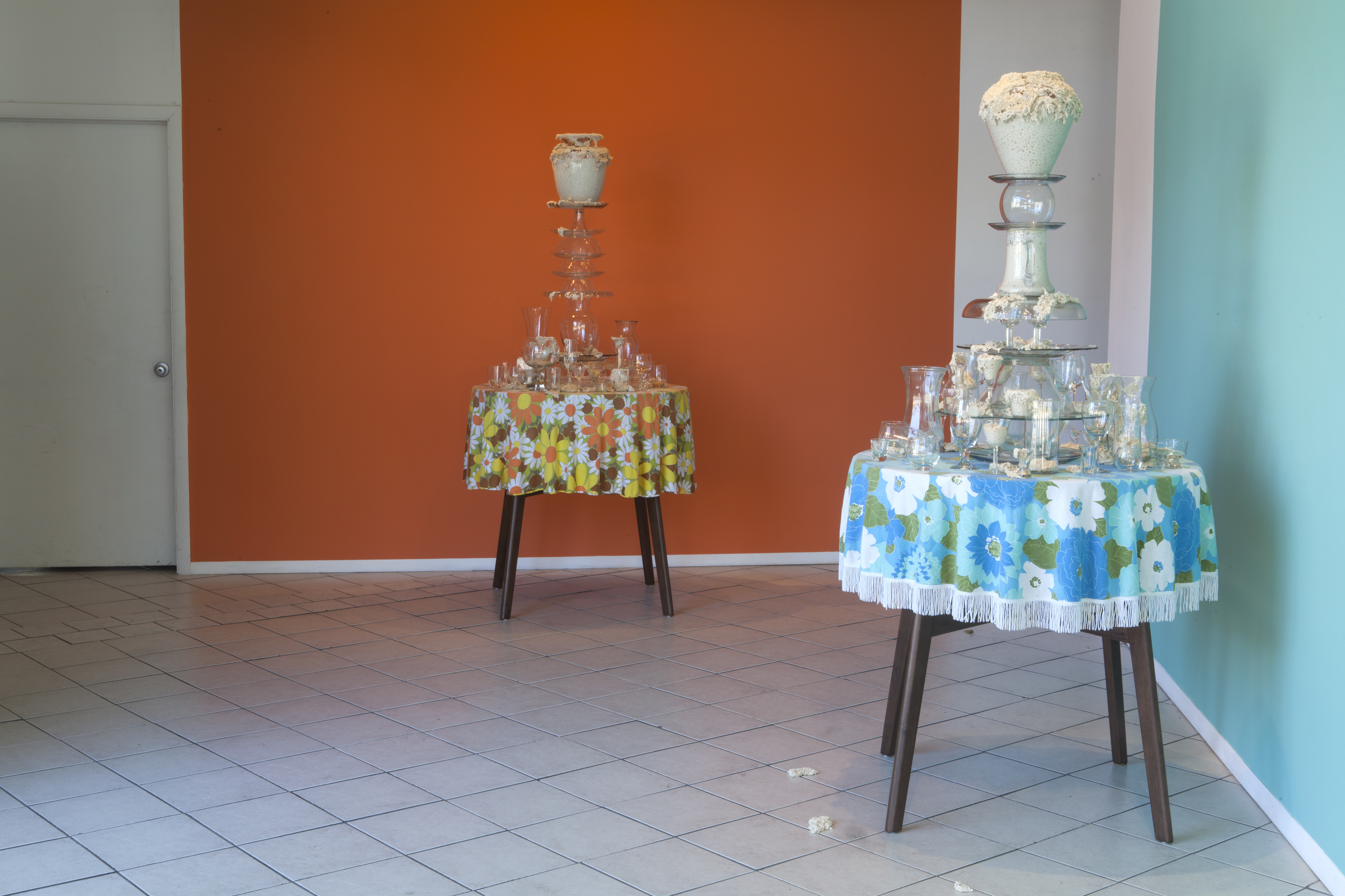 I’ve created these towers, or fountains, using these once discarded household objects. By placing dough at the center of my work, both my imagination and that of my audience, is captured. Captivated by its materiality and the way it moves in space, we don’t actually notice that we develop an expectation for the way it should behave within the scenarios I create. We watch, ever so closely at each tiny movement in the hope that that particular movement will be the one that satisfies us; that bit, right there, that’s about to fall! It will satisfy us, give us pleasure, give us what we expect when watching dough move slowly, especially in this scenario where it is slithering around the strength and fragility of glass. We want the dough to perform in a particular way; in this case, we want the dough to destroy the scene. Instead, the dough fails to deliver. It keeps us in a suspended state of wanting in its failure to deliver. The expectation does not go away with every scenario I create for the dough. If anything, with each ‘failed’ performance, the dough actually increases both my desire, and that of my audience, to keep seeking that sweet spot of satisfaction that is an end result, that actually never comes.”