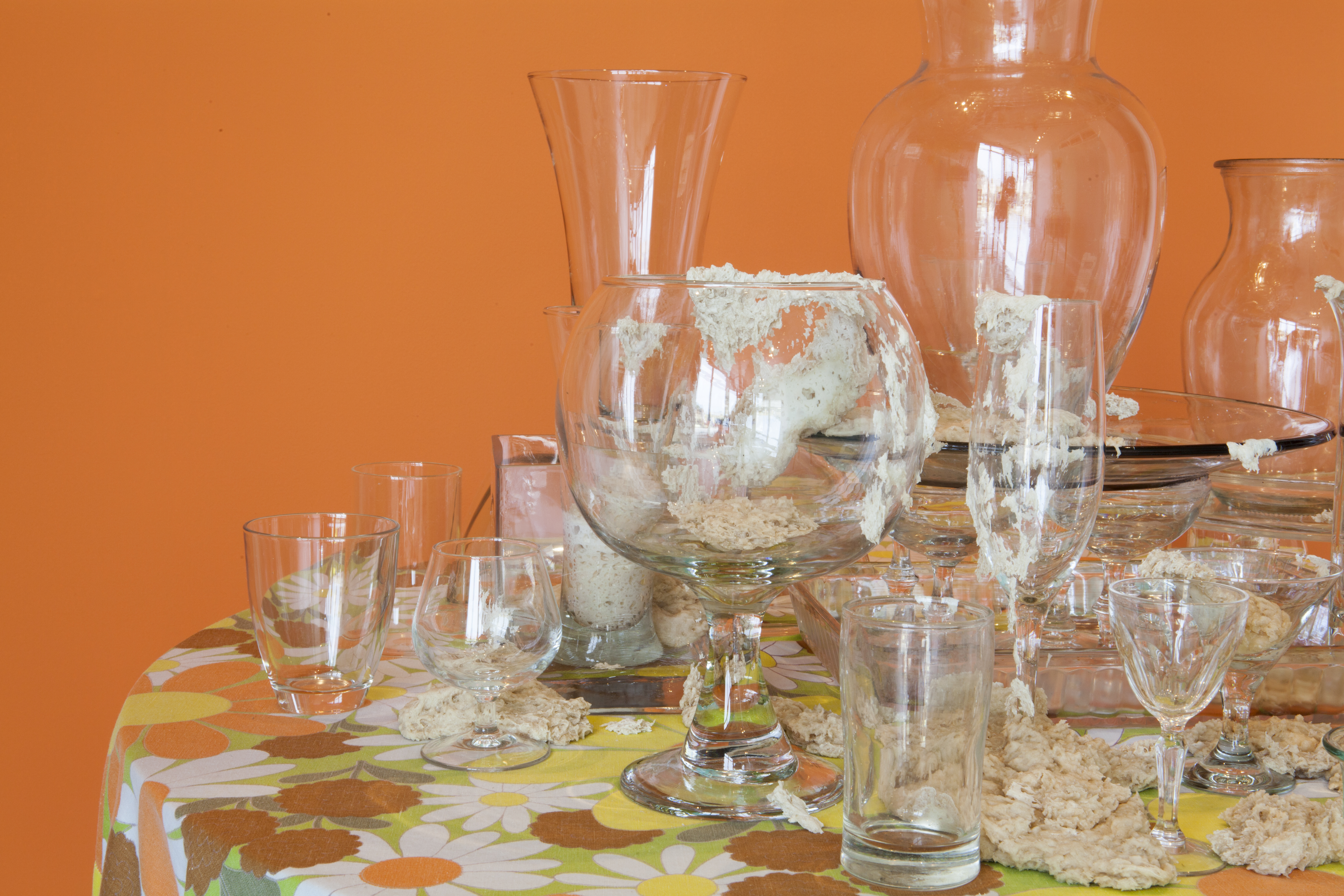 “Glass has been a difficult material to work with and has brought out the most delightful of challenges, that of strength and fragility co-existing. The glassware itself was purchased from local thrift stores and my intention is for them to be returned to the shelves to await their forever homes, having momentarily existed in this exhibition.