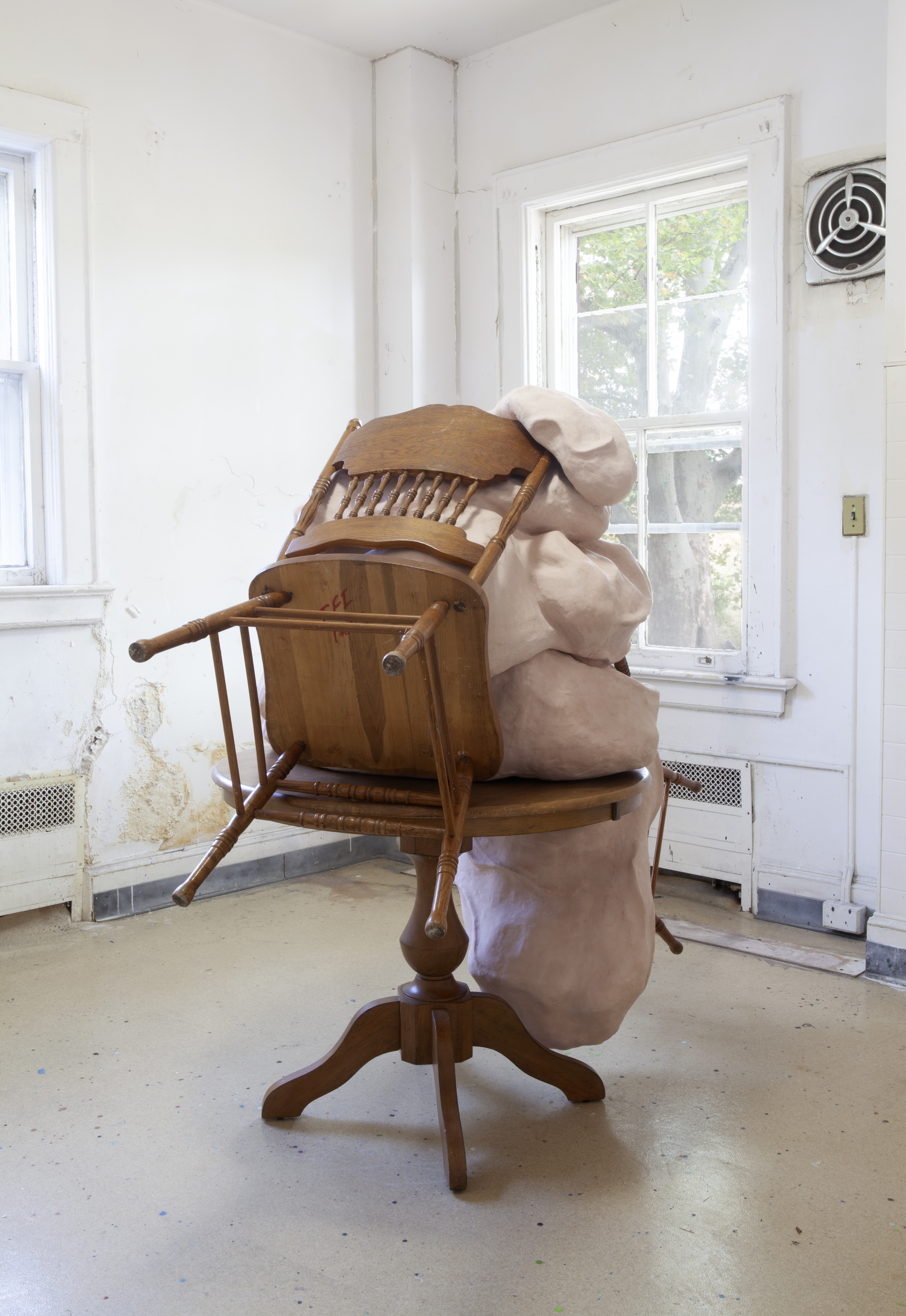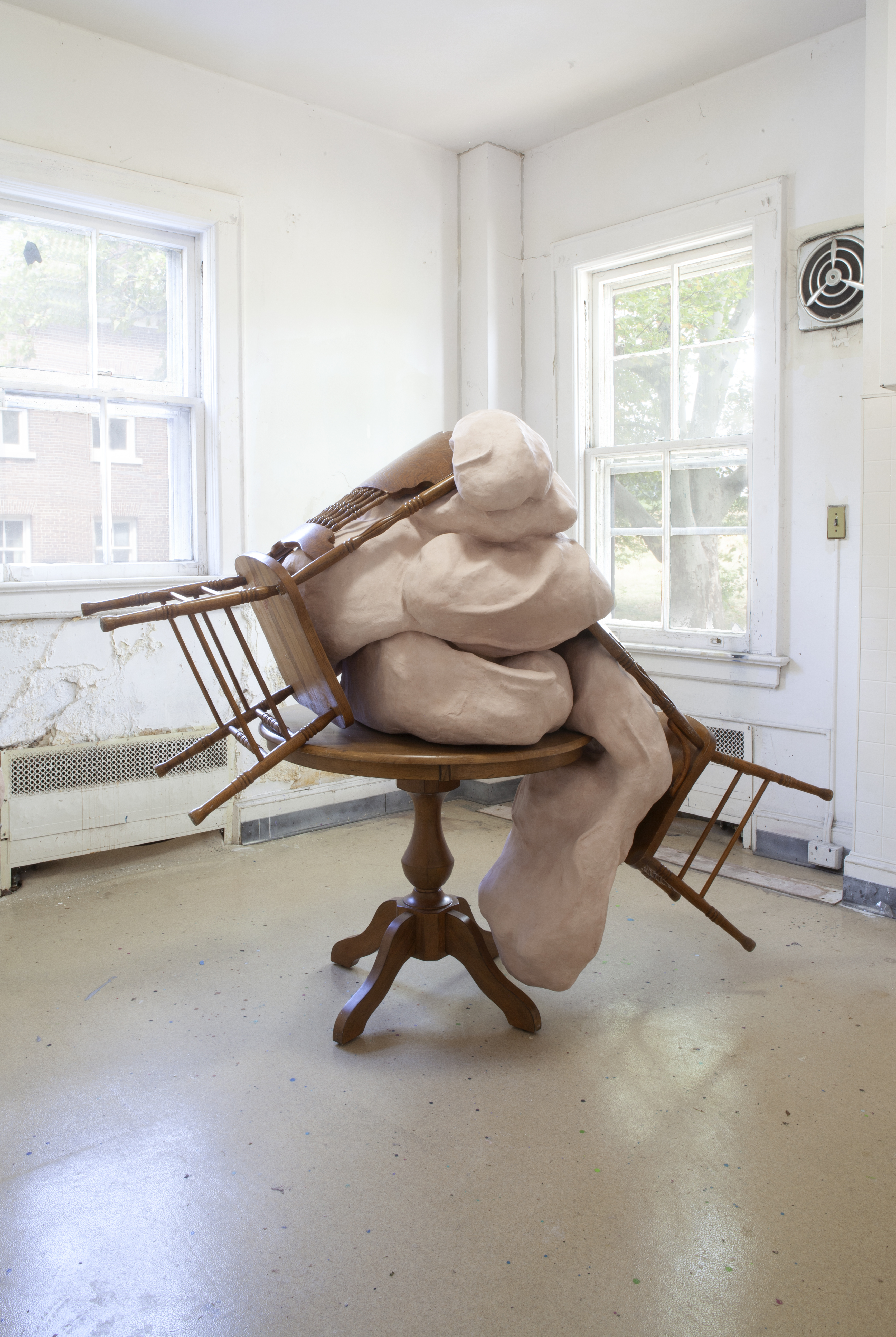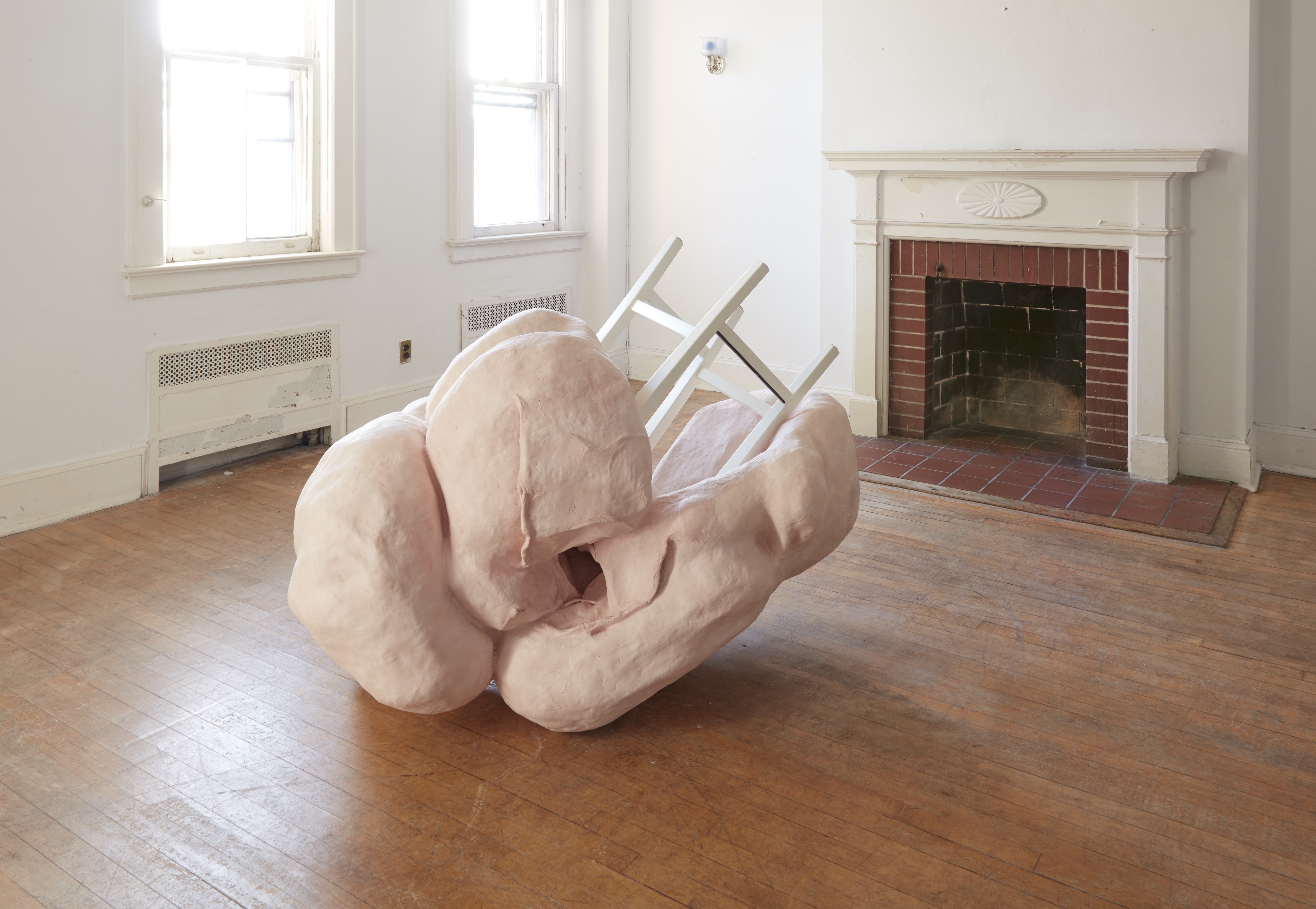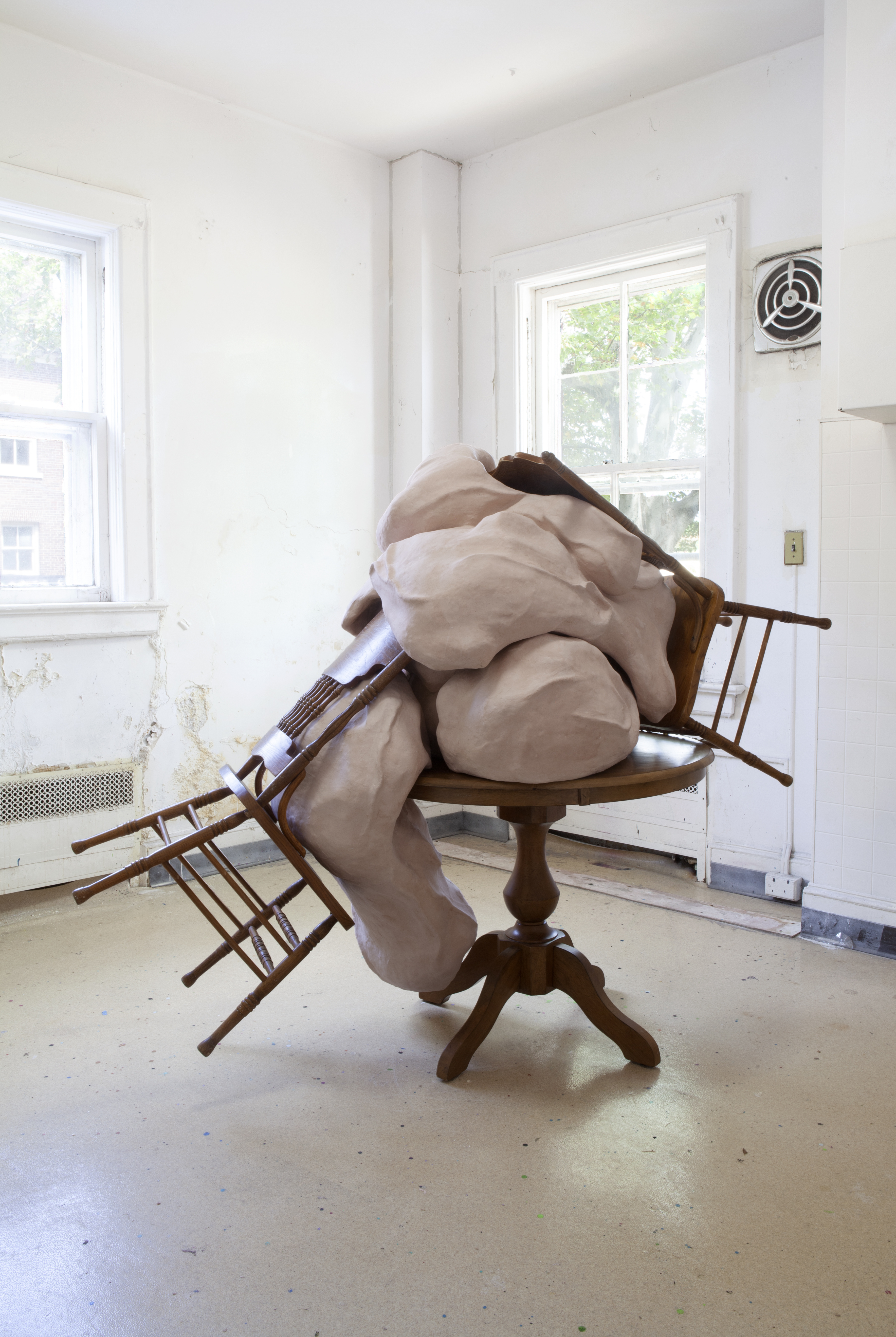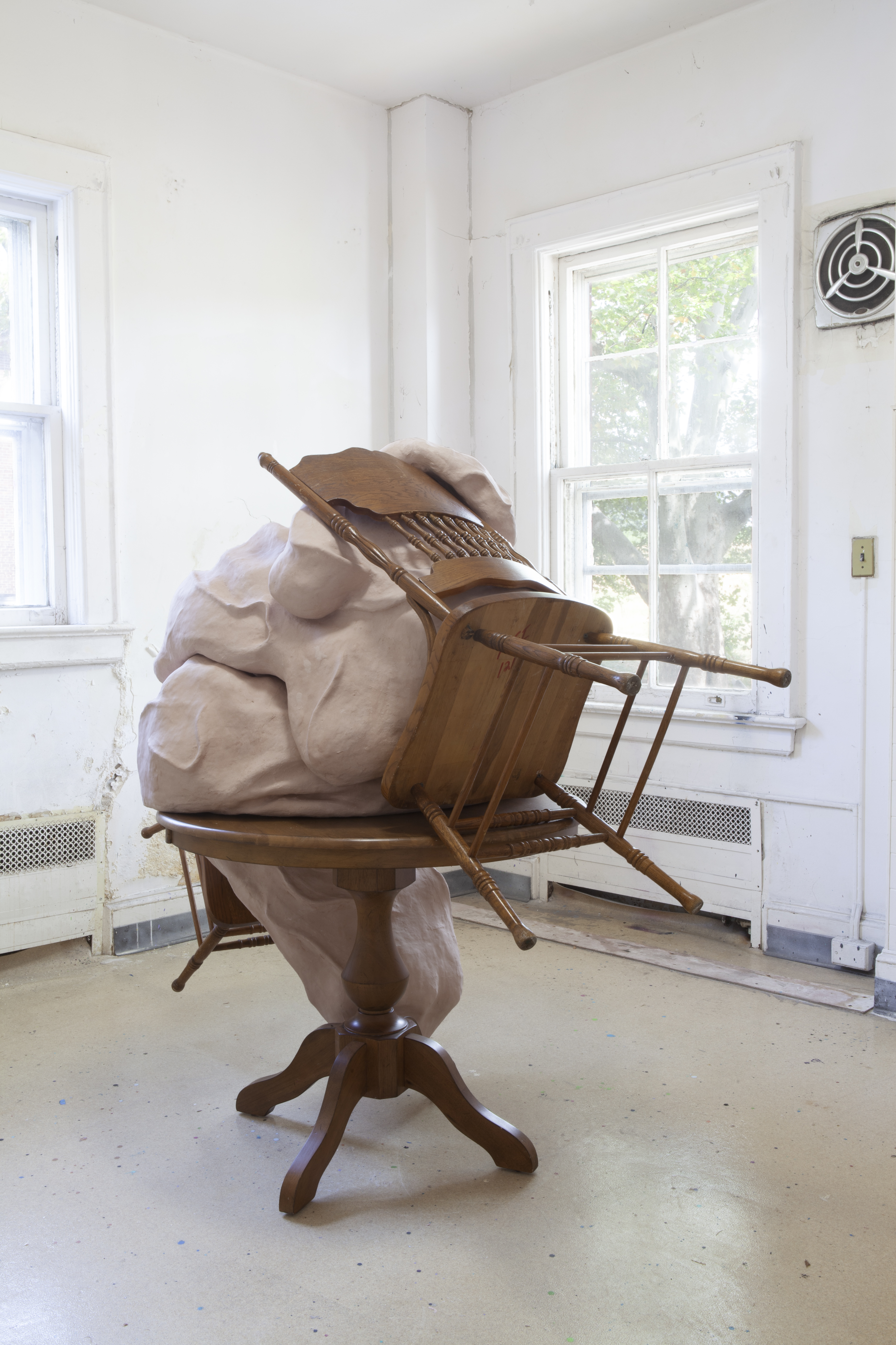 2022. 67" X 40" X 40". Domestic furniture, recycled paper and plastic, plaster gauze, joint compound, flour, toilet paper, glue, latex paint.