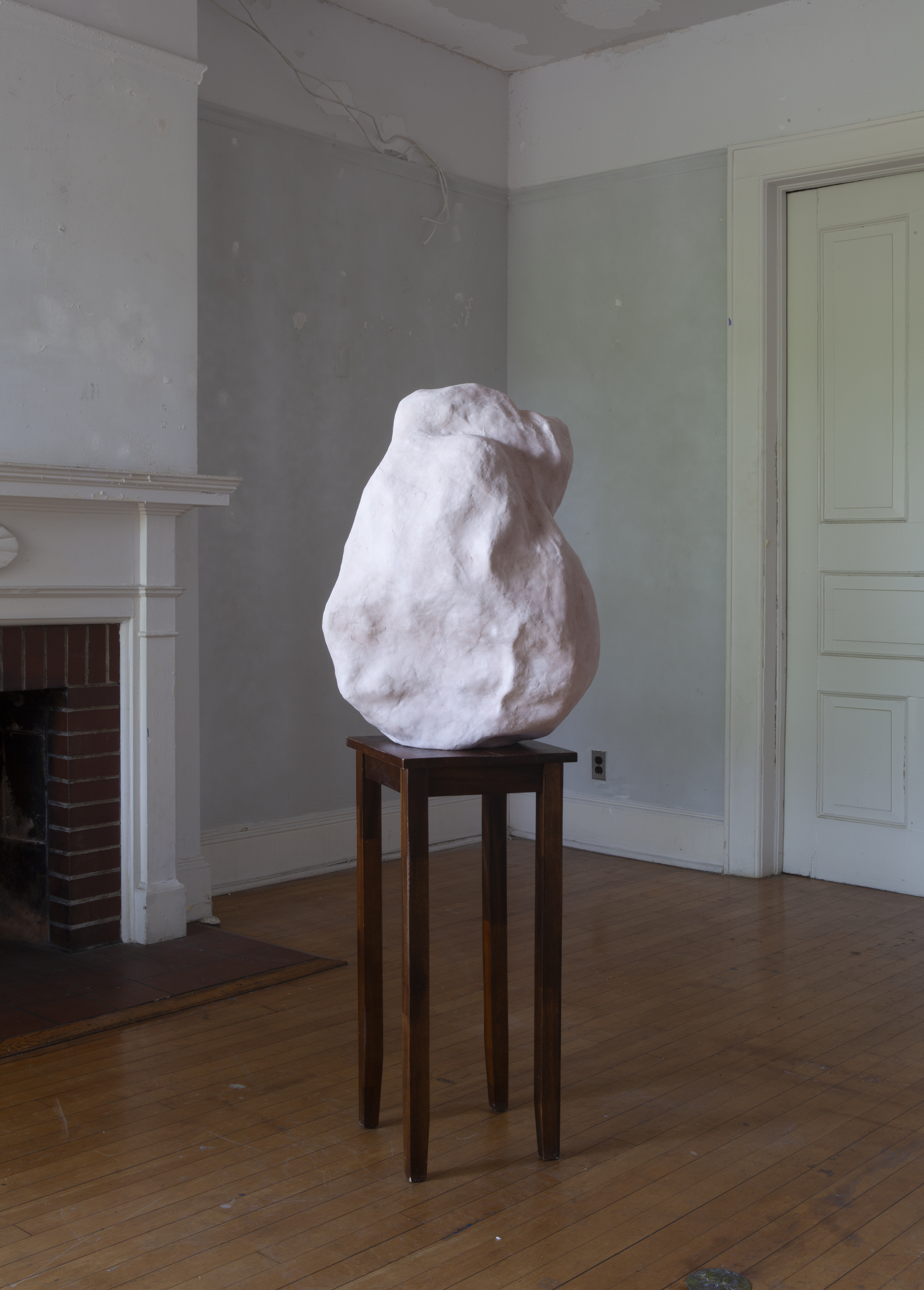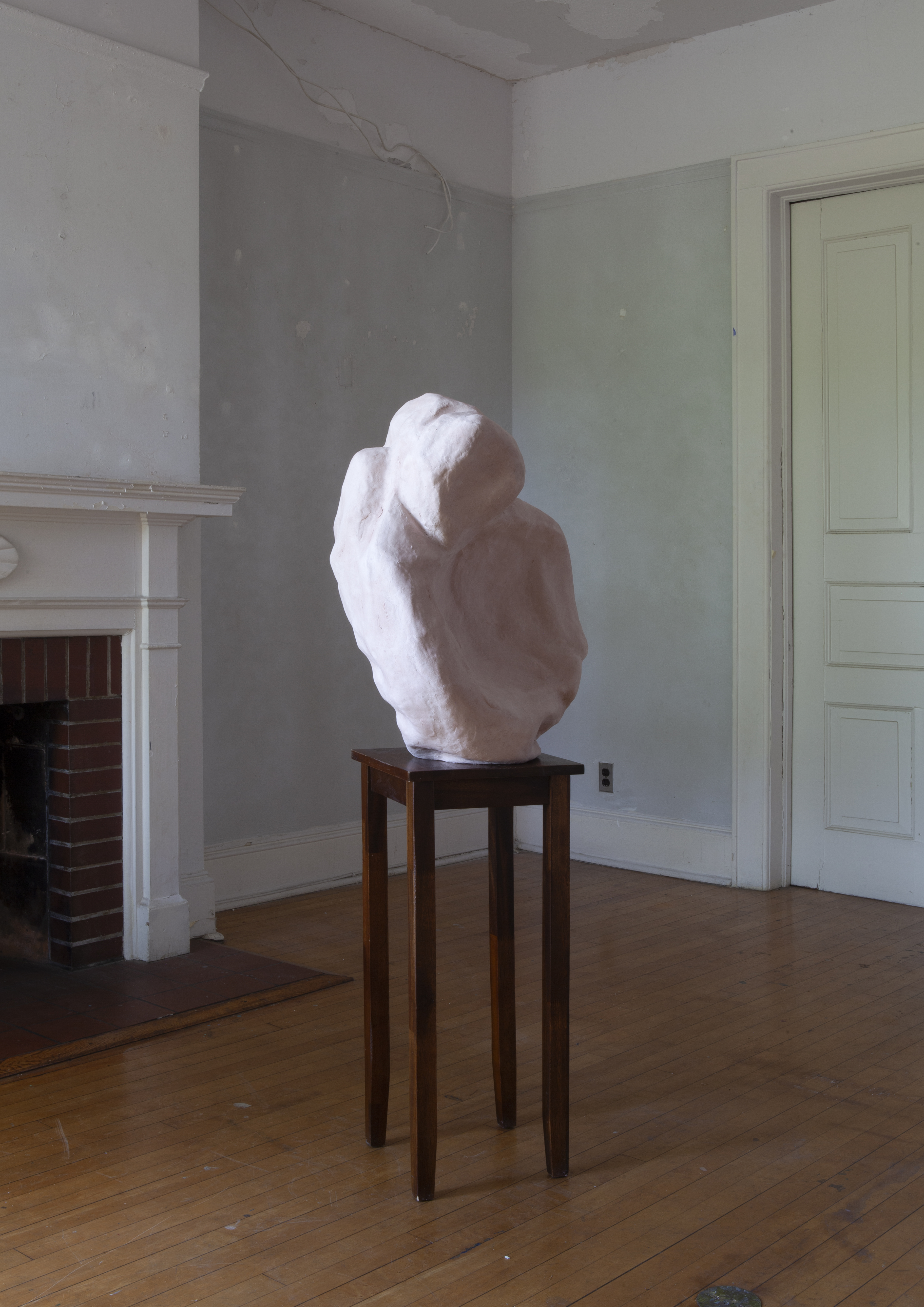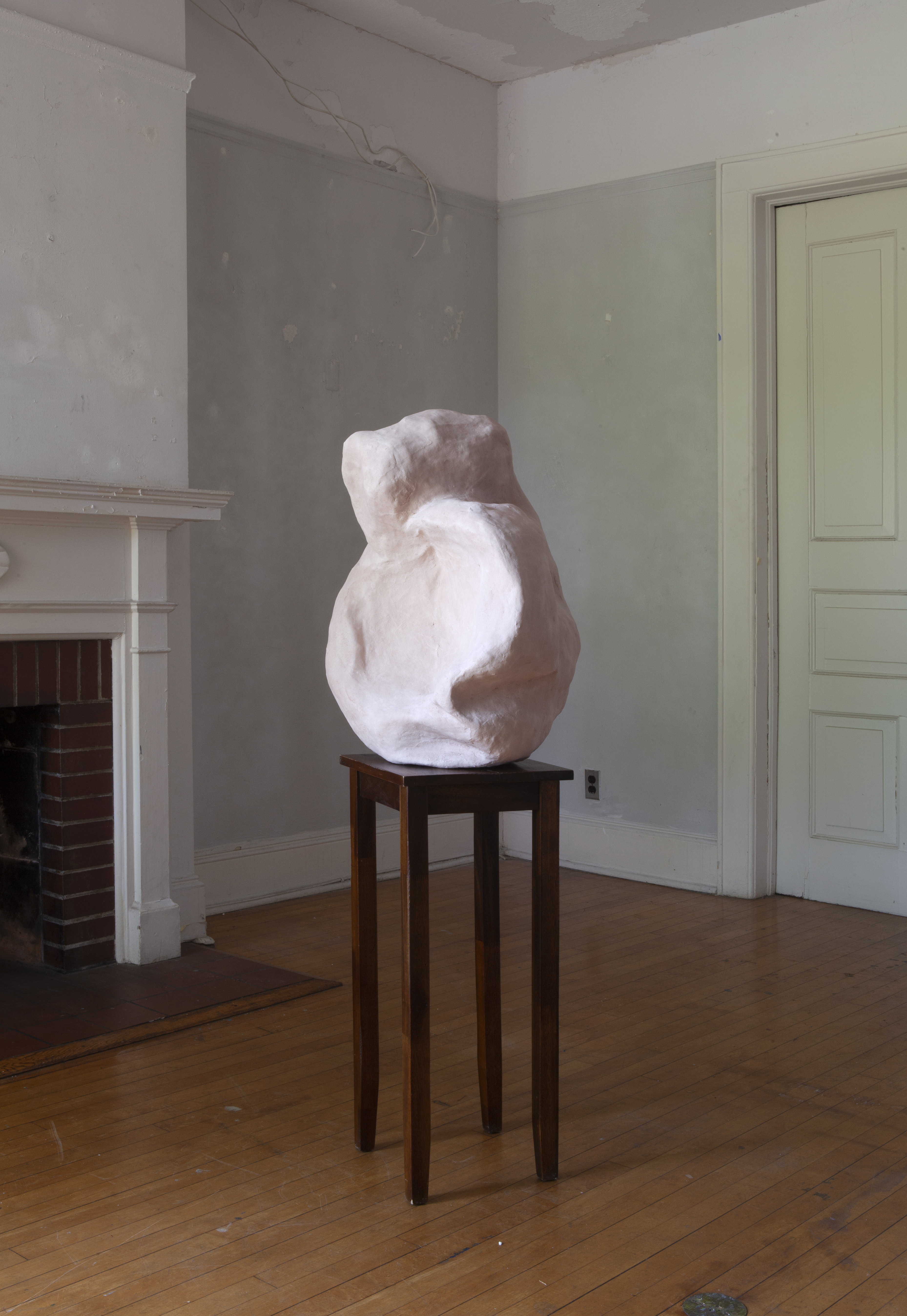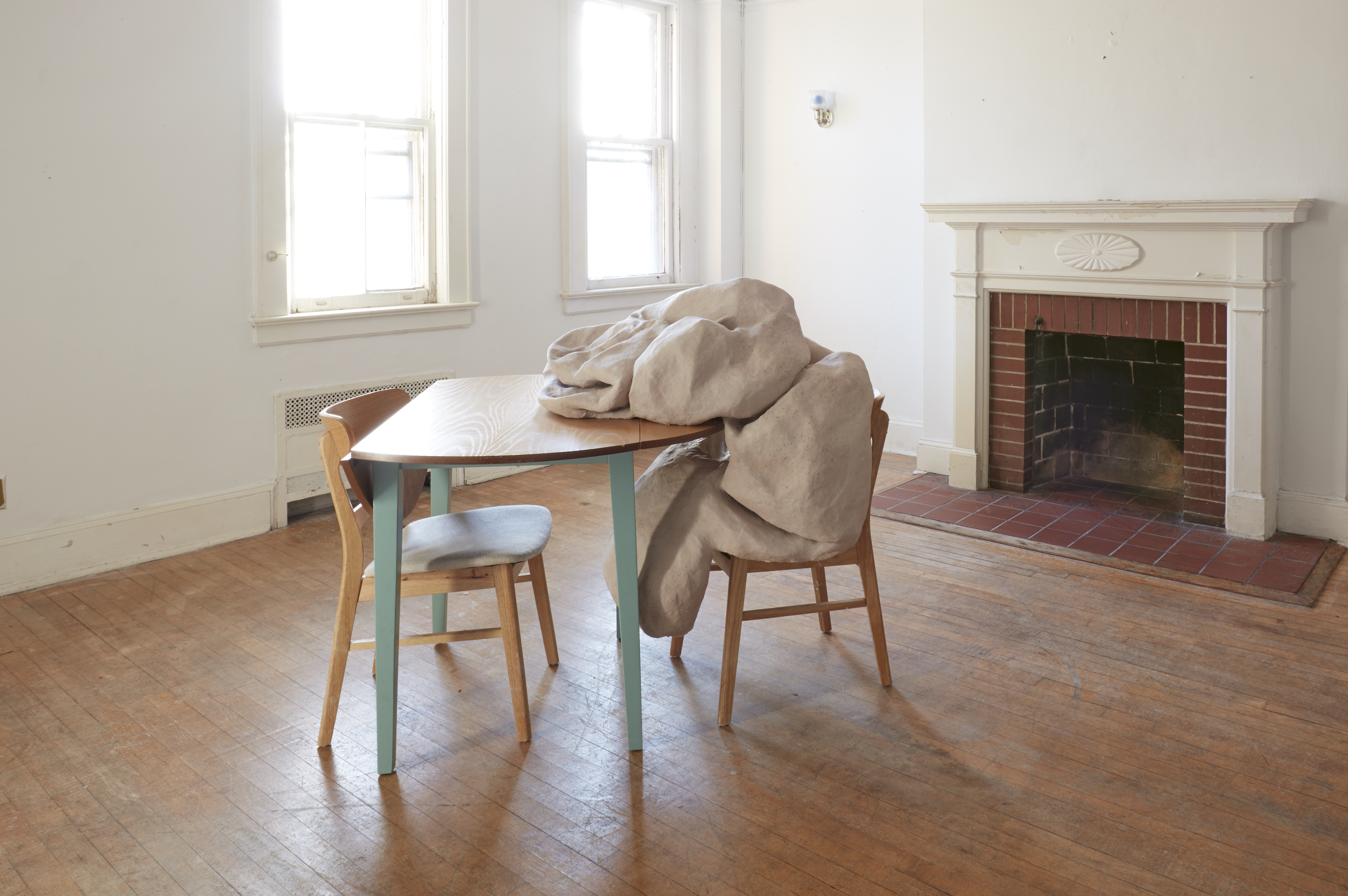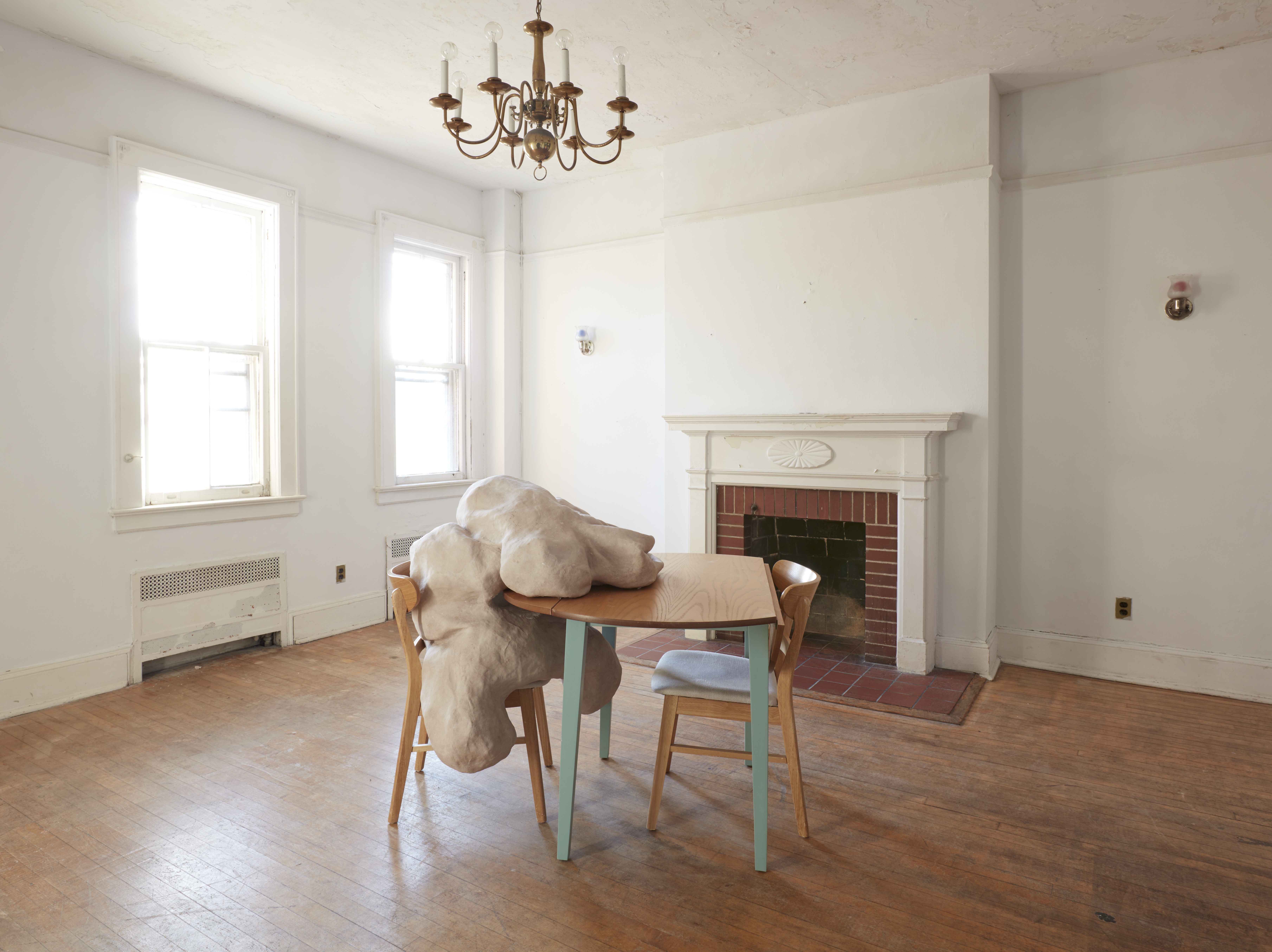 2022. 67" X 40" X 40". Domestic furniture, recycled paper and plastic, plaster gauze, joint compound, flour, toilet paper, glue, latex paint.