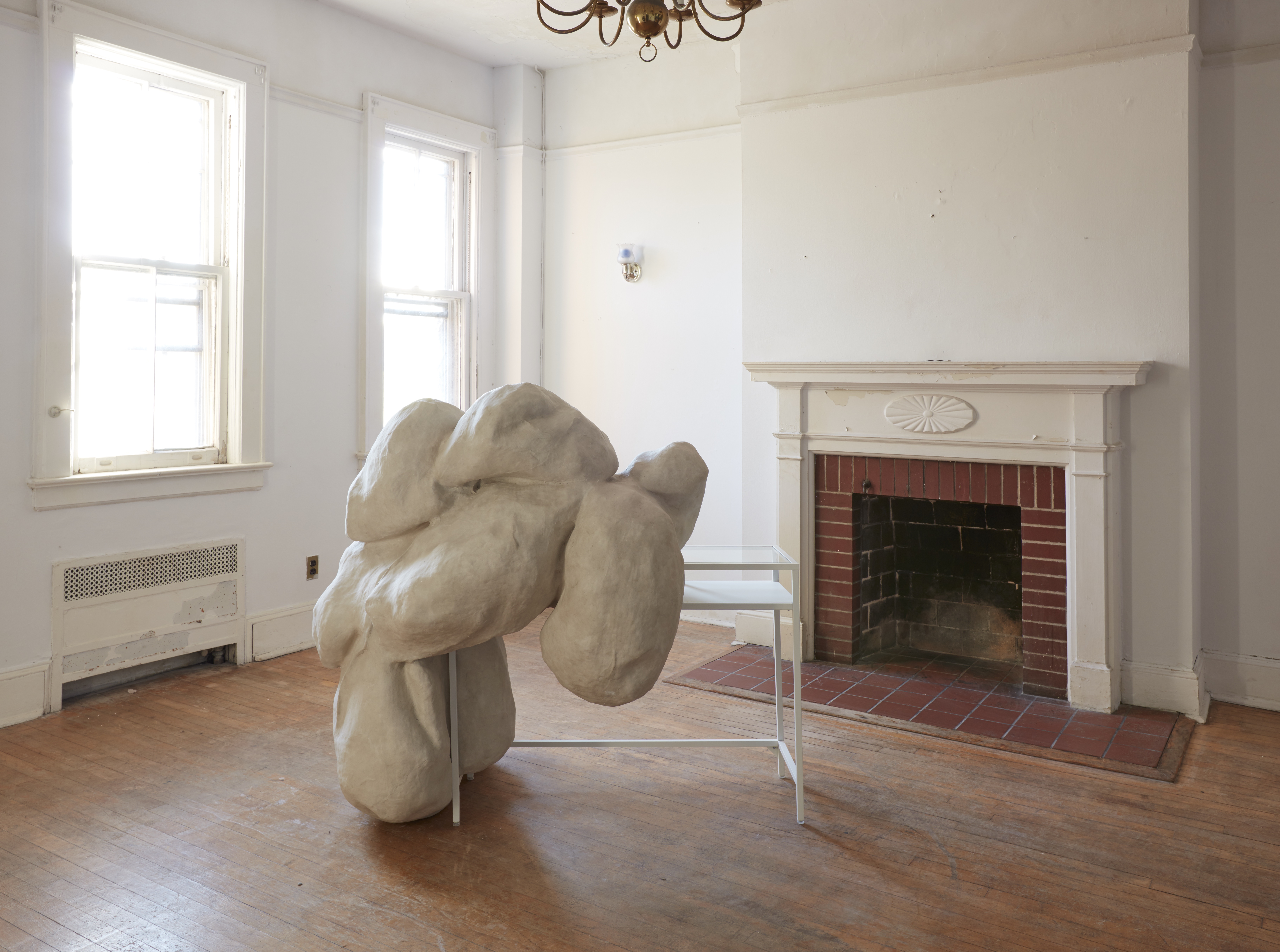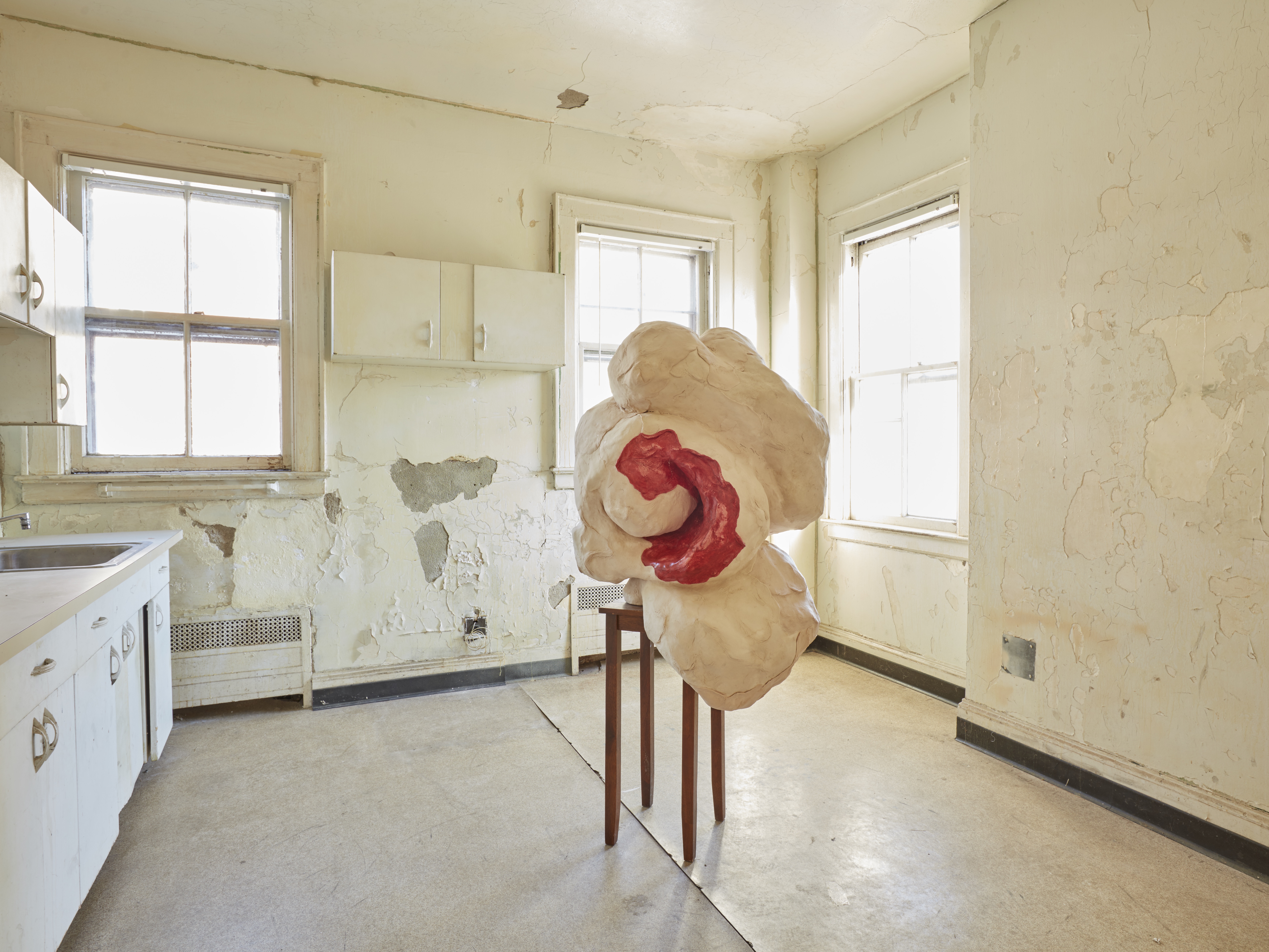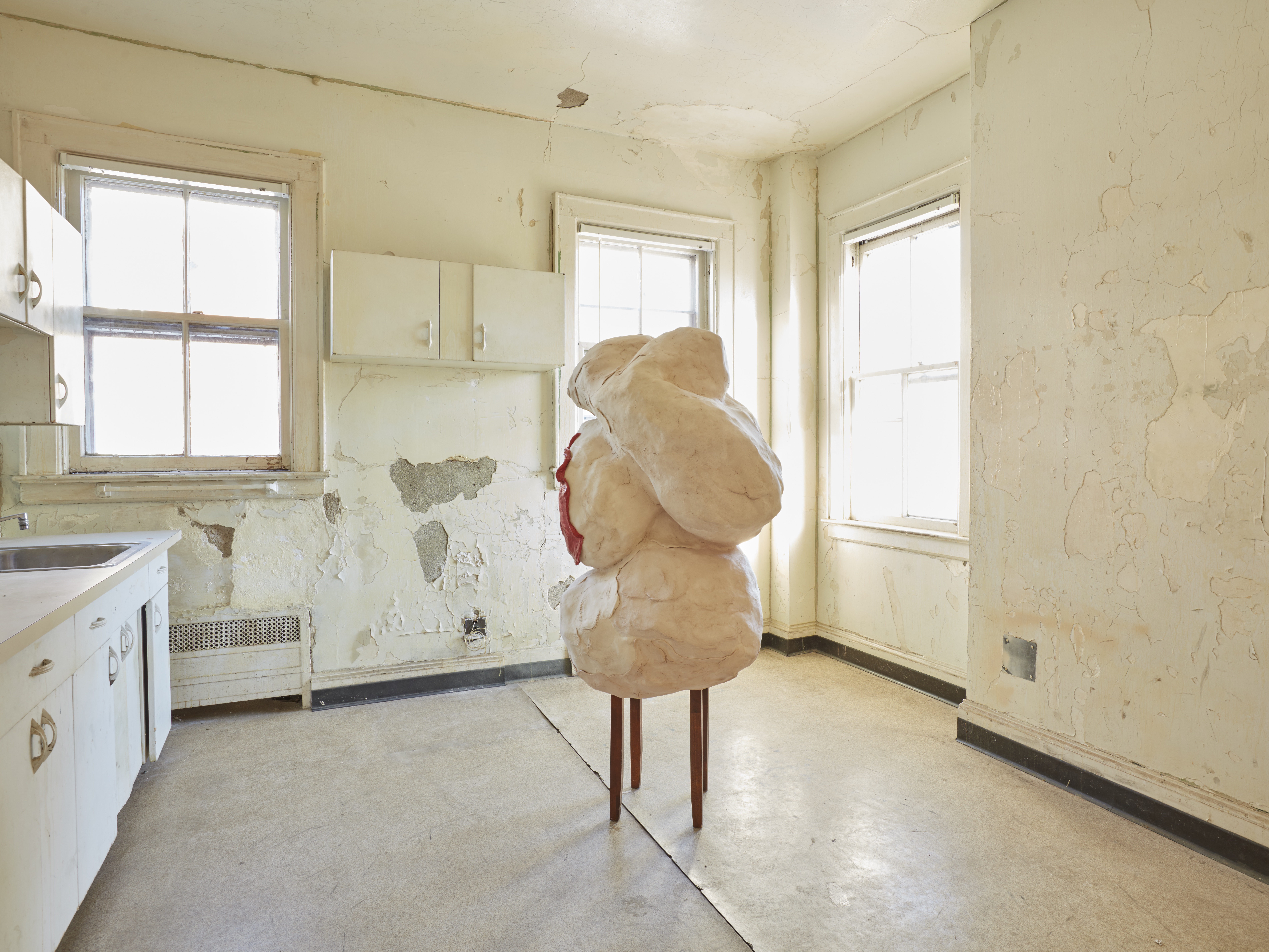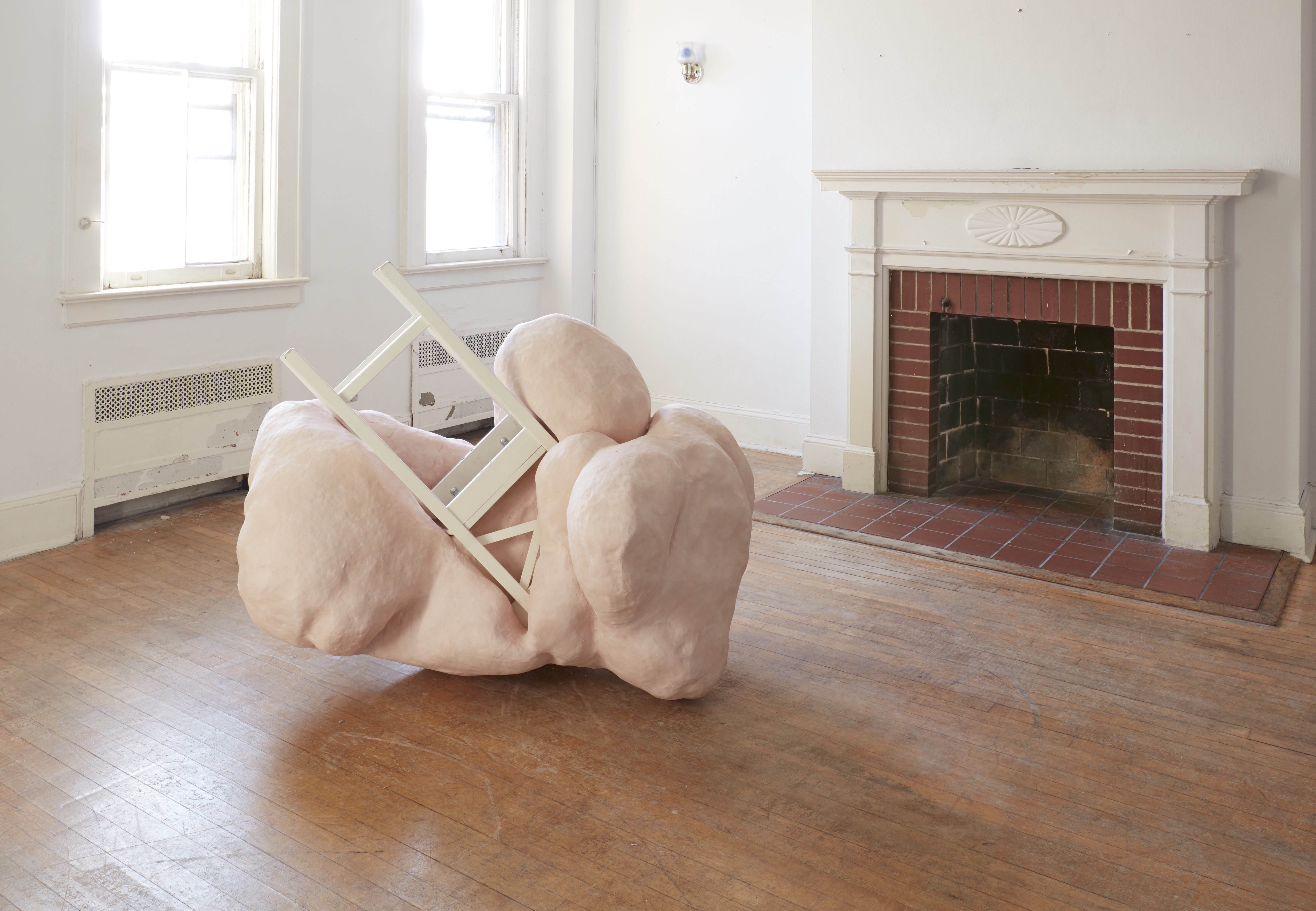 2021. Domestic furniture, recycled paper and plastic, plaster gauze, joint compound, flour, toilet paper, glue, latex paint. Photo Jason Wyche