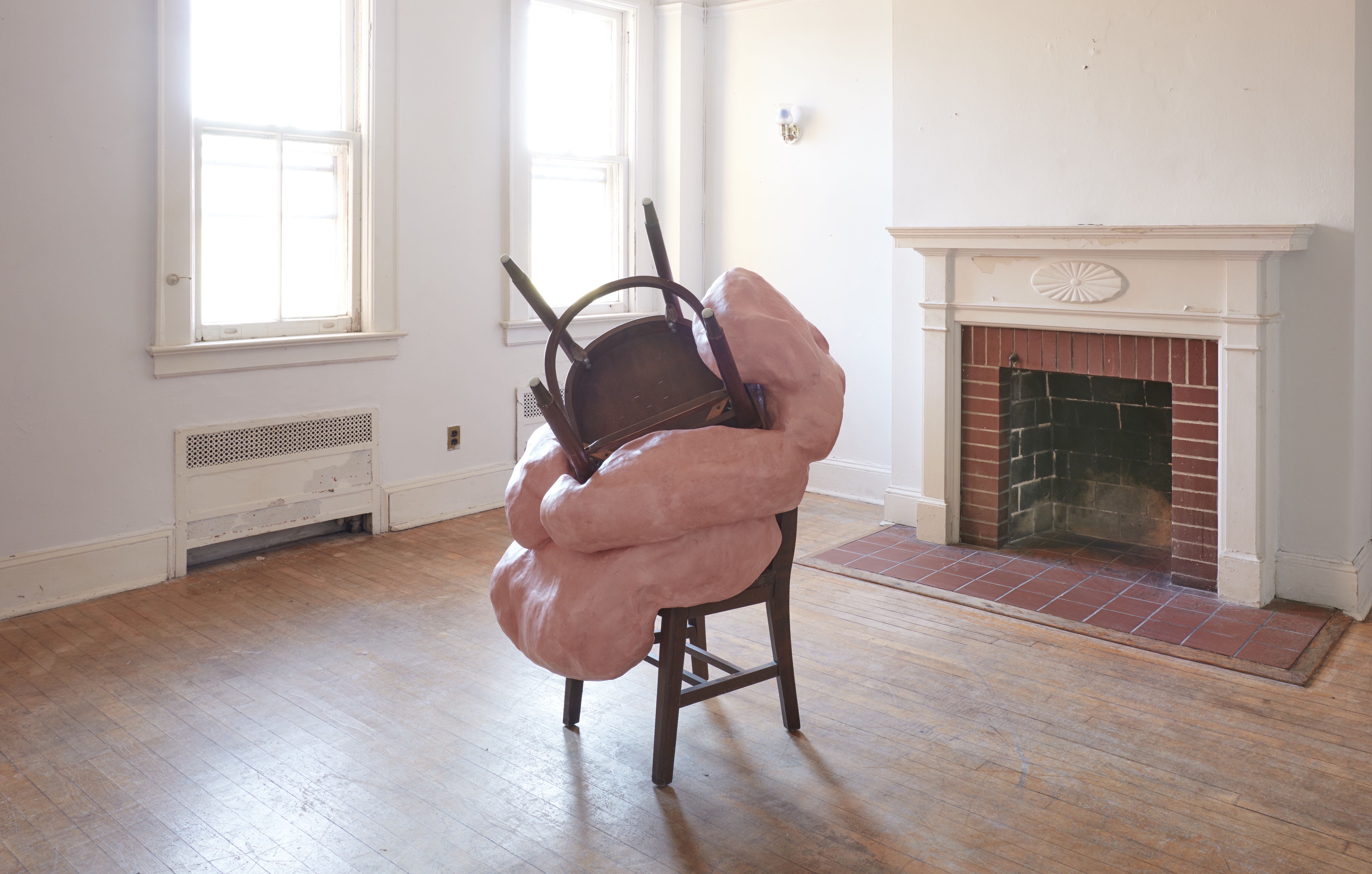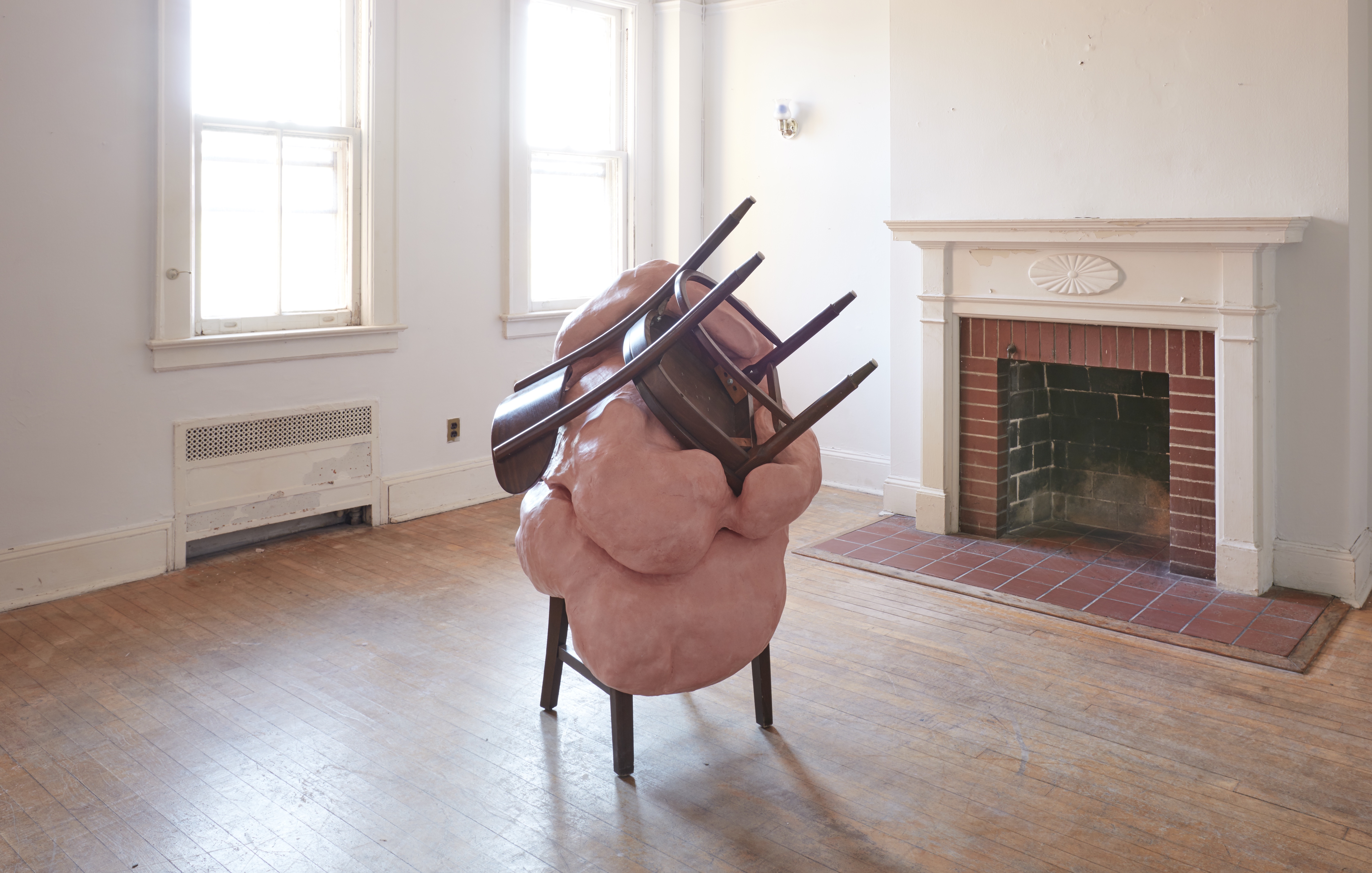 Between Body and Object was developed during the COVID-19 pandemic while Santina Amato was an Artist in Residence at 4Heads Portal on Governors Island, New York, NY. The series places domestic furniture in direct dialogue with biomorphic, organic forms made from humble household materials such as recycled junk mail, garbage bags, flour, toilet paper, and glue. Emerging from a moment when life was confined to the home, the work reflects on the collapse of boundaries between labor, rest, and survival. Amato’s sculptures transform the detritus of domestic life into living, bodily forms that appear to breathe, sag, or strain against their structures. In doing so, she reimagines the domestic interior as a porous site, where the body merges with its surroundings and the ordinary becomes uncanny. Between Body and Object is both a meditation on containment and a quiet resistance to it.