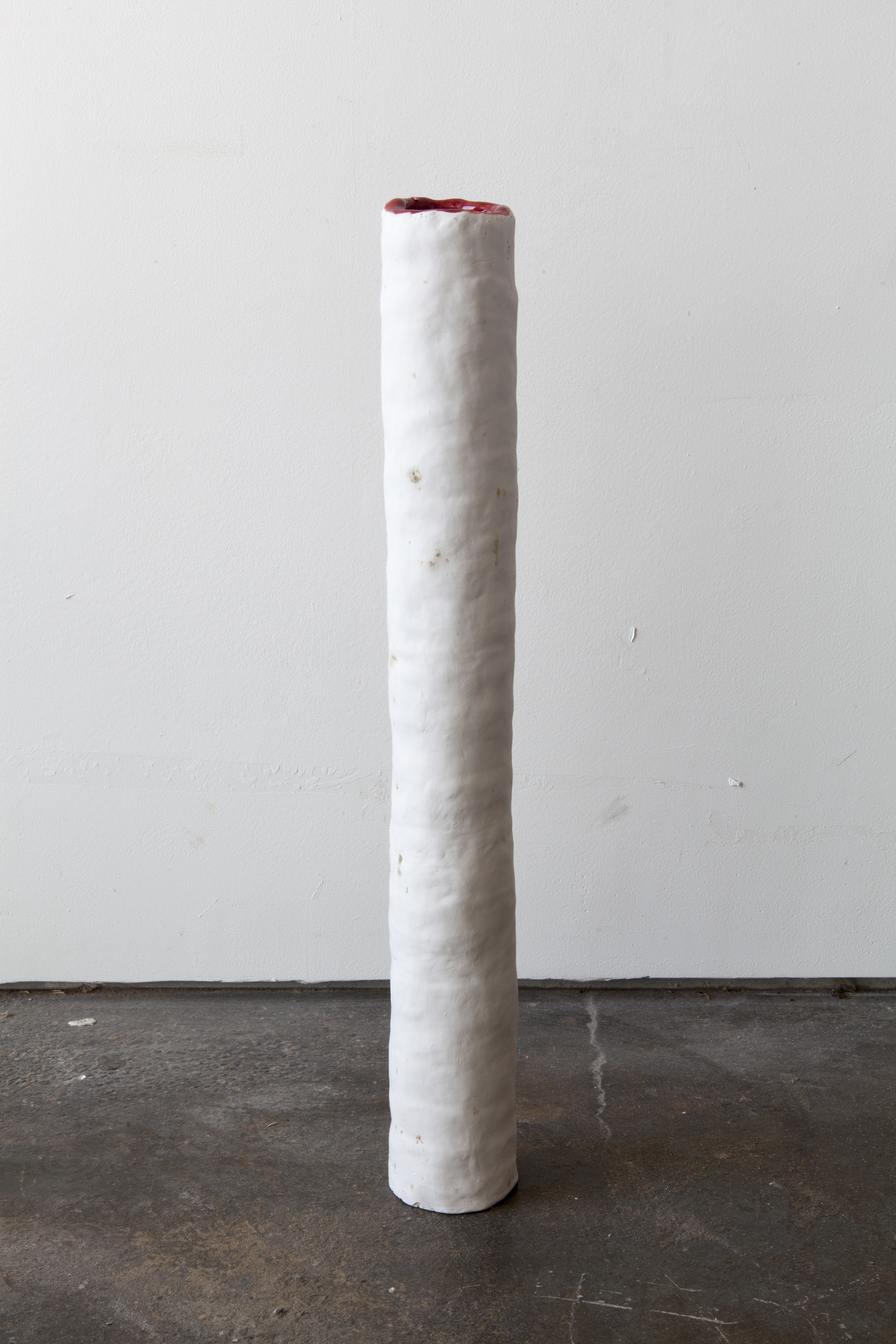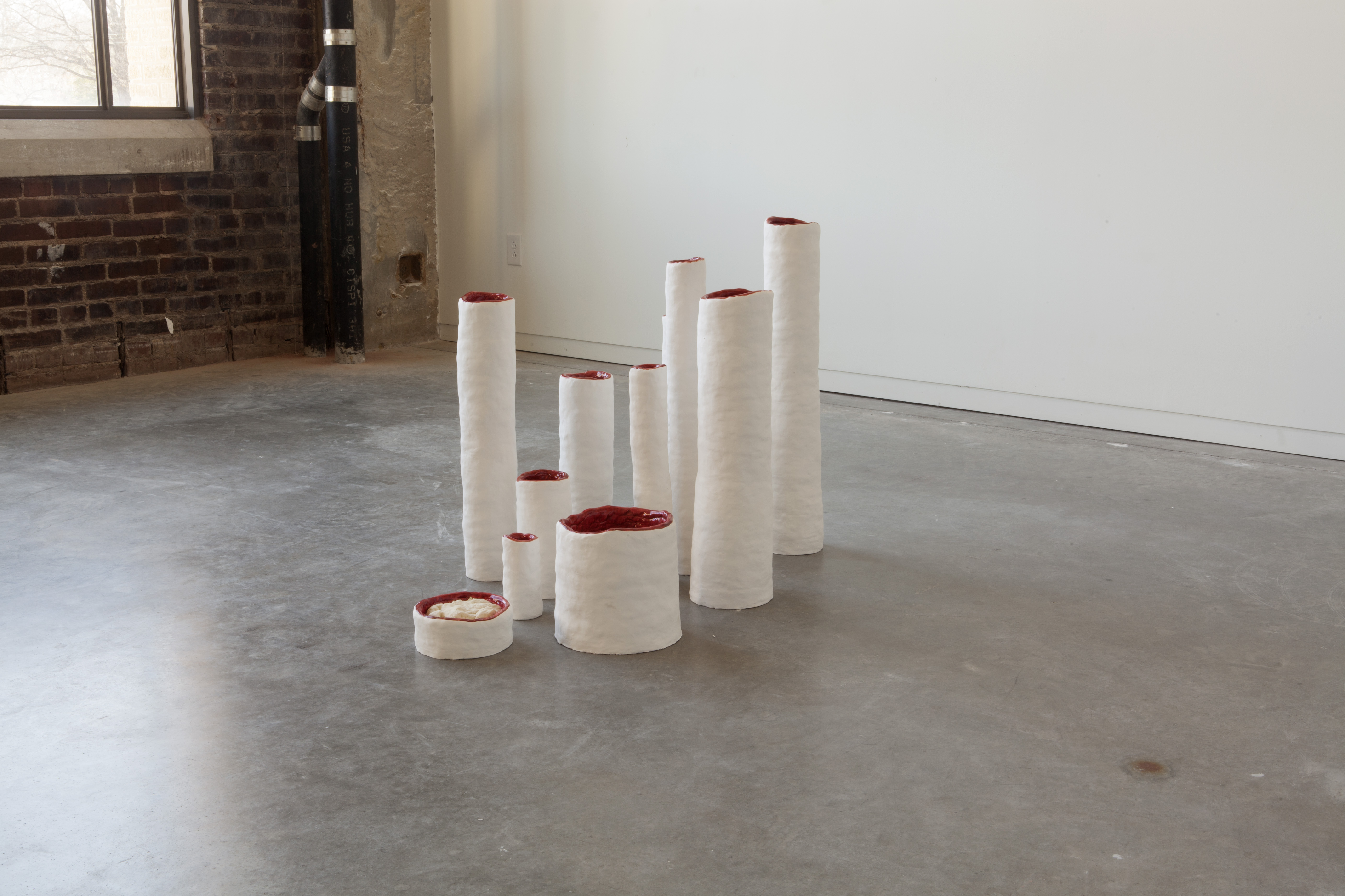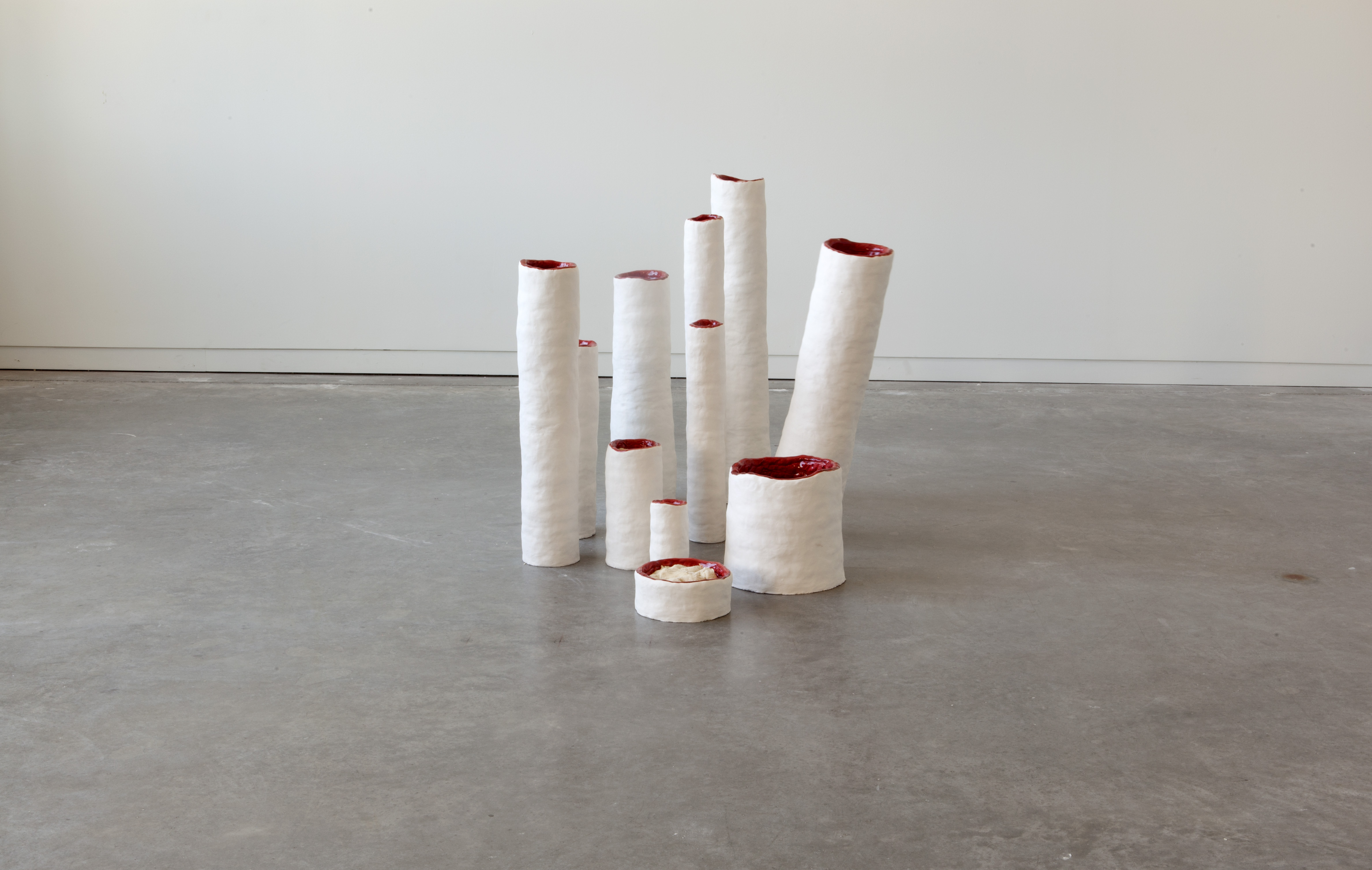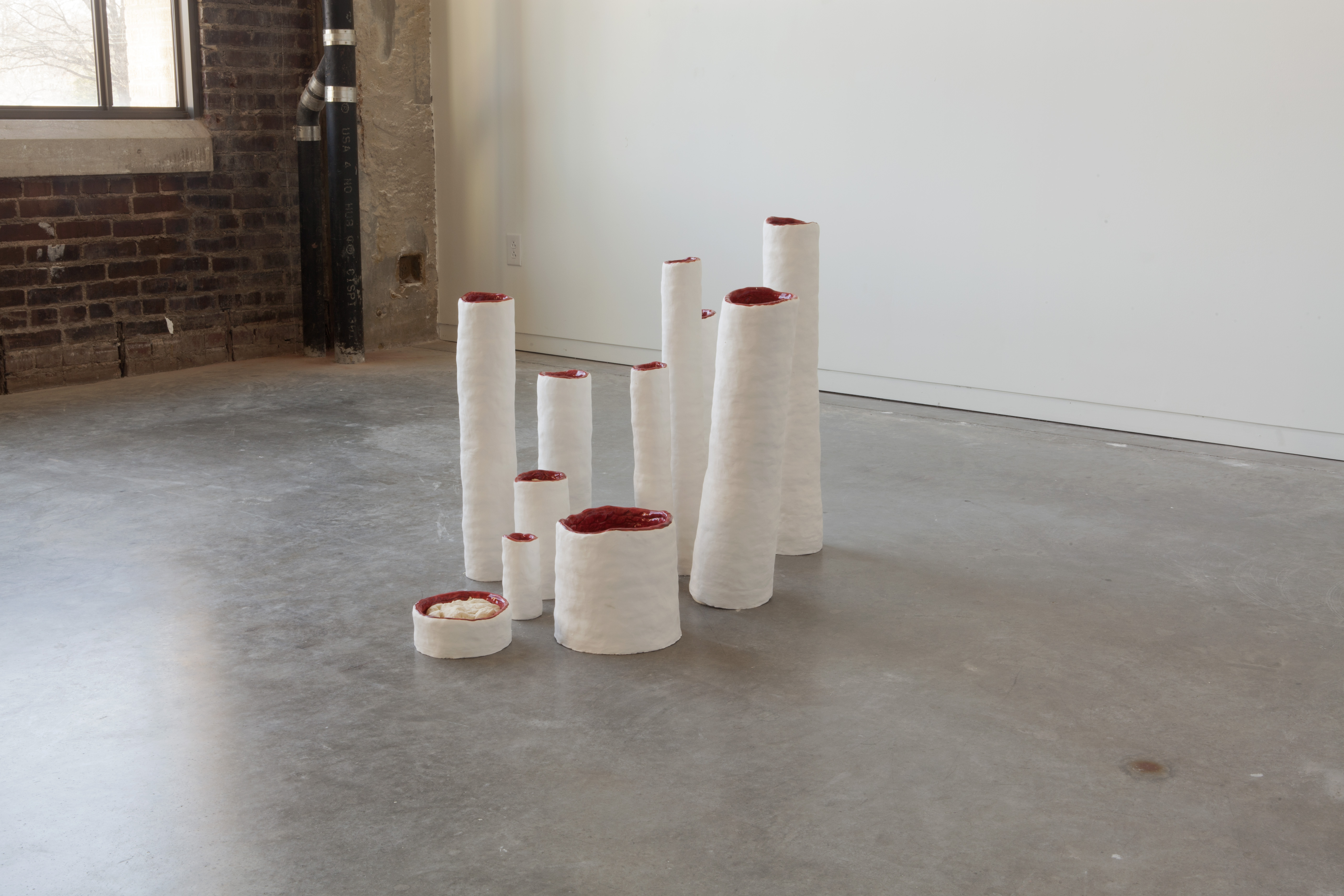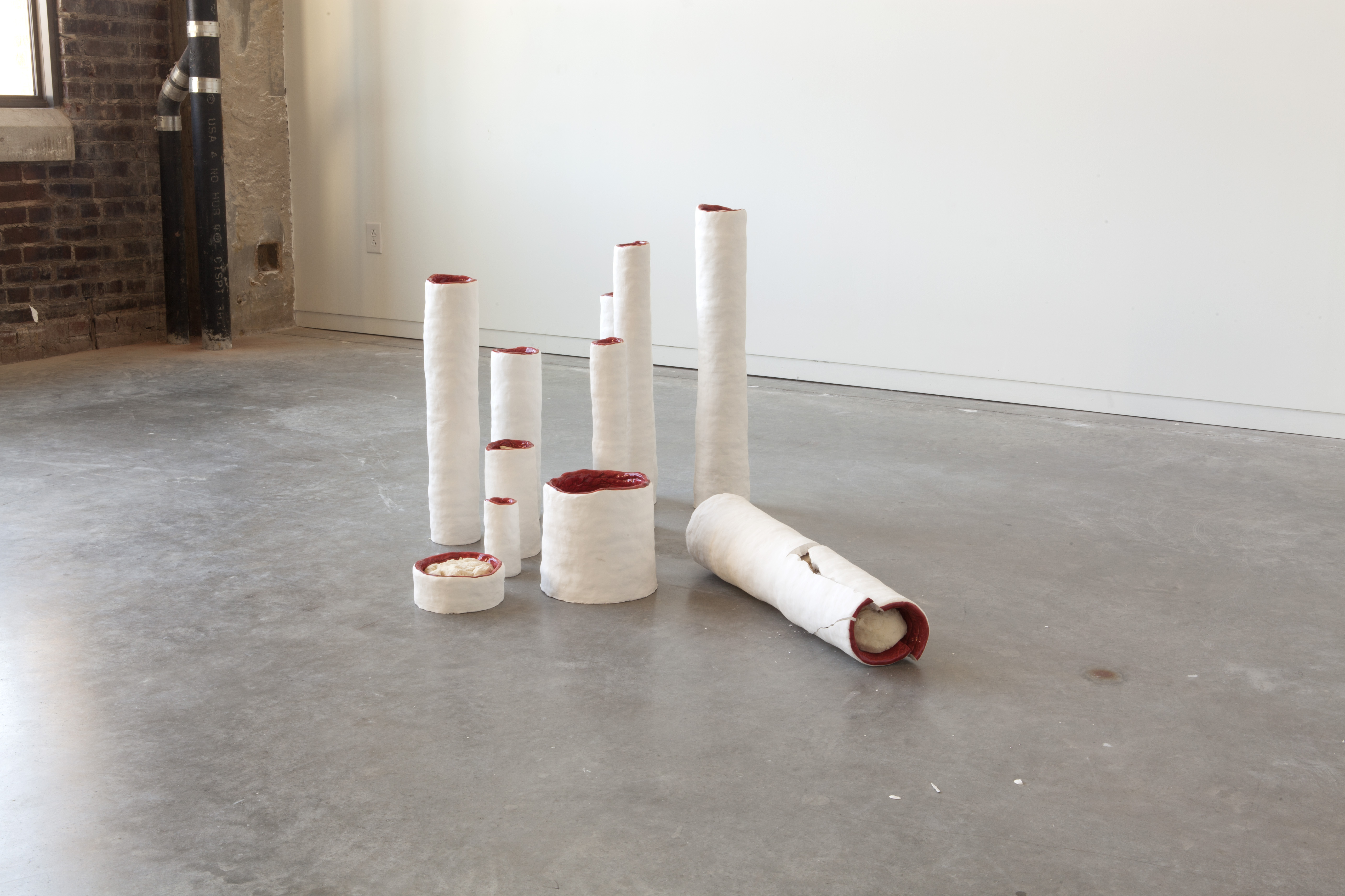 What remains post performance. Sculptures with stains. H 14.5" X Diameter 4.5"