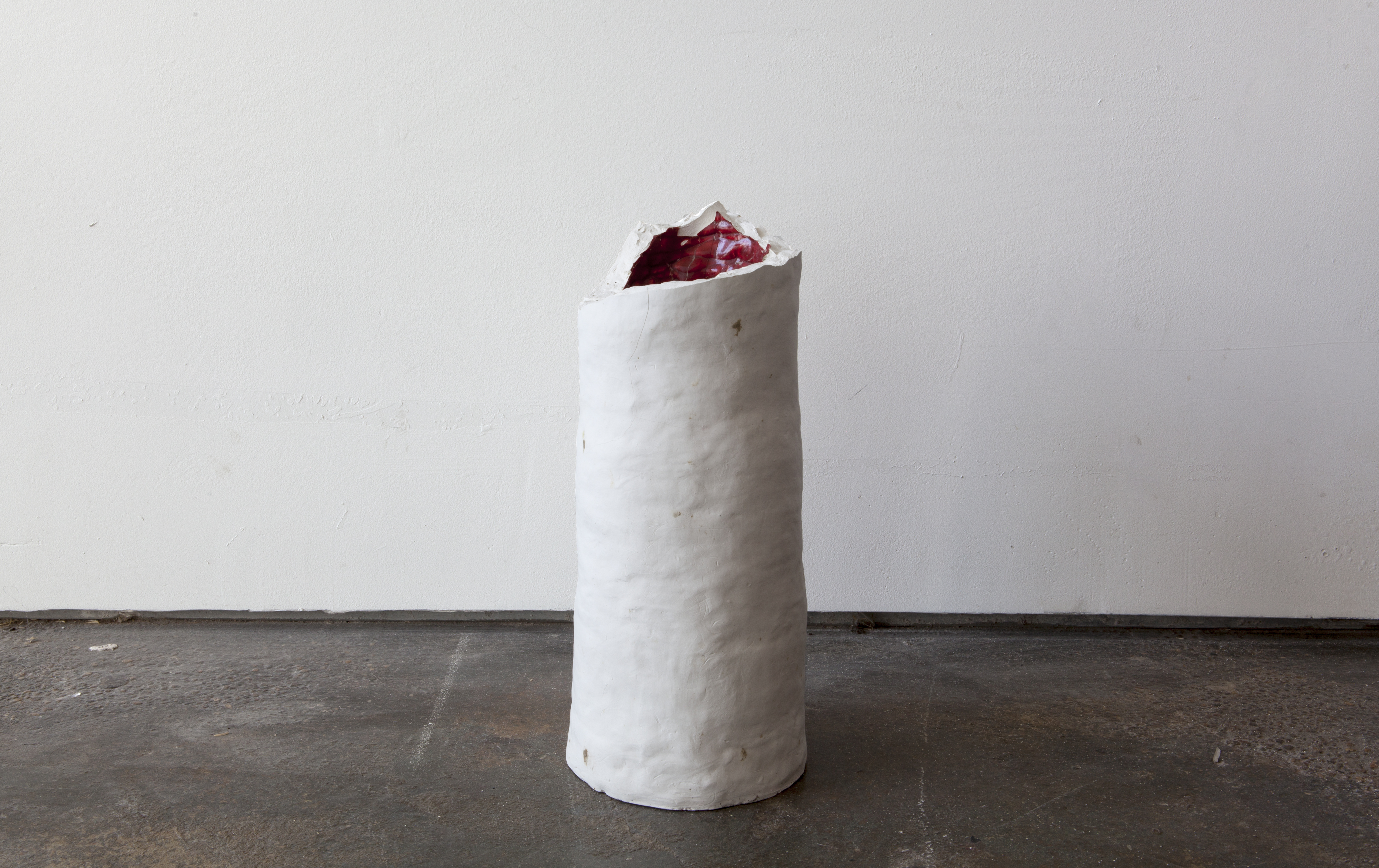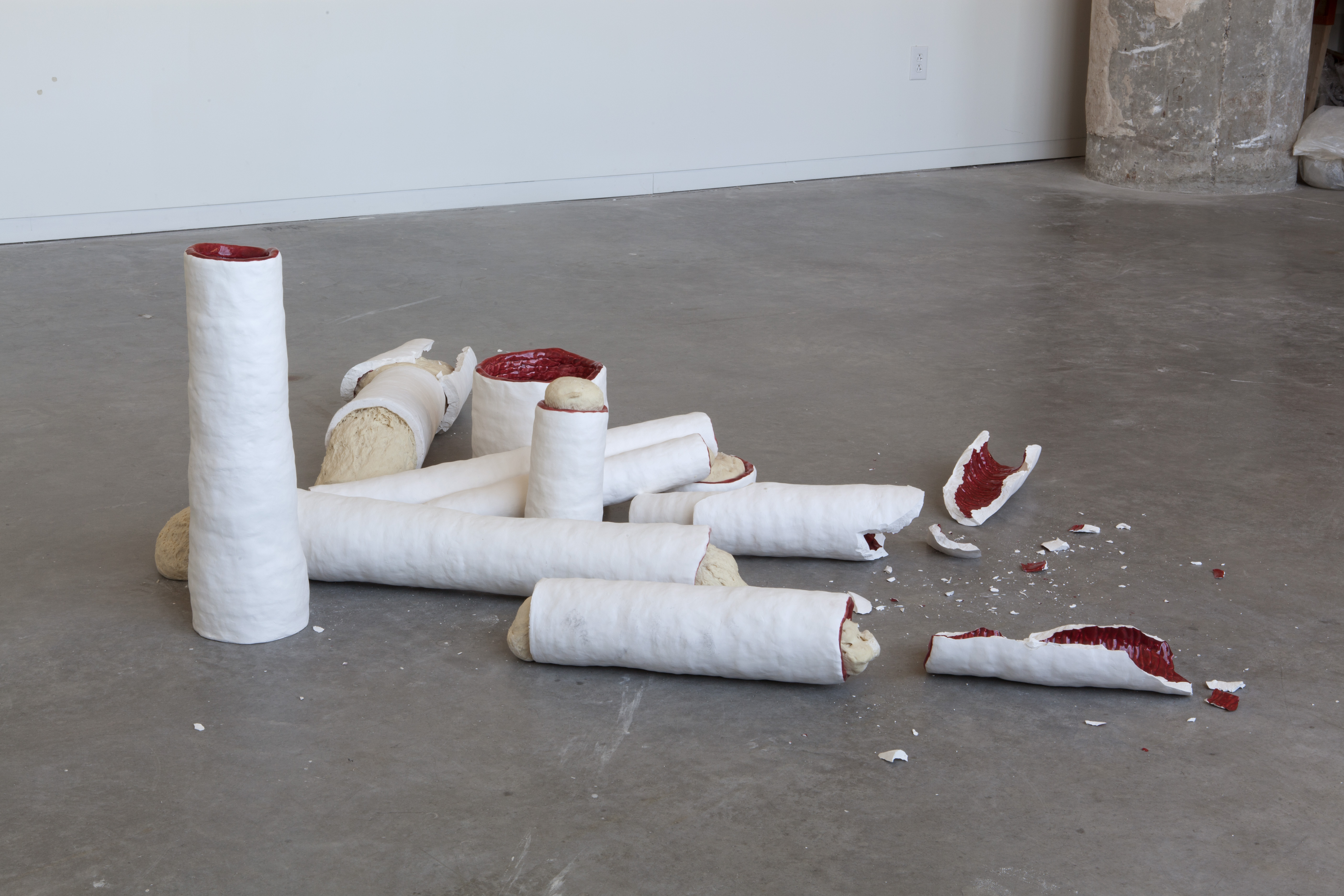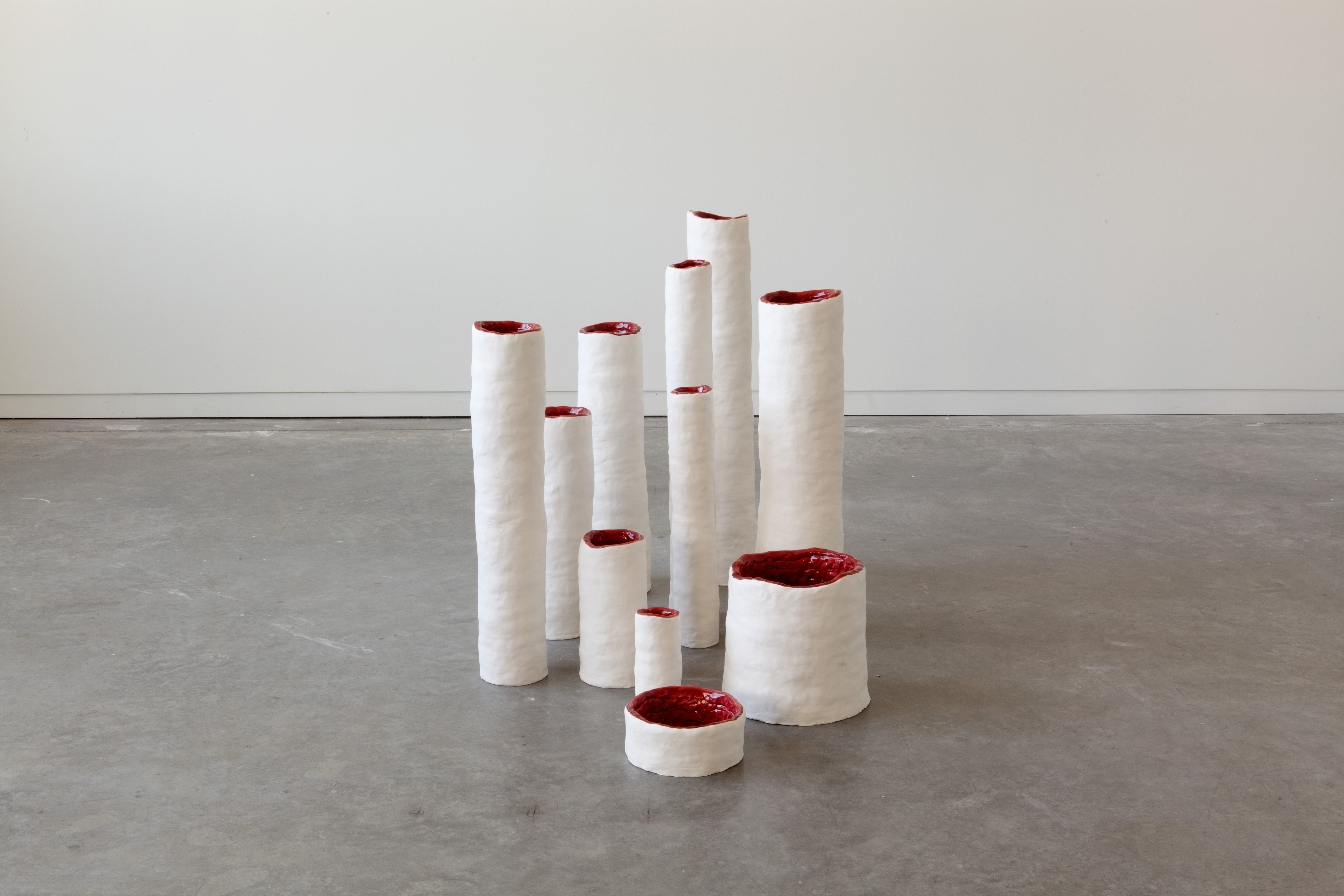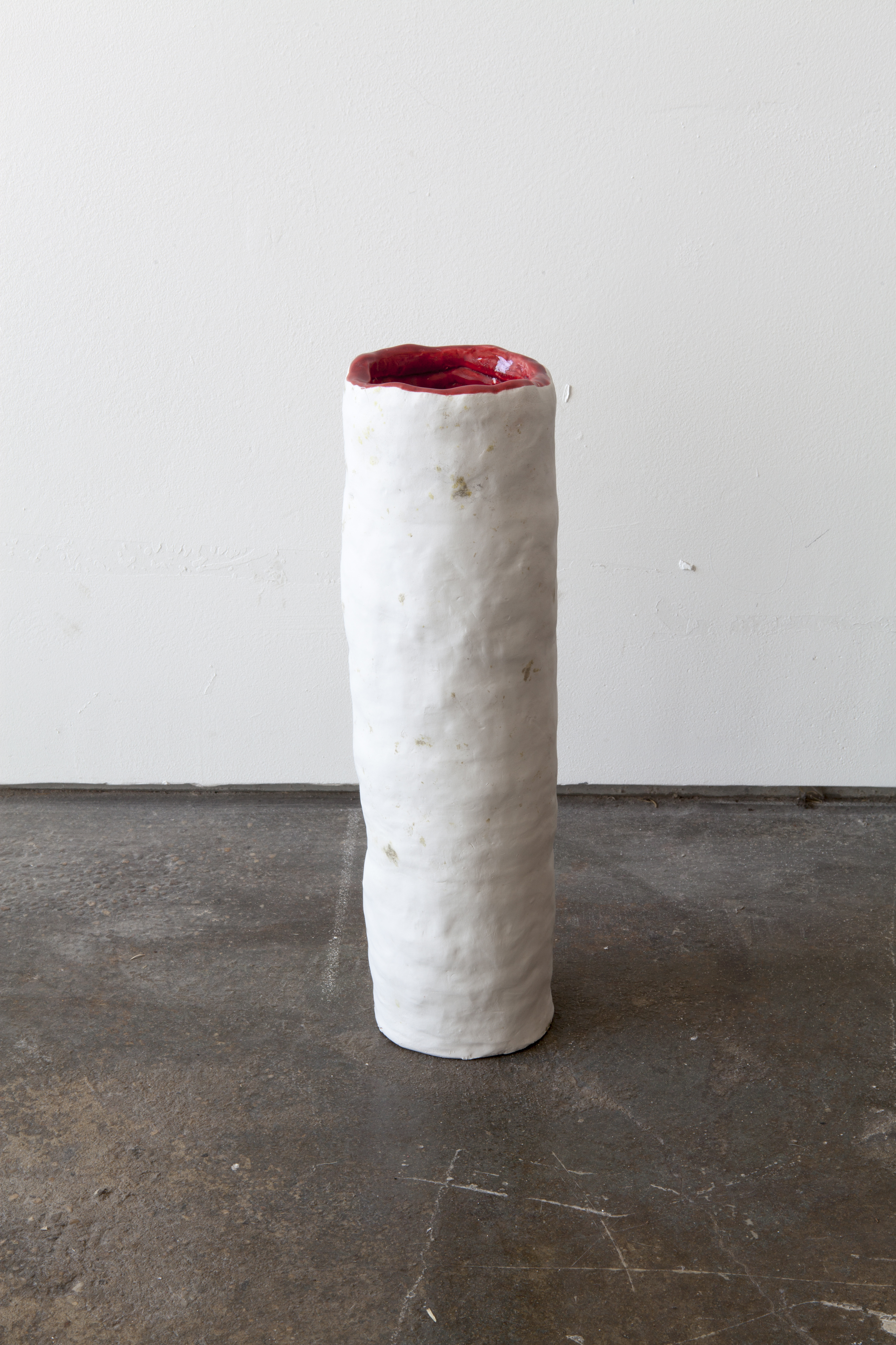 What remains post performance. Sculptures with stains. H 14.5" X Diameter 4.5"