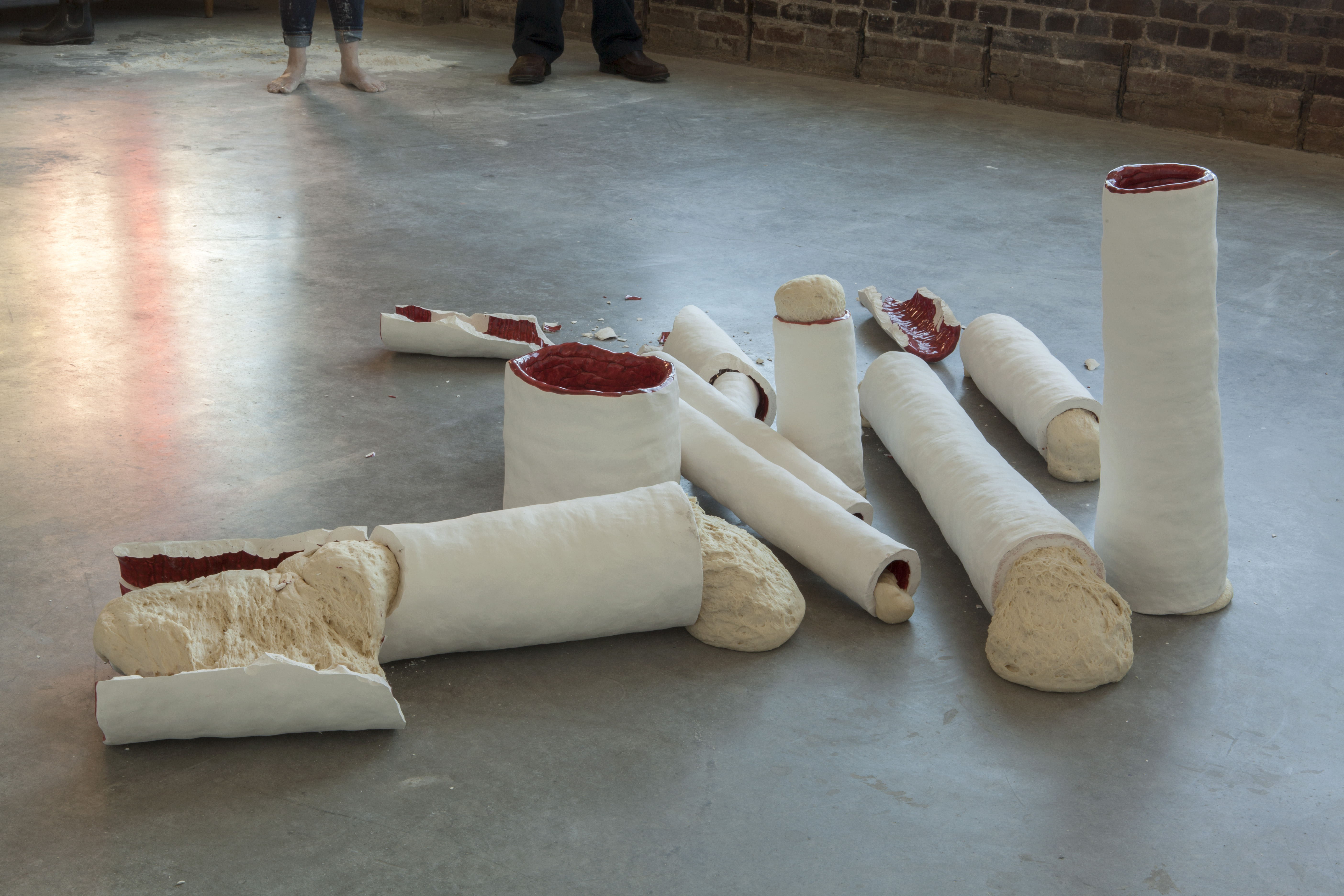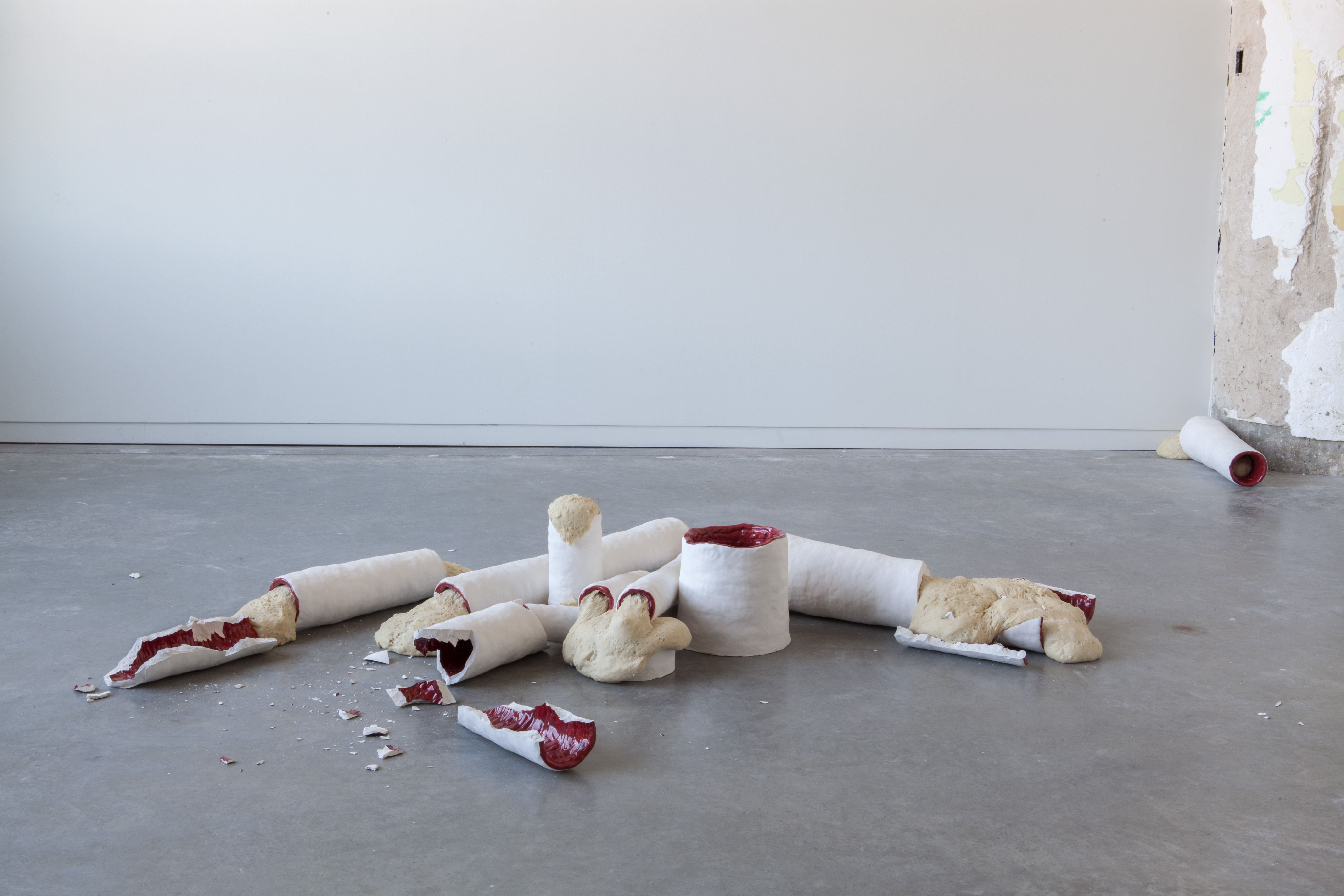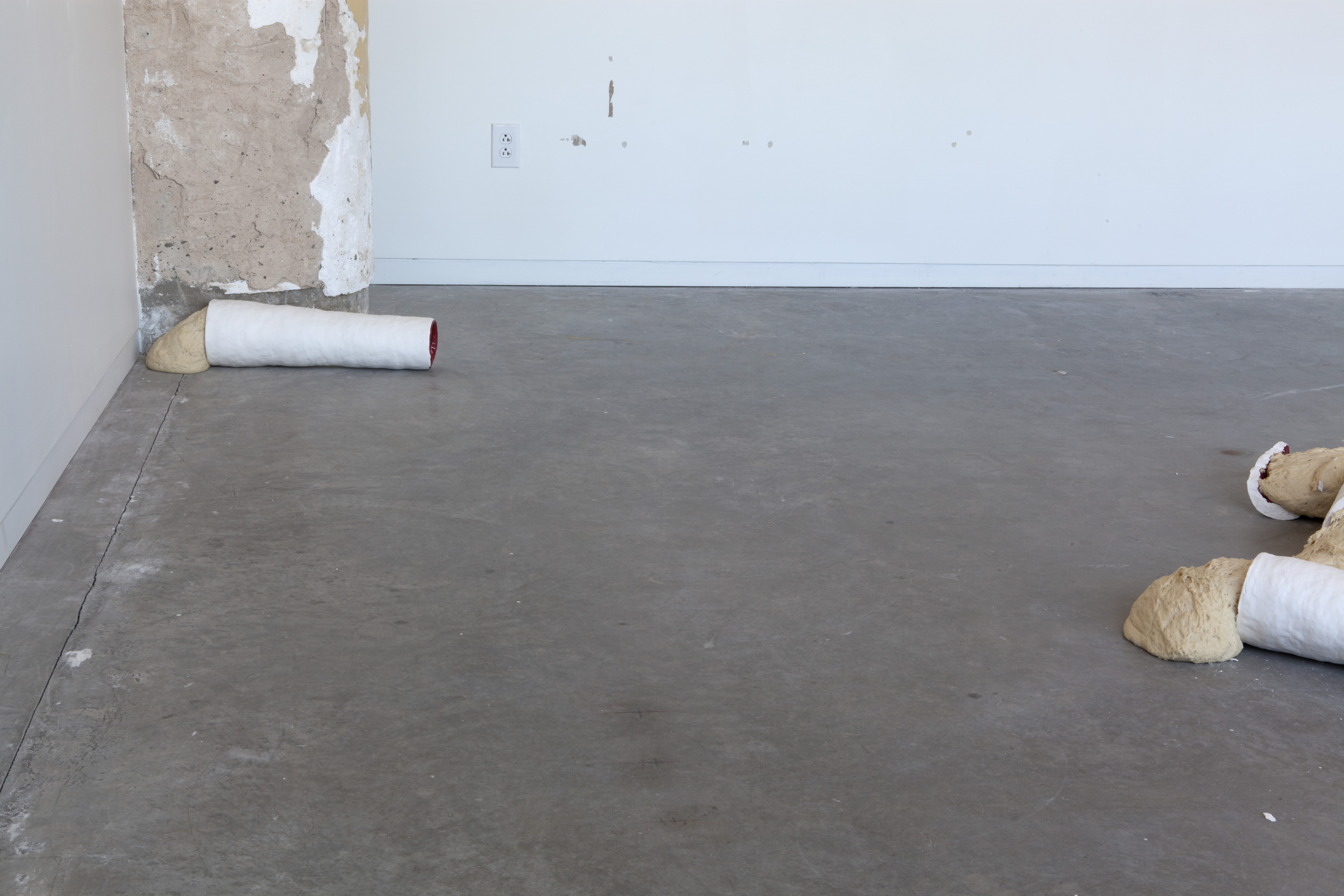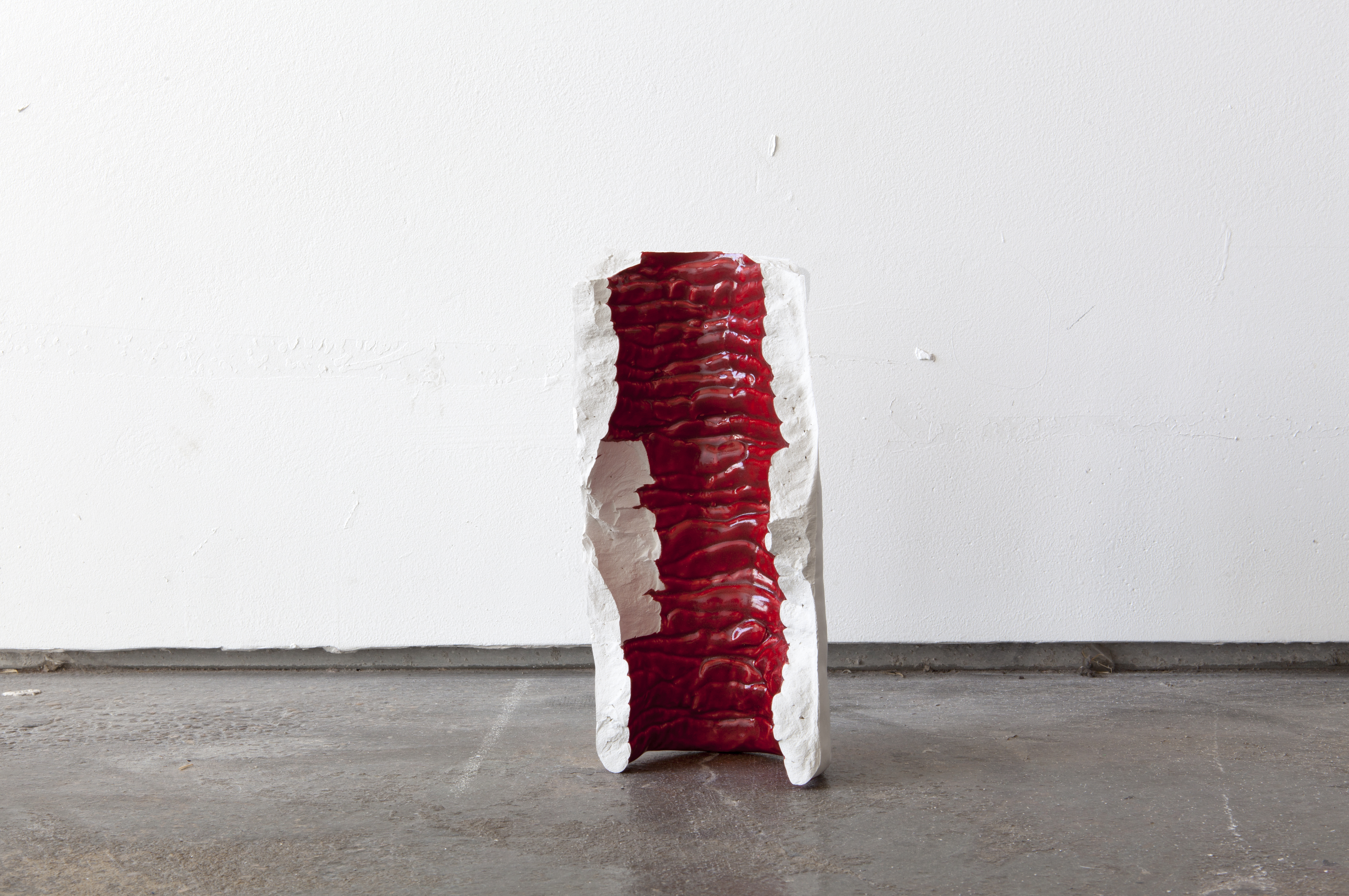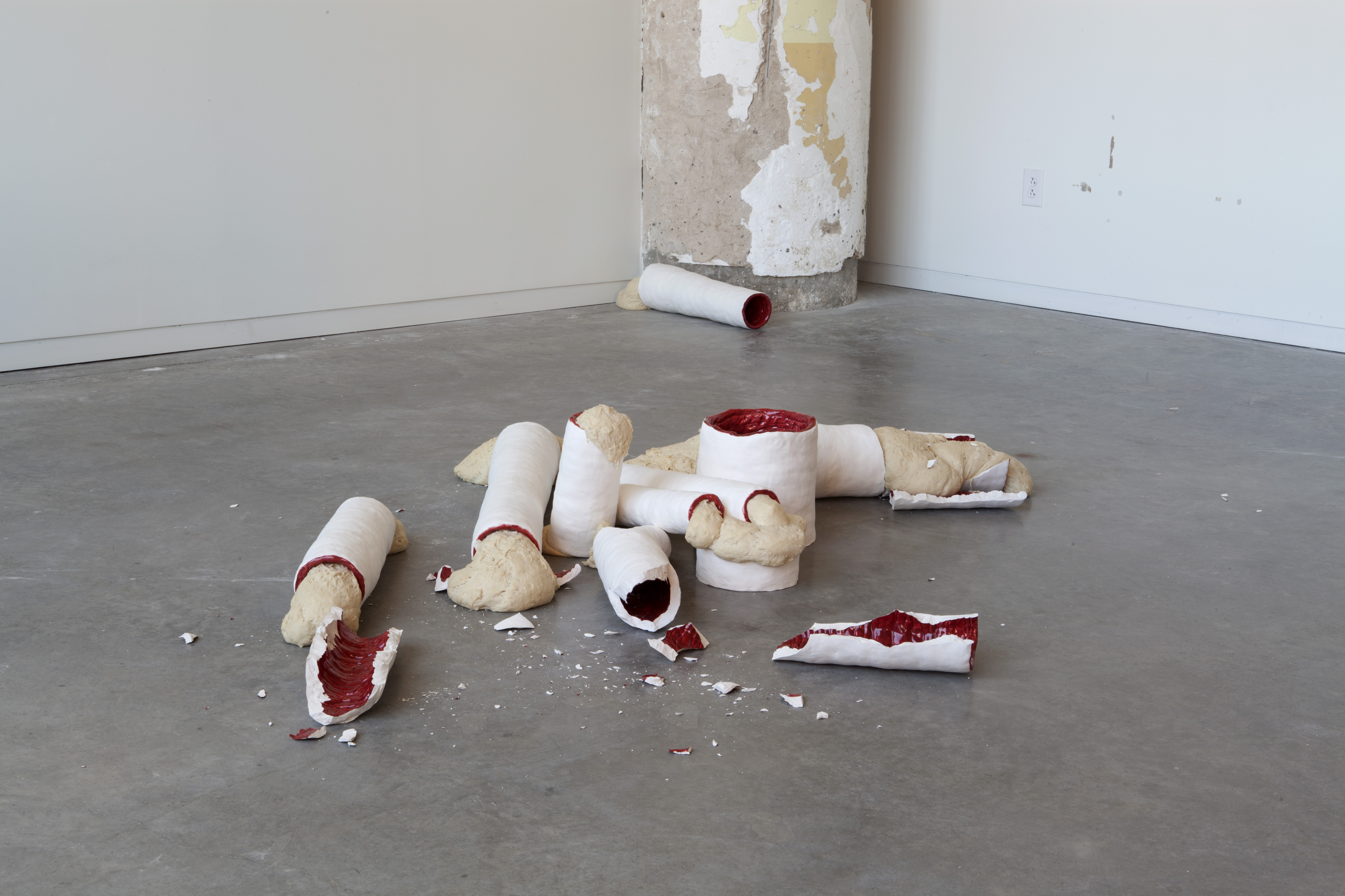 What remains post performance. Sculptures with stains. H 14.5" X Diameter 4.5"