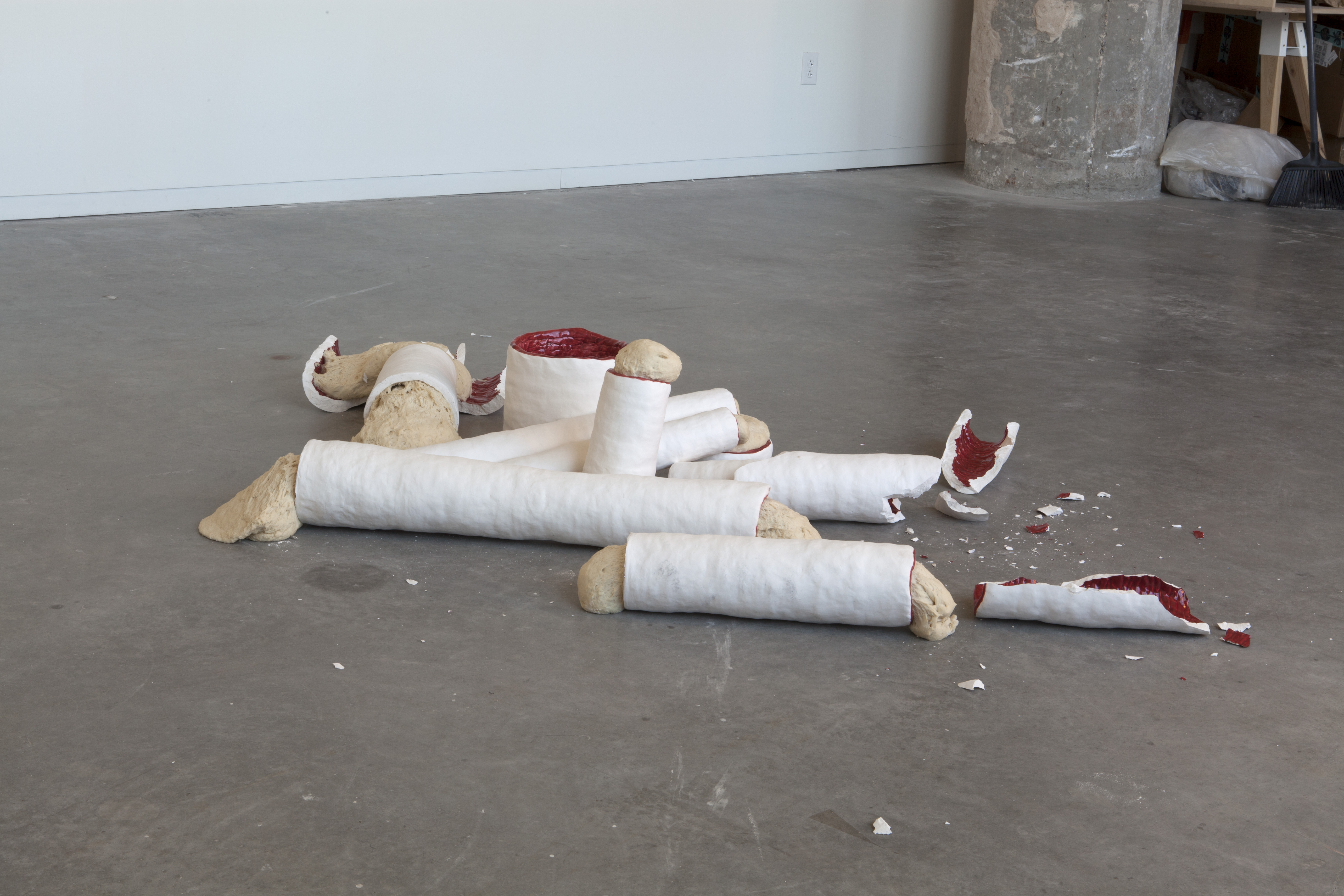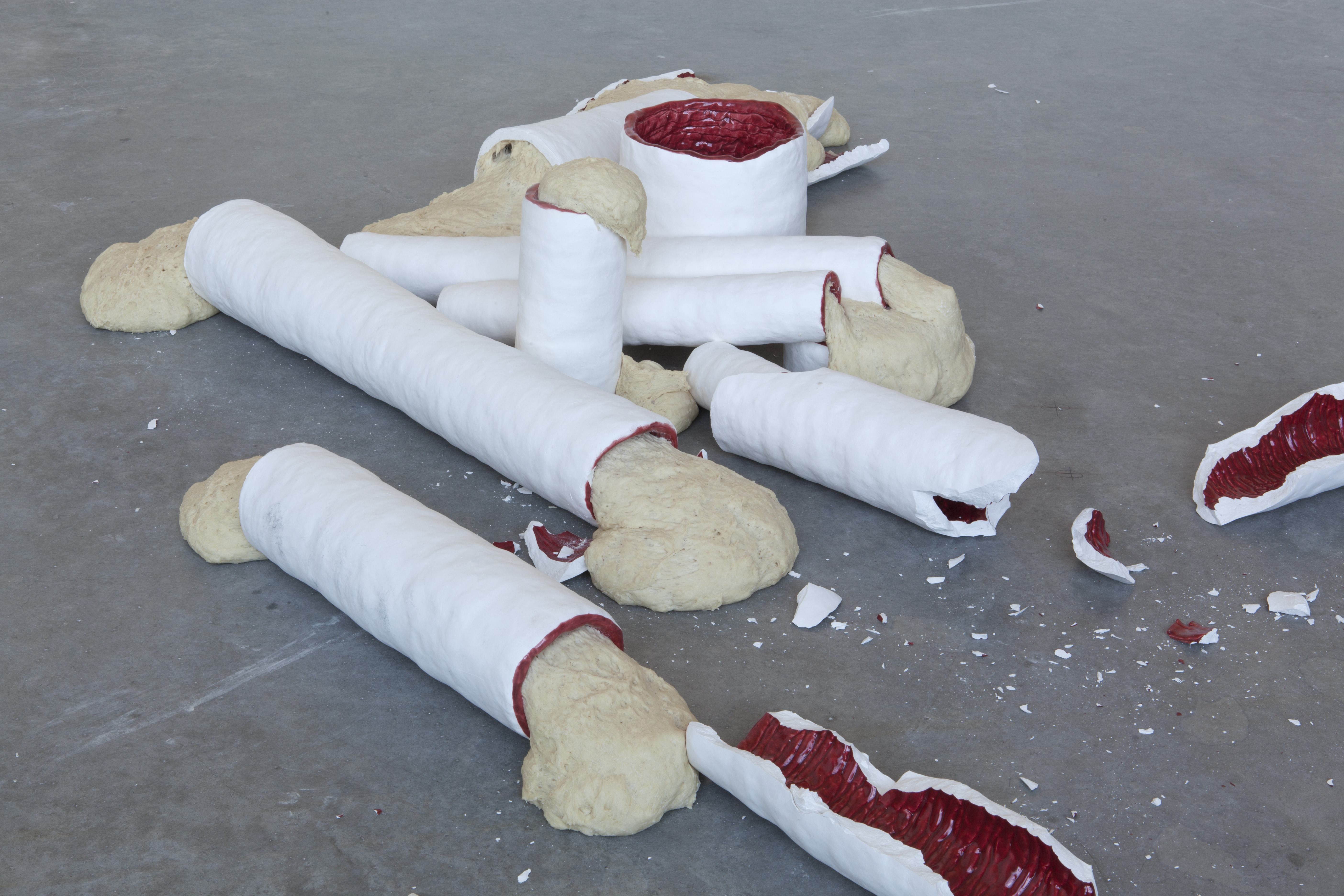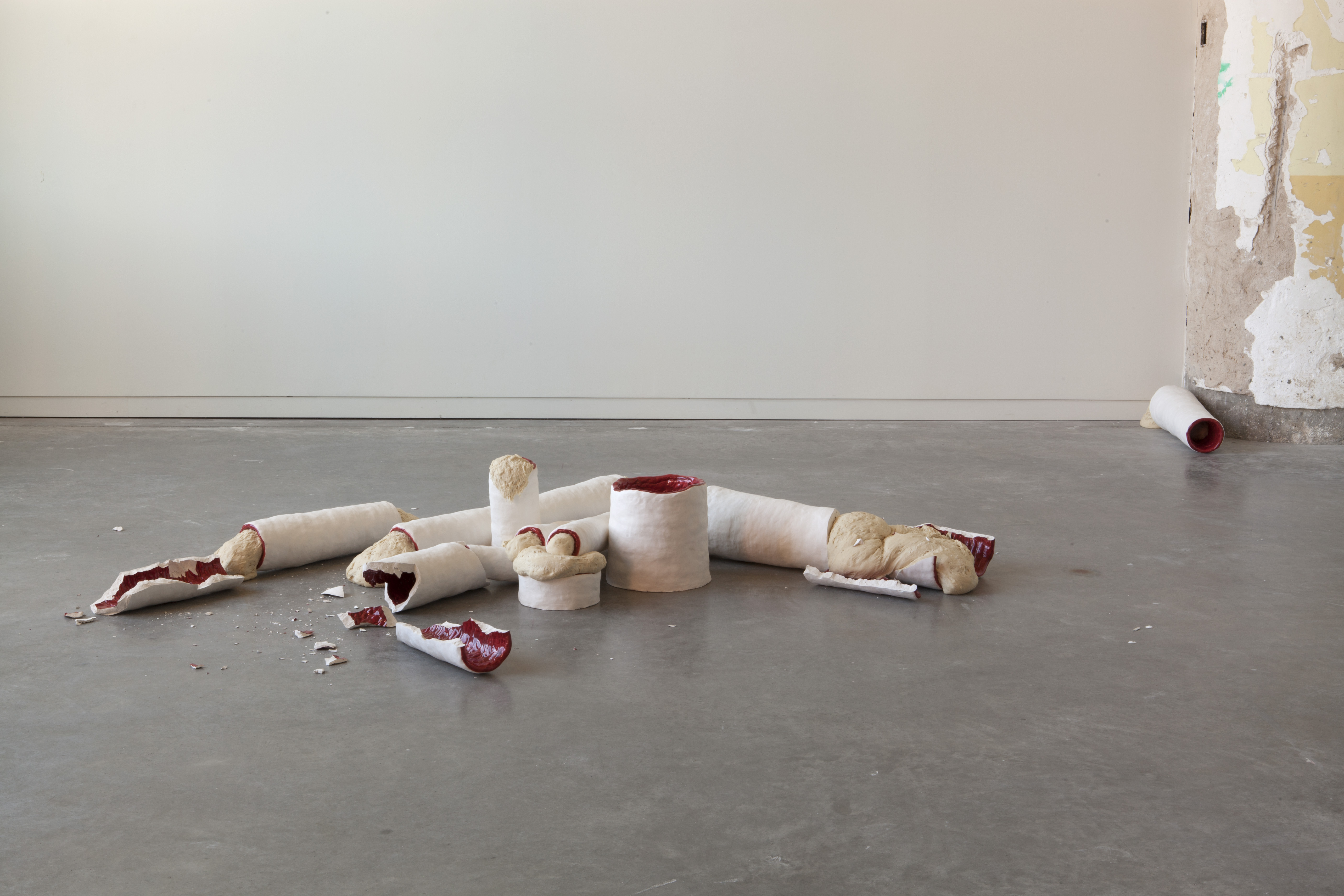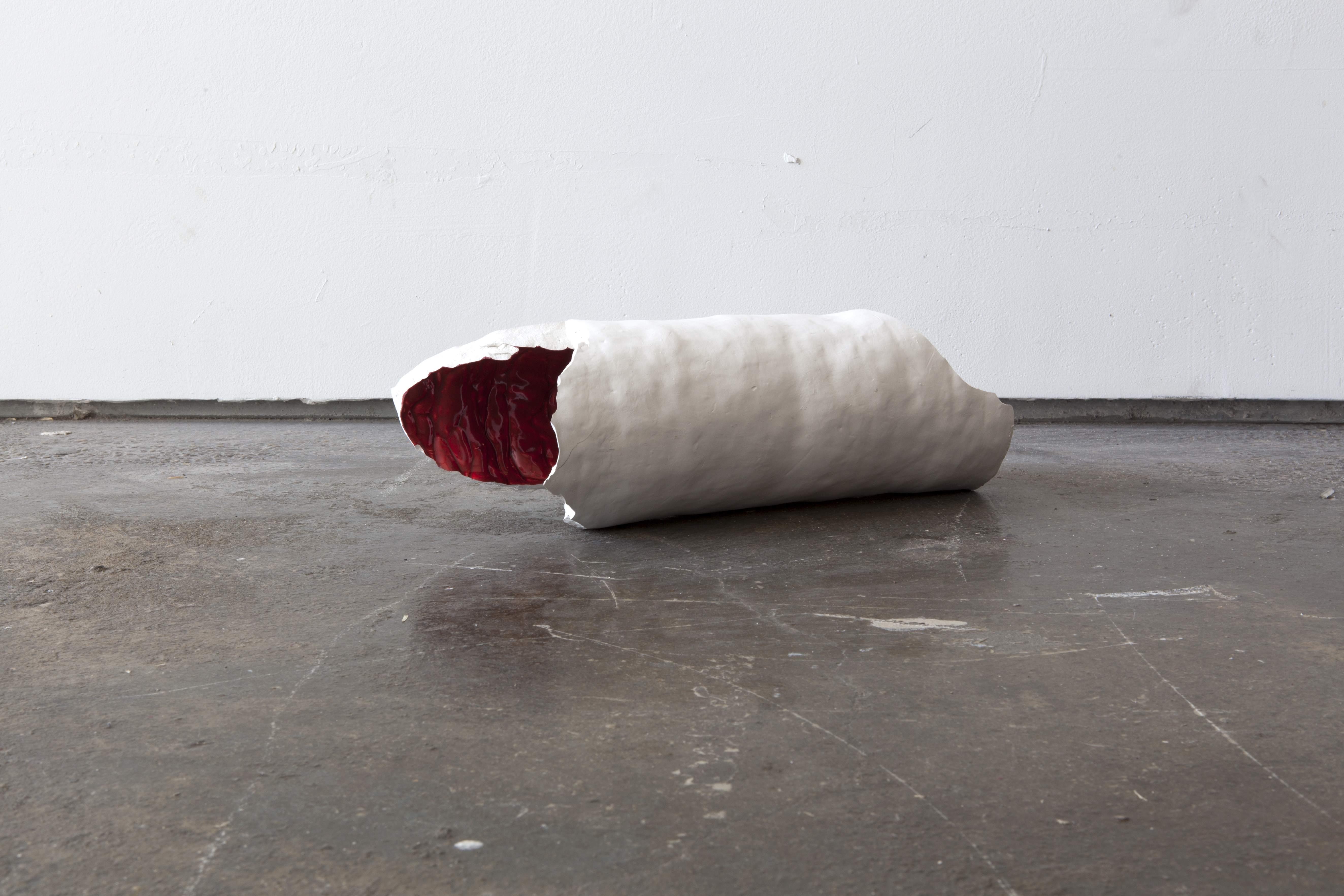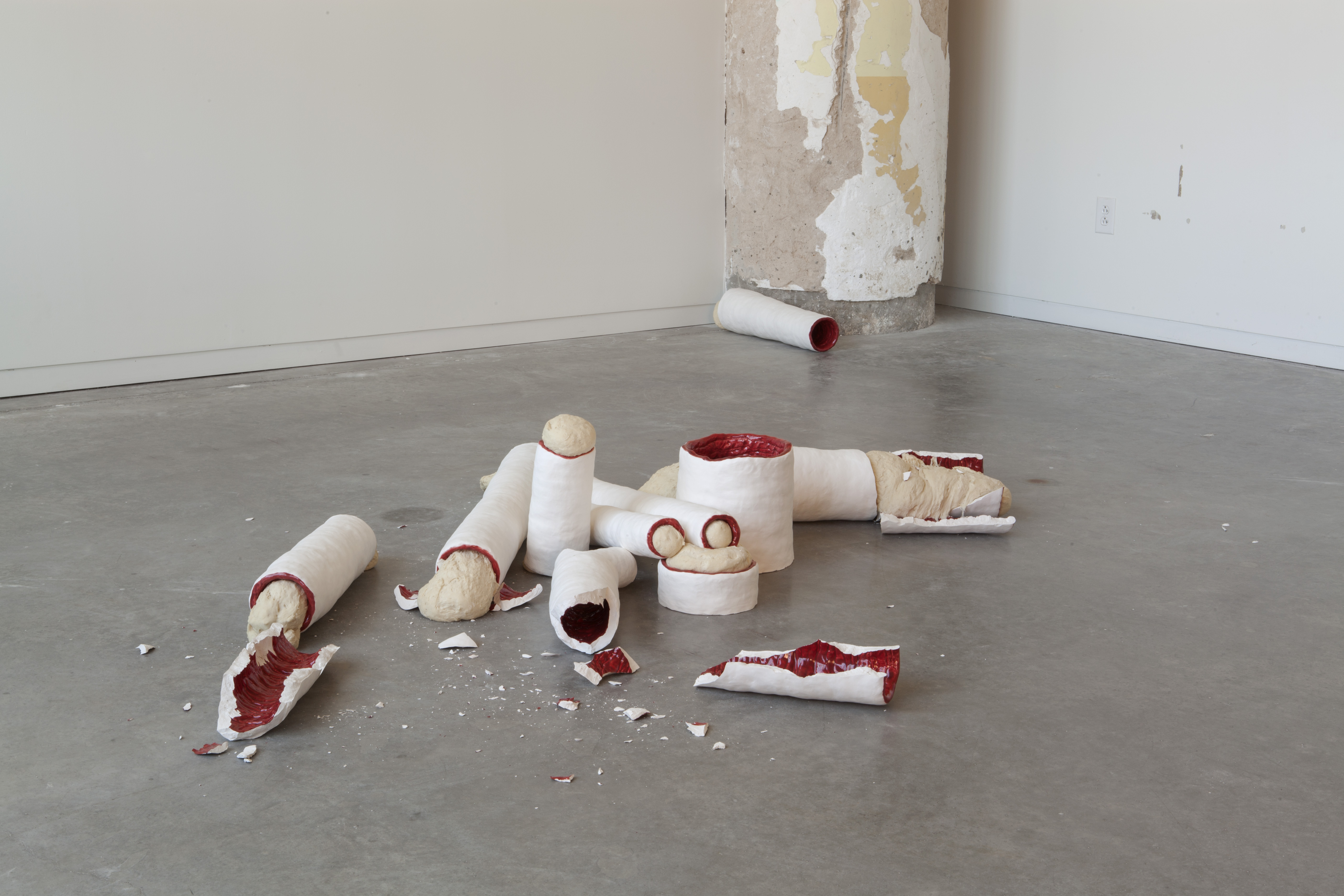 What remains post performance. Sculptures with stains. H 14.5" X Diameter 4.5"
