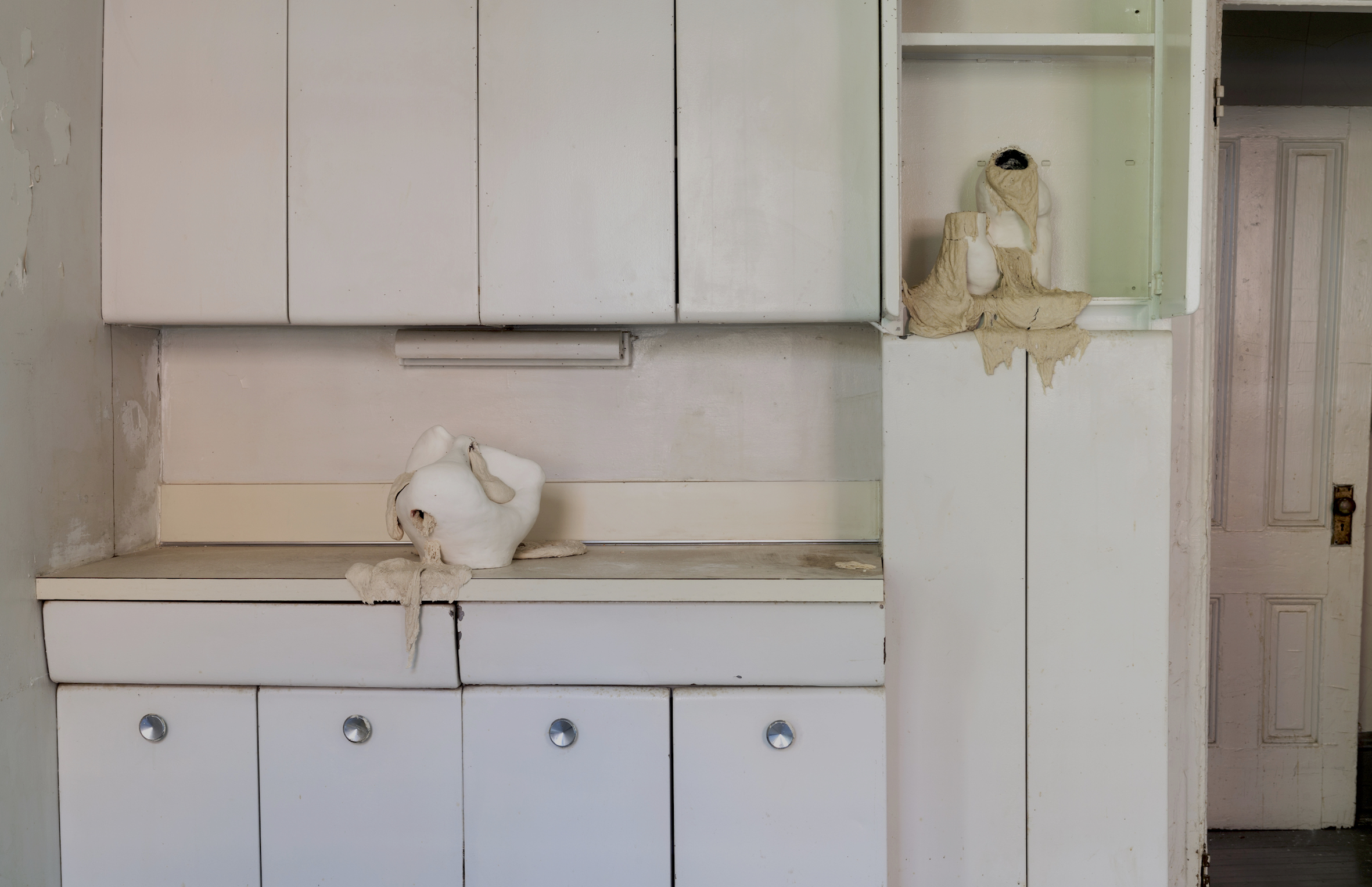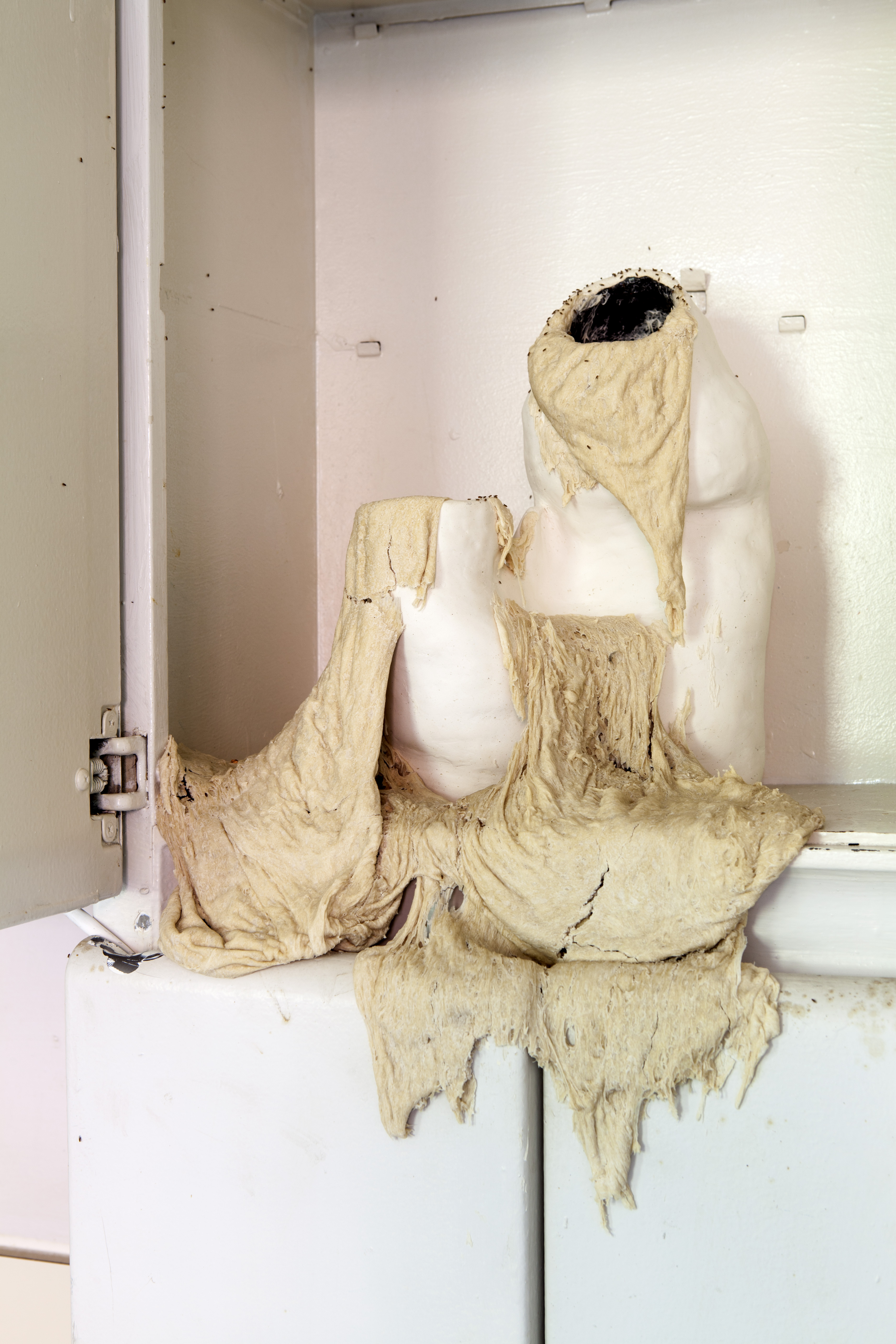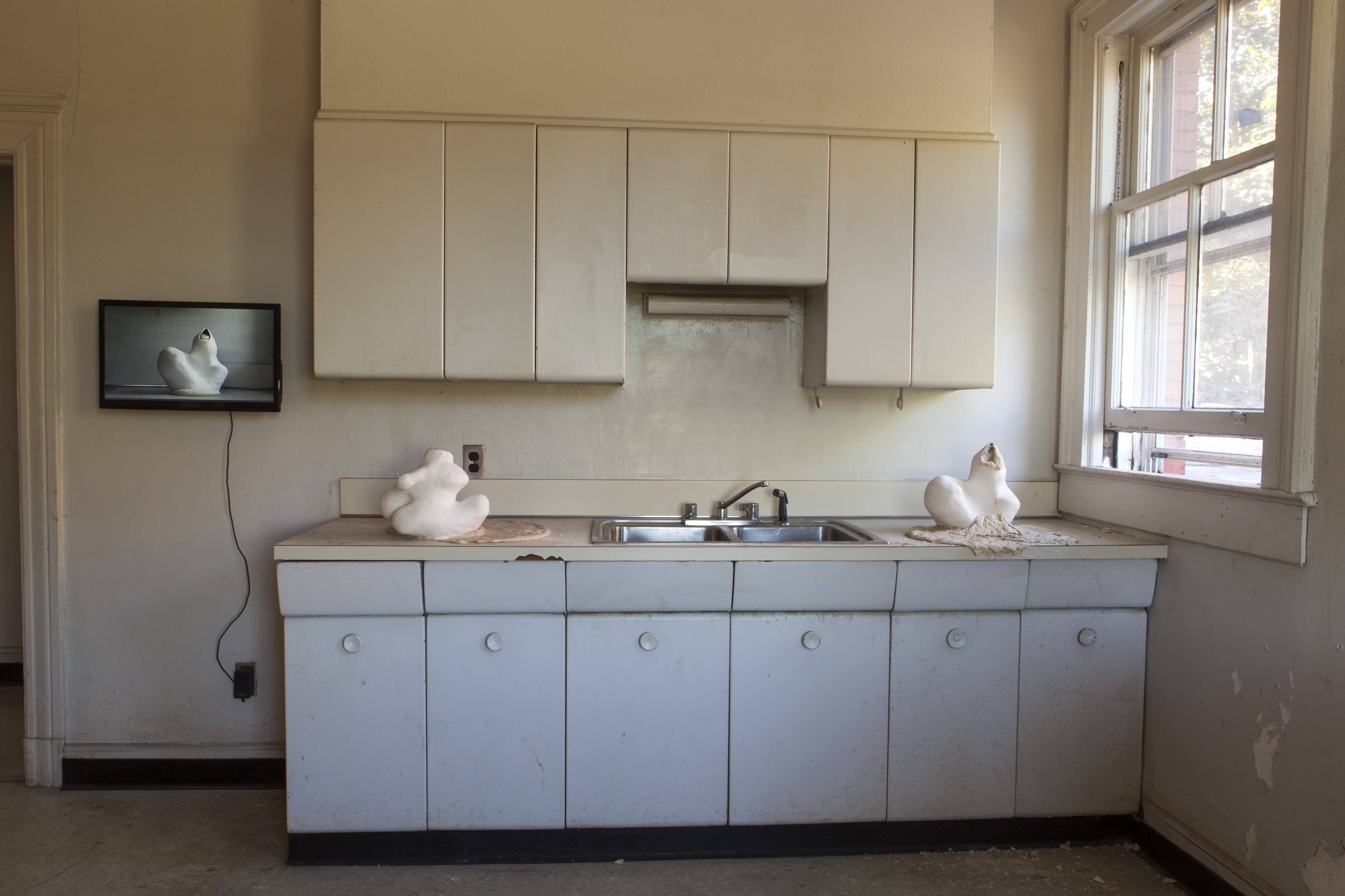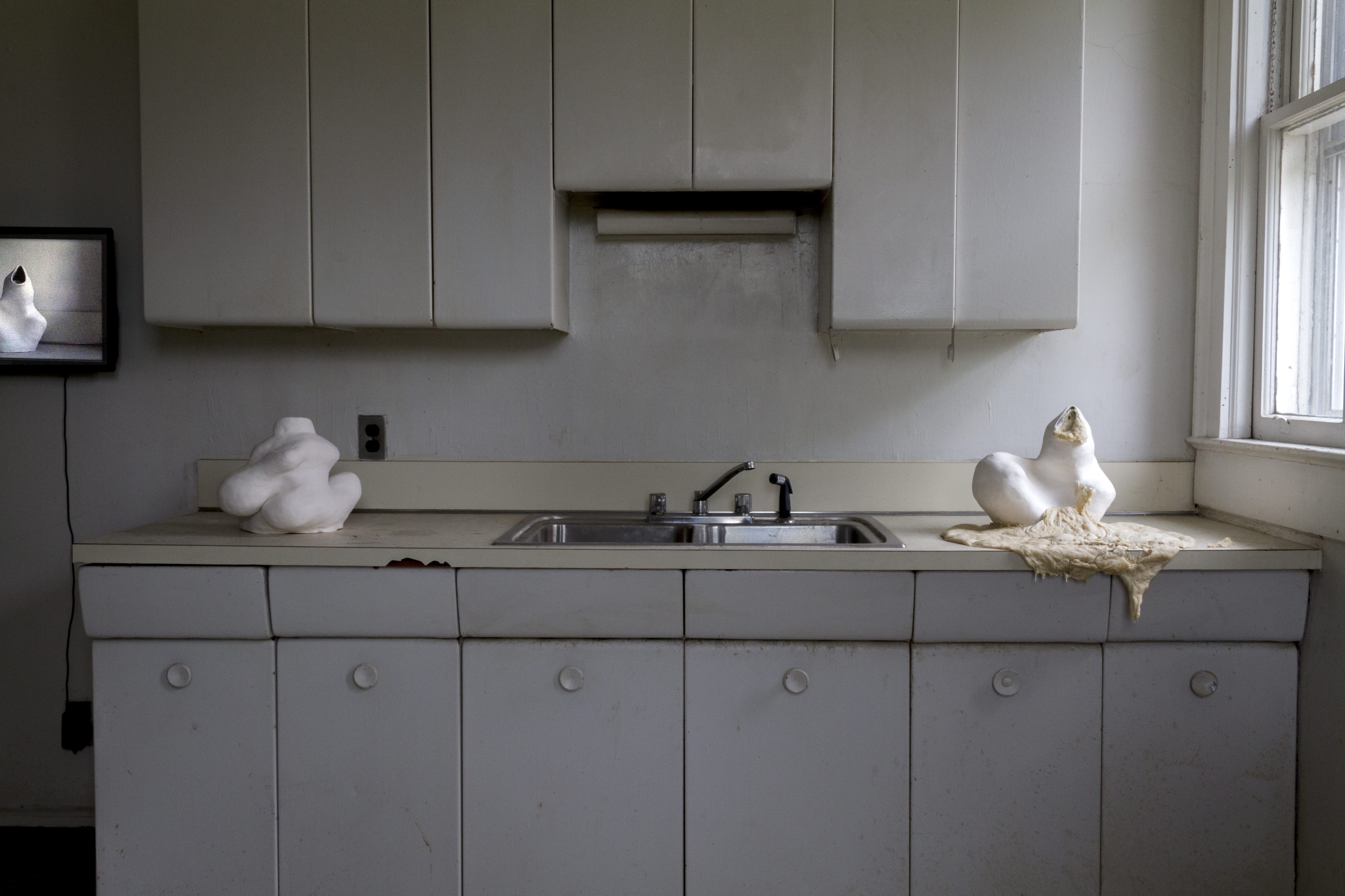 Amato’s work uses sensuality — of dough and of human relations — to seduce her viewer into a space that ends up being quite critical of its surrounding. The dough works seem to dominate both Amato’s practice, as well as her audience’s understanding of her work. It was not coincidental that the voluptuous sculptures utilizing the most traditional products of feminine domestic labor were put in the kitchen instead of a bedroom, attic, front porch, or living room. One is not assaulted by dough in the foyer or hall closet (though by the end of the fair one might be assaulted by the smell of the fermenting dough).