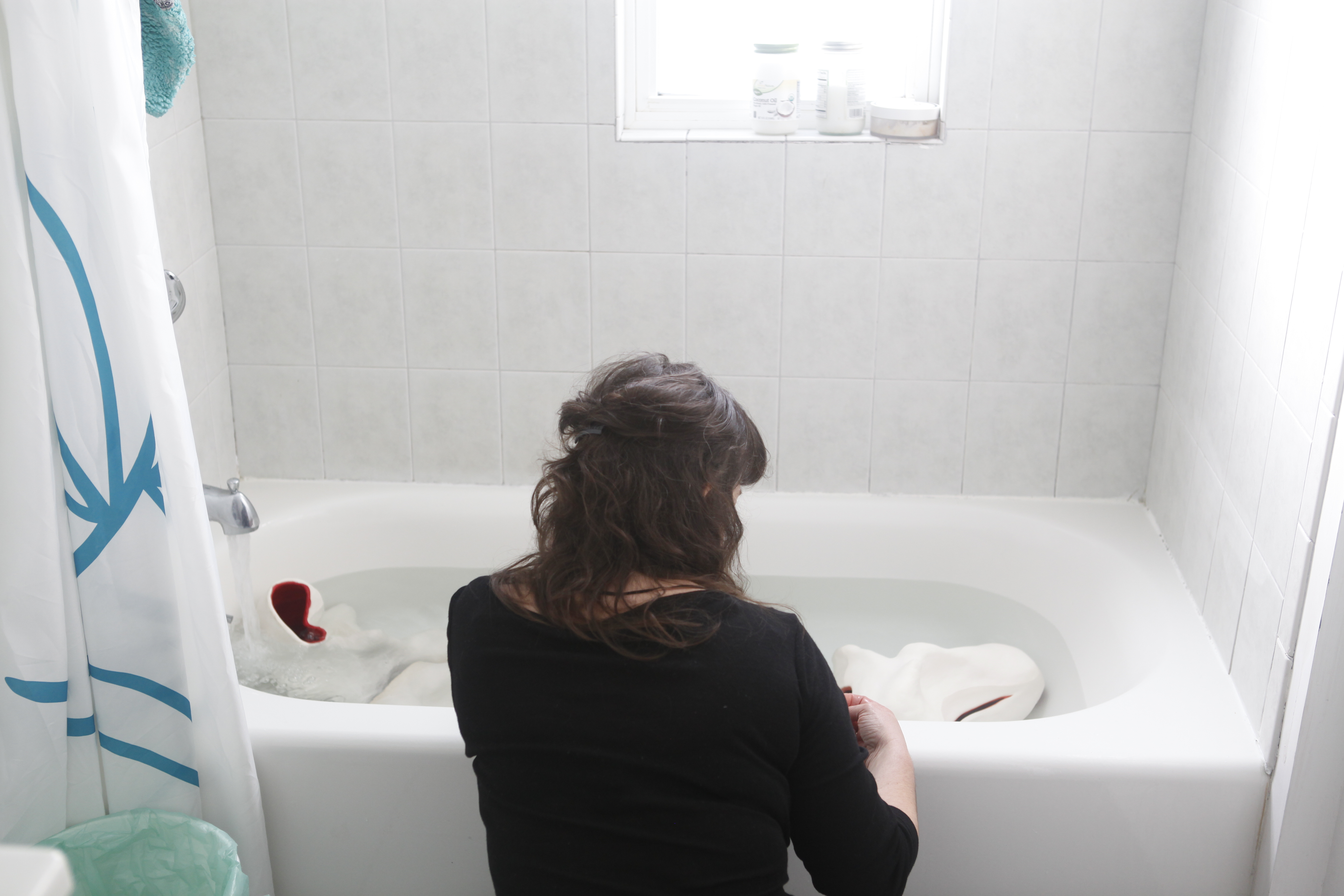 The paintings and video further question our assumptions of materials and human bodies. They echo the curves of the sculpture, the movement and color of the dough, while continuing to question what constitutes material, desire, relationships, hierarchies, identity, and self=determination. The writing scattered throughout the space is a direct response to the installation.