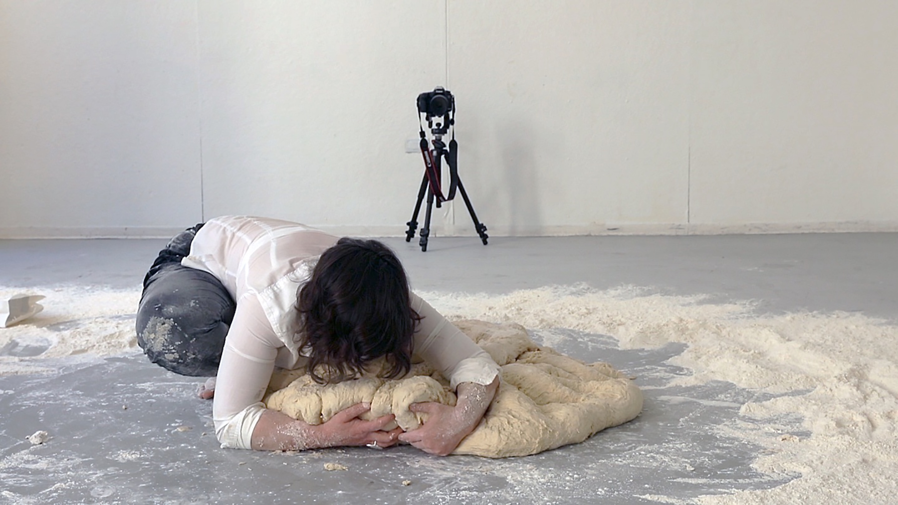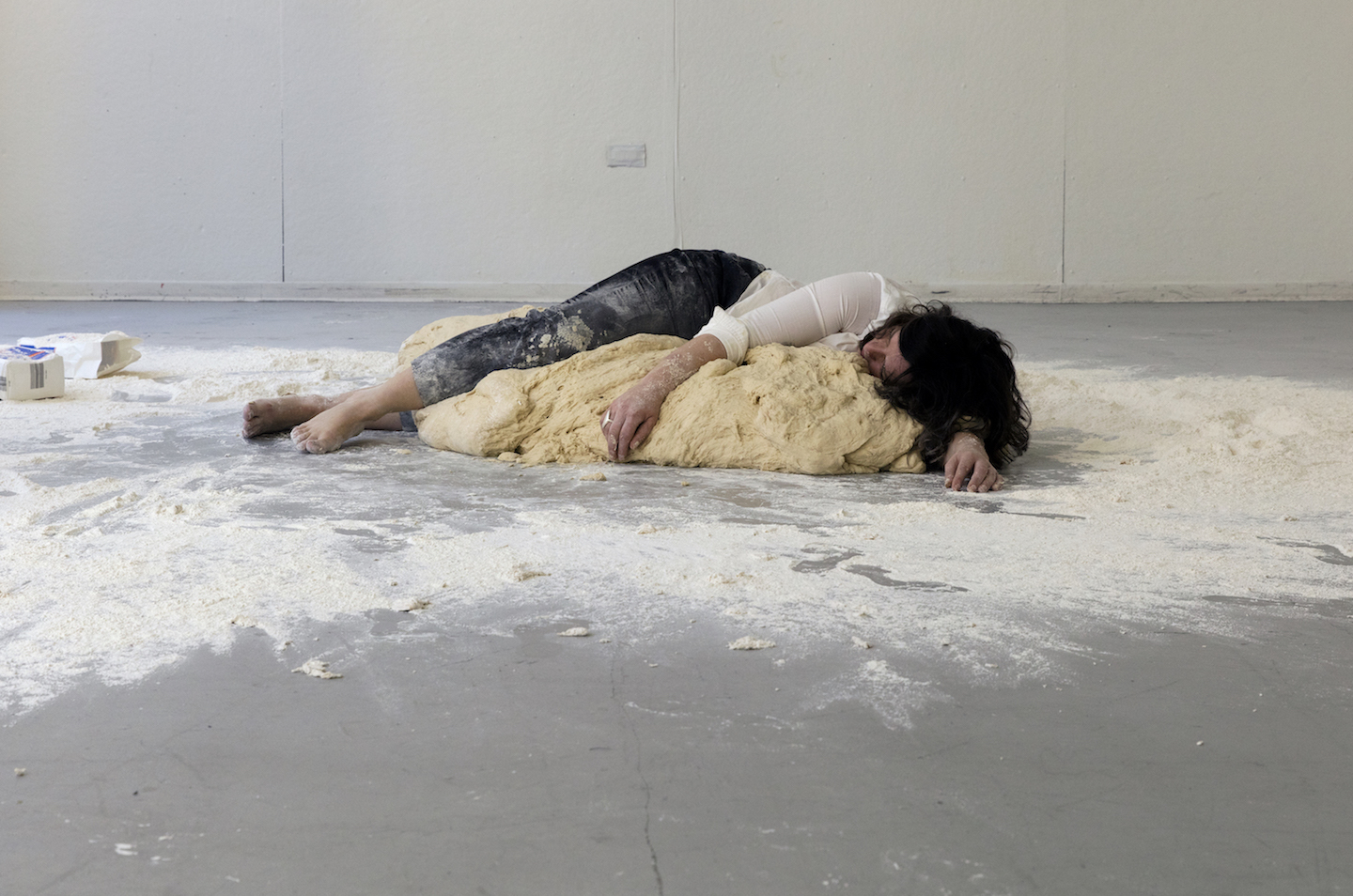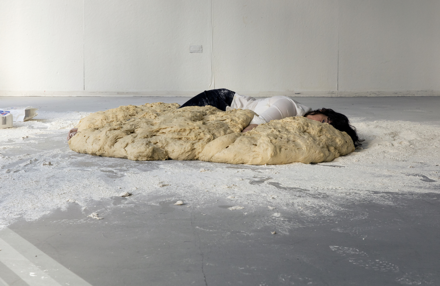 In this dough performance created specifically for video, Amato set up seven cameras to capture her attempt at kneading her weight in dough. The process was endured over an hour long single session and eventuated in the artist laying with her weight in dough over a further two hour period, captured using time lapse photography as the bread dough rose around and engulfed her body. Amato had to eventually pull away from the performance as her left eye was stinging and her second nostril was about to be consumed by the dough, preventing her from breathing.
