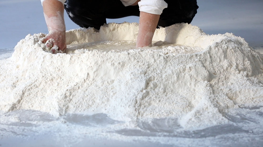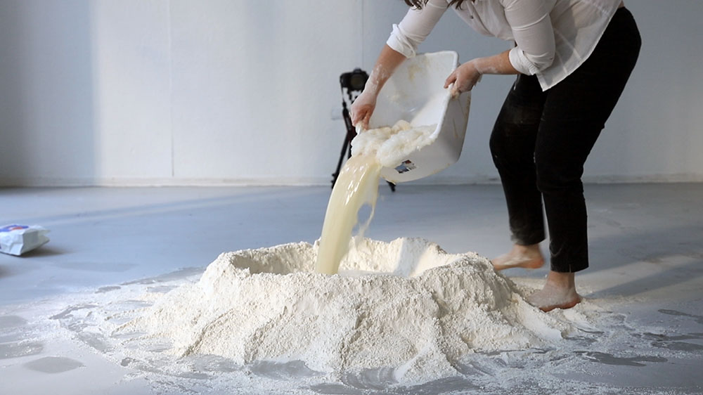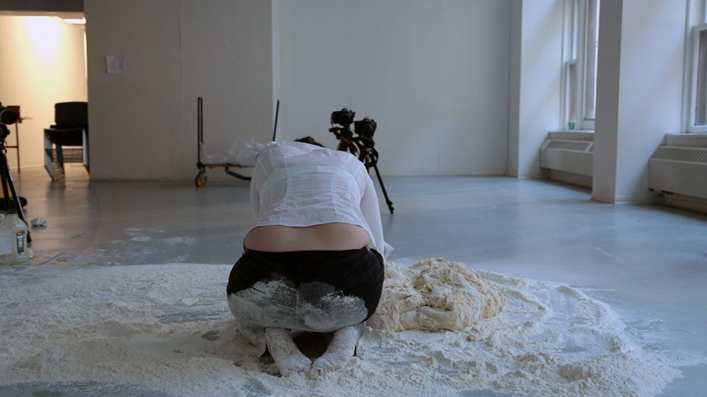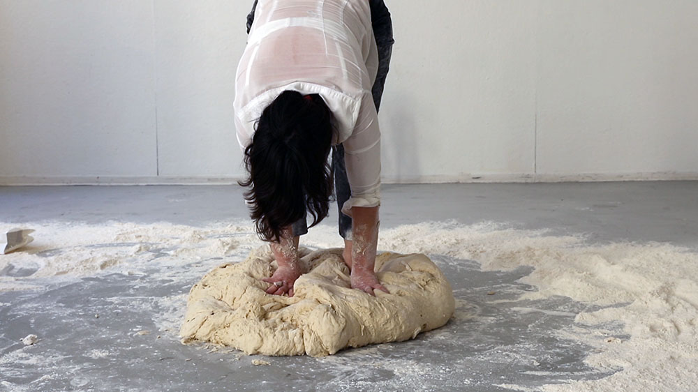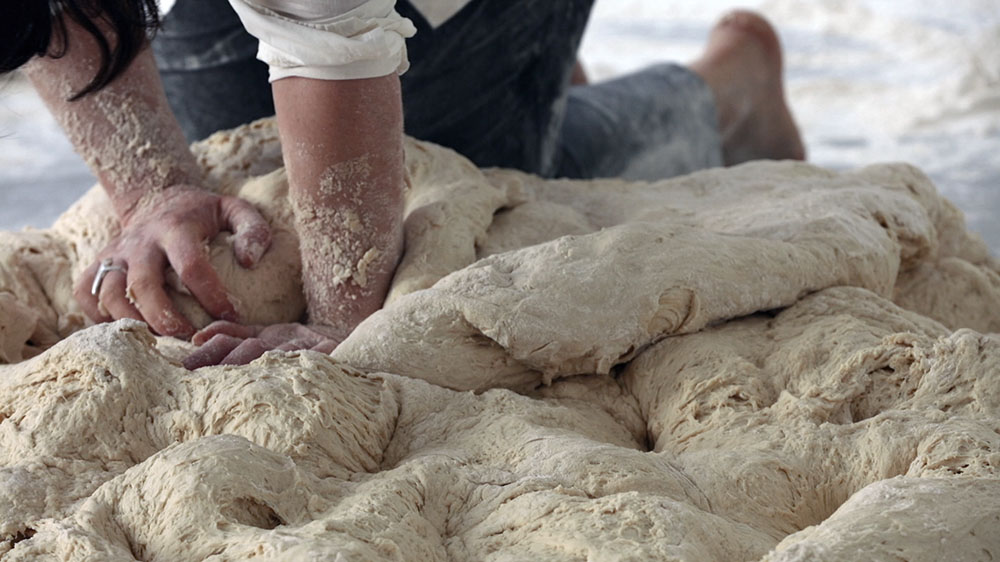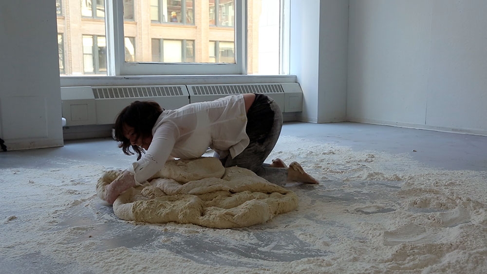 In this dough performance created specifically for video, Amato set up seven cameras to capture her attempt at kneading her weight in dough. The process was endured over an hour long single session and eventuated in the artist laying with her weight in dough over a further two hour period, captured using time lapse photography as the bread dough rose around and engulfed her body. Amato had to eventually pull away from the performance as her left eye was stinging and her second nostril was about to be consumed by the dough, preventing her from breathing.